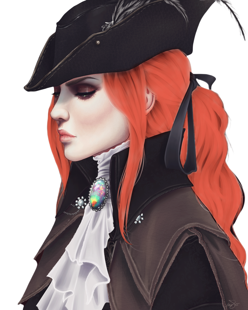 На плечах Евстолии, красуется плащ, тот на столько идет девушке, подчеркивая её утонченную и красивую фигуру. Что можно сказать, тоже заказной. В голову закрадывается впечатление, что та из высокого рода. Это действительно так и есть. Дорогой наряд ужимается на тонкой гусиной талии, подчеркивая аккуратную грудь. Тем служит кожаный, черный ремень с серебряной бляхой. На том красуется миниатюрная сумочка для мелочи и петли на пуговицах, которые надежно удерживают именной нож и пистоль. Ниже взгляд упирается на упругие бедра, на которых виднеются зауженные штаны, те не имеют каких-либо карманов. Еще ниже, бросаются в глаза аккуратные икры, которые на половину прикрыты вычищенными сапожками. Те хорошо подходят по размеру маленькой ножке. На бляхе одном из тех, красуется похожее темное перо. Что плотно зажато у основания черной ленточкой.