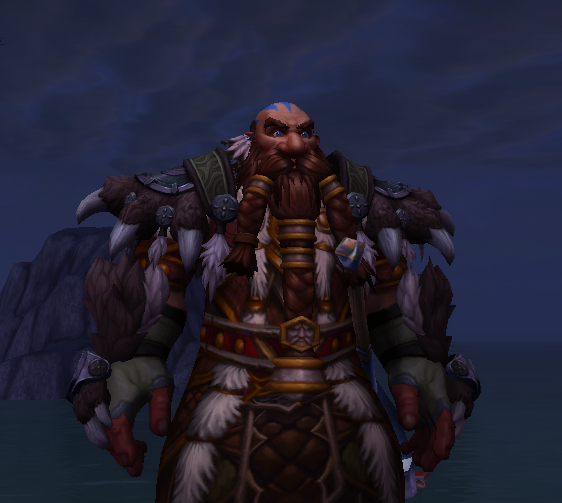 Дворф обладает сильными и мощными руками, которыми он мастерски обращается с оружием. На всей длине его рук видны тонкие резные татуировки с синим пигментом, символизирующие его приверженность шаманизму и связь с духами стихий.