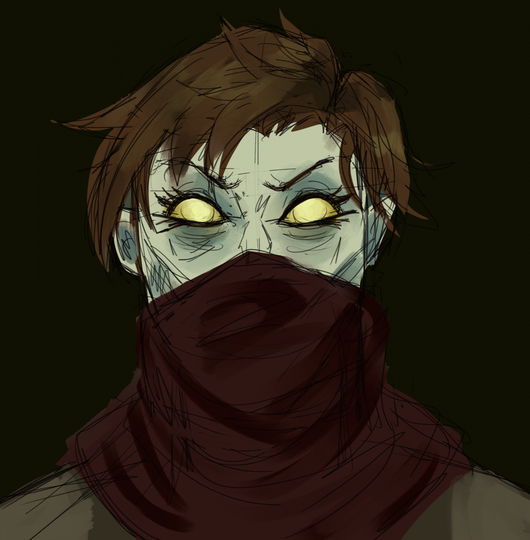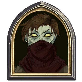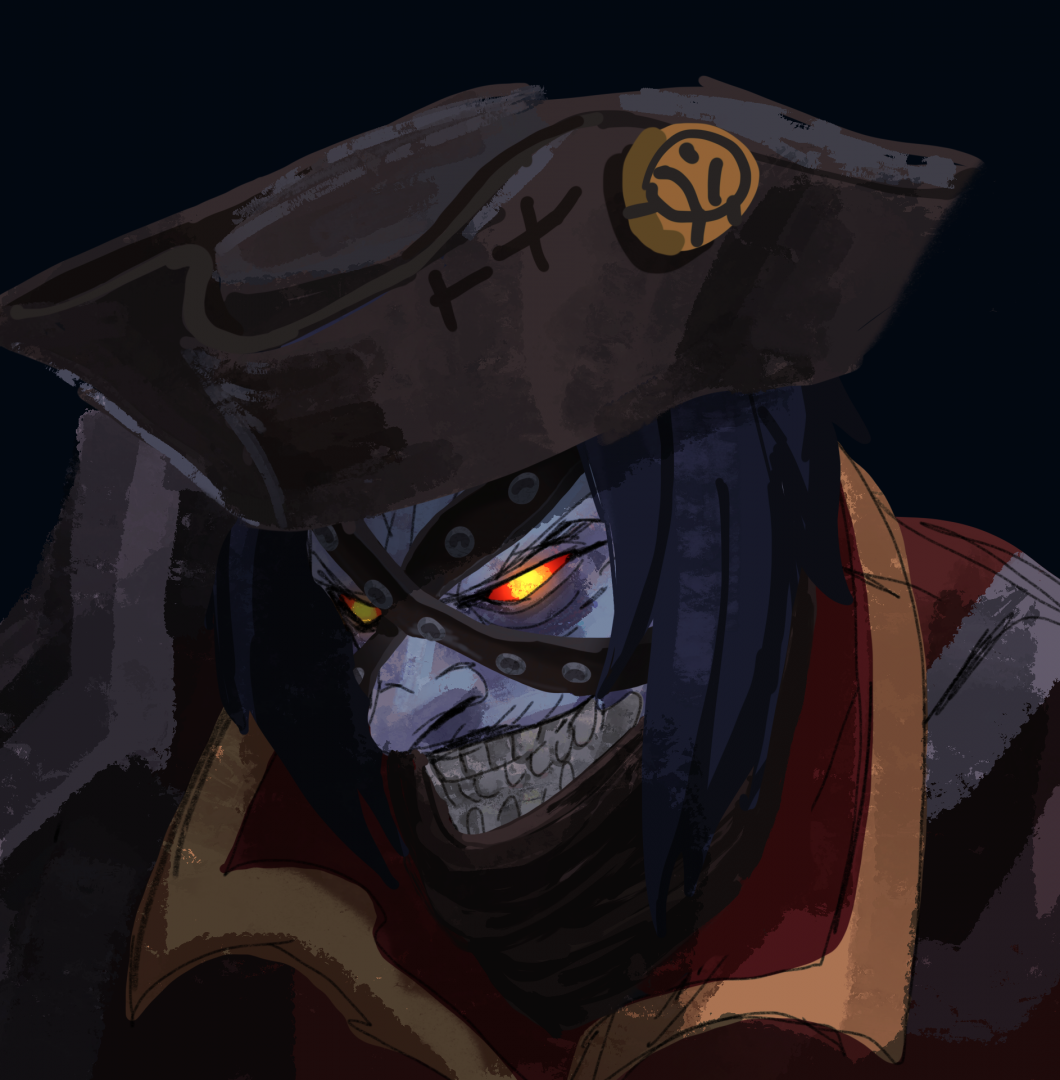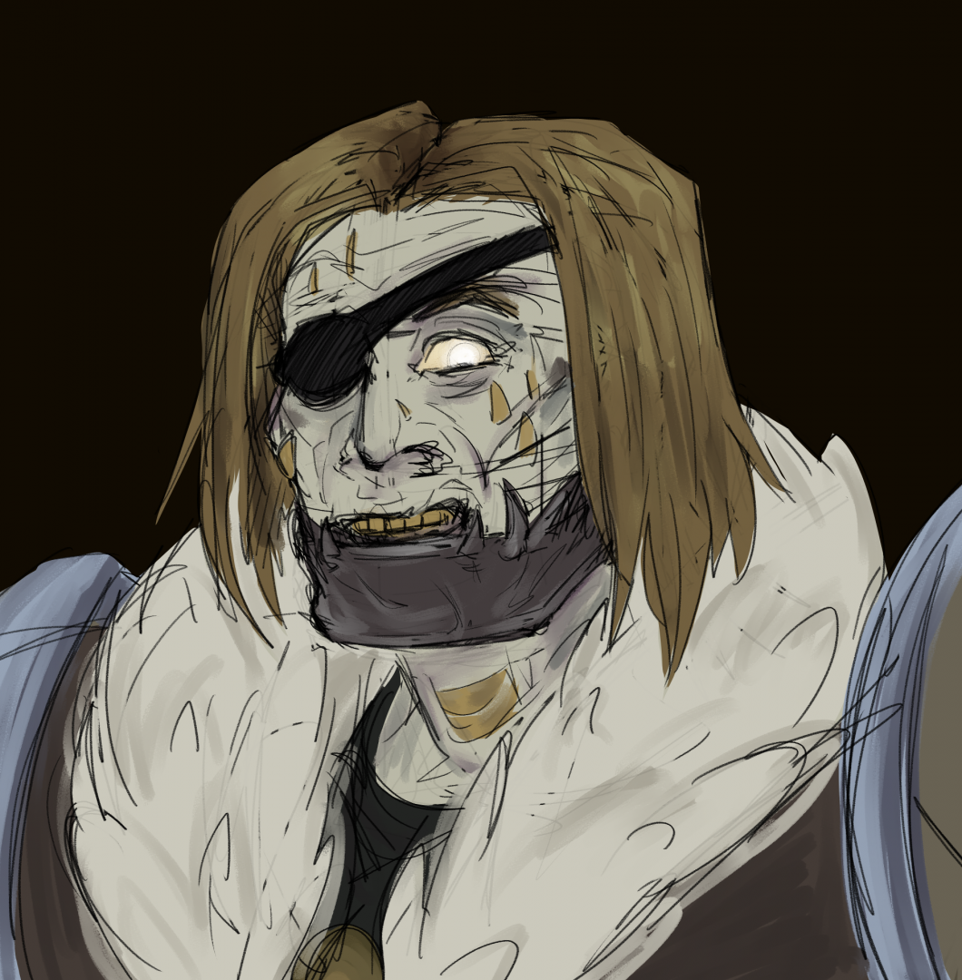Фигура выше среднего для человека роста, мужская, немного сгорбившаяся в своей походке, хромая на правую ногу, не самая приятная на вид, но вполне симпатичная для отрекшихся. Потертая темно-коричневая треуголка, слегка рваная в паре мест и небольшим позолоченным круглым значком довольно отлично сидит на голове мужчины, покрывая длинные до плеч, черные как смоль солоноватые тонкие волосы, закрывающие его уши. Лицо фигуры с кожей пурпурно-синего оттенка, на вид сухой, раскрашенное шрамами, морщинами и впалыми щеками, держит на себе два перекрещенных друг на друге черных тонких кожаных ремня с металлическими заклепками. Они отнюдь не мешают паре ярко-красных, горящих иногда во тьме глаз с темно-фиолетовыми мешками под ними разглядеть, кто же сидит за столиком, к которому он направляется, да и взгляд сам по себе в какой-то мере у мужчины хищный. Коричневая маска, скрывающая до этого момента остальную часть лица, спускается на шею. Довольно широкий нос тоже не обделен вниманием шрамов, чего не сказать про рот да и в принципе челюсть фигуры, особенно нижнюю, где кожи было намного меньше. Однако кто-то из его знакомых мог помнить, что раньше, при жизни, у него были ухоженные борода и усы. Какие-то зубы прогнили, а какие-то и вовсе оказались проржавевшими гвоздями, специально подпиленными до остроты, способные разорвать и плоть, и ткань.