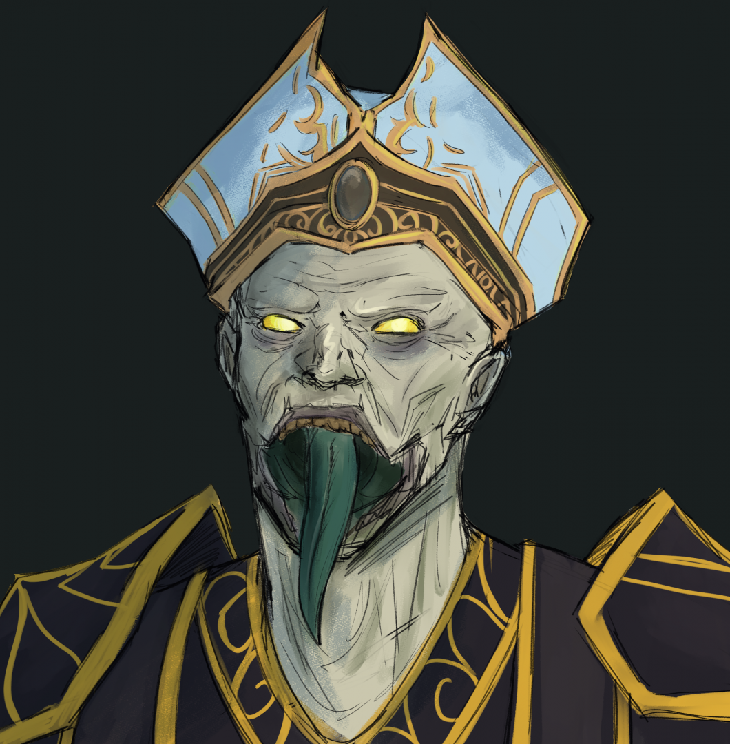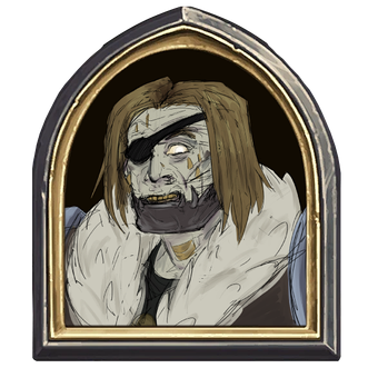 Красный камзол с позолоченным, истертым воротом и позолоченными пуговицами, черными длинными рукавами хорошо подчеркивает его глаза. Под ним виднеется темная льняная рубашка, возможно, для большего удобства. На удивление, одежда находится куда в лучшем состоянии, чем сама фигура. Руки у мужчины все еще крепкие на вид и на дело, но в районе локтей мясо и мышцы на них отсутствовали, показывая белые кости, ровно как и у ног в районе коленей. Кожаные перчатки с парой ремешков покрывают кисти мужчины, где из них прорываются острые костлявые пальцы. Увы, никаких колец они не имеют, а те бы отлично подошли. Спину, из которой выглядывает позвоночник мужчины, прикрывает темный плащ, слегка рваный и пыльный, с видимыми швами от попыток его заштопать, в самом низу.