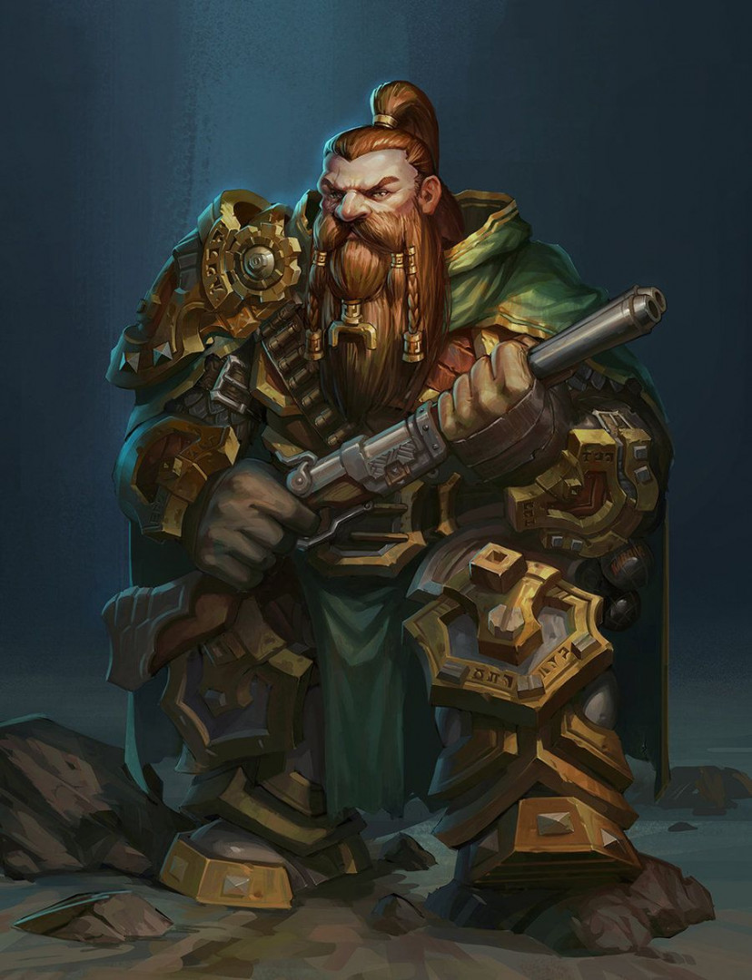 Дворфа, чаще всего, можно встретить одетого в кожаный доспех, сочетающий в себе элементы одежды горного пехотинца, стрелка Армии Стальгорна и члена Лиги Исследователей. На нем всегда его зеленый плащ и накидка, покрывающие его спину и торс, а также круглые очки-гоглы, защищающие глаза от горящего, в огнестреле, пороха.