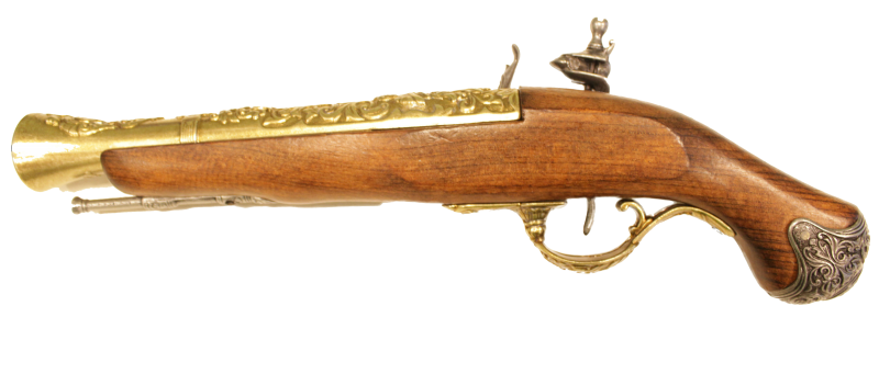 На поясе у него обычно висит тяжелая абордажная сабля, а за полой плаща, заткнутый за тот же кушак, находится пистоль.