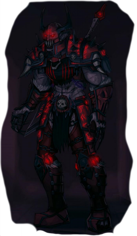 Уродливая и высокая гора мышц плетется по залитому кровью и усеянному трупами зданию. В руках этого едва ли имеющего форму существа клинок и внушительный шипастый щит, который порою чаще служит ему вторым оружием, нежели средством защиты. Фигура облачена в доспехи, что размерами, само собой, нисколько не уступают носителю. Массивные, алые и усеянные черепами, сделанными также из металла и носящими, по сути, лишь декоративную, эстетичную функцию. Также за ней волочится бардового цвета плащ. Шлем имеет бивни, с которых капает кровь. Видимо, воитель использовал их в бою или же во время жестокой расправы над наглецом, возжелавшего напасть на это создание или же попросту вставший у него на пути. Пускай этот «рыцарь» и носит латные доспехи, но явно пренебрегает ими часто, ведь оголены руки вплоть до предплечья, но имеются и металлические массивные перчатки. Также лишен защиты испещренный мускулами пресса и шрамами живот. Амбал приближается и заносит клинок над последним человеком, что до последнего надеялся пережить эту бойню. Одновременно он и клял незнакомца, и молил его о пощаде. И в следующий момент клинок оказался в перевязи, ибо имел столь причудливо неестественную форму для меча или даже сабли, что так и не нашел себе пристанище в виде ножен.Крепкая рука резко хватает человека за шею и приподнимает примерно над землей высотою в метр. Вторая рука, ранее державшая щит, стянула шлем с головы, перед этим сдернув ремни, что держали его на голове существа, явно не желавшего носить ни койф, ни что-либо ещё под шлемом.