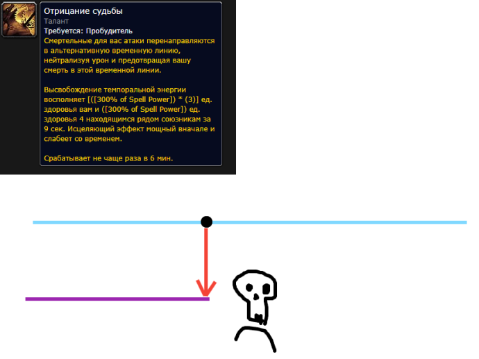 брать за базу хрономантии настоящие теории из реального времени, то бишь относительности и квантовую физику и правильно и не очень верно. правильно, потому что, лол, метелица и лороведы метелицы явно в курсе за эти теории и смотрели тот же интерстеллар и назад в будущее, чтобы брать за основу логику реального мира, пытаясь объяснить законы мира для очкастых нёрдов вроде меня, ОДНАКО, в ходе того, что время это конструкция ПОРЯДКА (см. ту же статью про время из который ты брал цитаты), а ПОРЯДОК это в том числе тайная магия, мы упираемся в то, что эта конструкция пусть и может работать по законам реального мира, но может быть податлива к магии, а если брать 10.1 — ещё и к музыке, что ставит ноздорму в один ряд с тональным архитектором кагренаком. могу быть слегка неправ, но с введением драктиров и, особенно, спека на хрономантии, близзы устроили какой-то шизофренический лор. формально говоря, раньше по сути доступные манипуляции со временем были в виде медленного падения и прочей лабутни, которая не шибко ломала лор с тем, что время должно быть нетронутым etc. ТЕМ не менее, взгляни на скилл ниже. мне кажется, убивать своего «квантового двойника» немножко (читай очень множко) ломает логику времени.