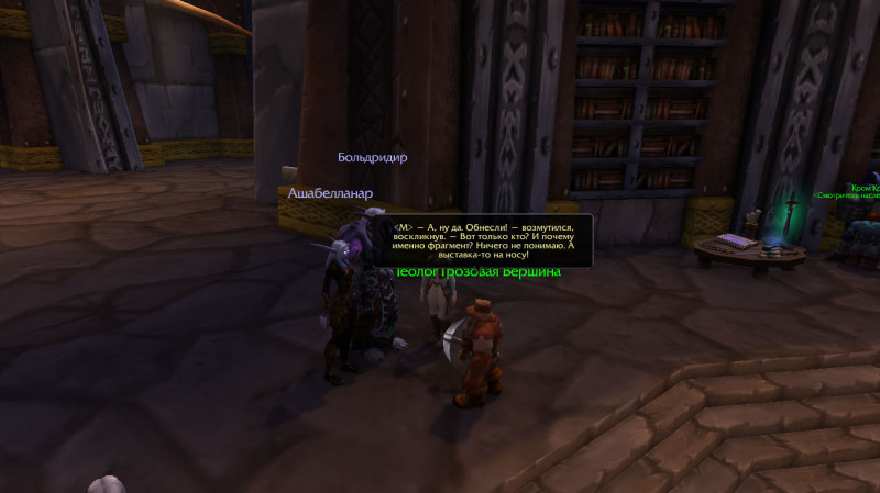 Вот и он — Величественный Стальгорн. Калдорай вышли из скоростного поезда наружу, прикрывая глаза он ярких бликов. Вокруг все такое чужое: лава, железо, удары наковальни, холодные стены и тугой теплый воздух. Эльфам пришлось найти сперва того, кто смог бы подсказать им, где они могут найти Зал Исследователей. Первые проходимцы угрюмо пробормотали что-то на родном им дворфийском, но, видимо, нашелся какой-то добряк, который подсказал чужакам дорогу. Доктор Скарлет Рэйвенвуд стояла прямо у скелета Щелкозуба, делая какие-то пометки в своем дневнике.