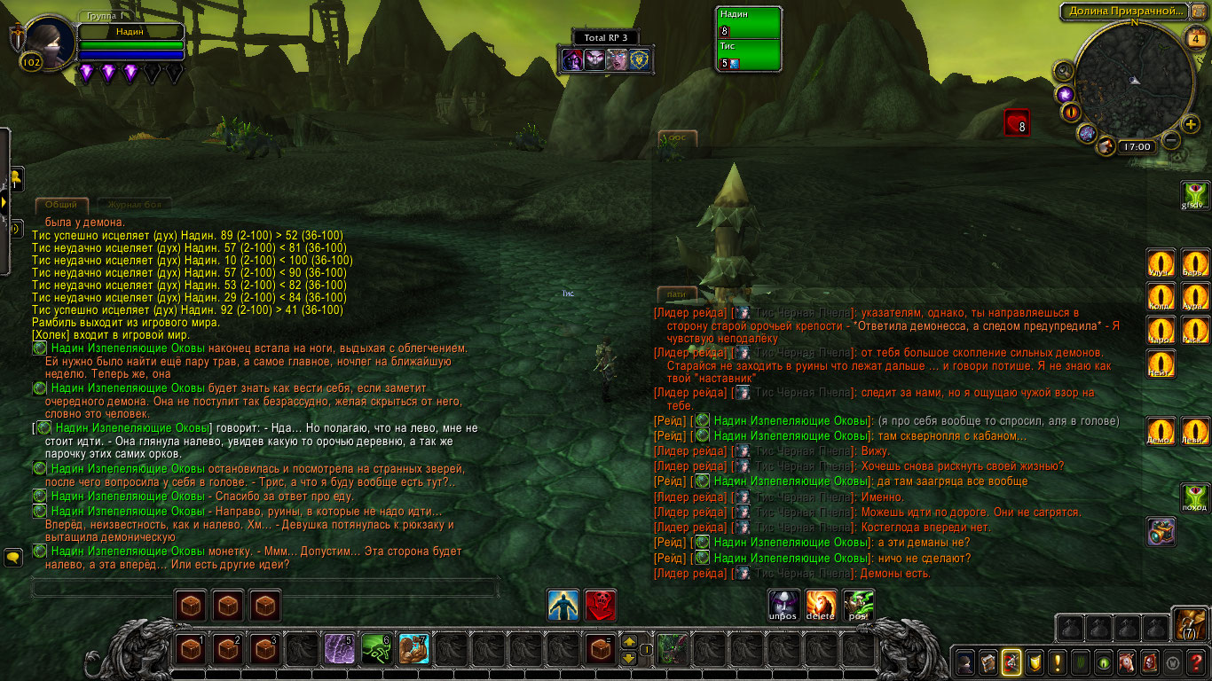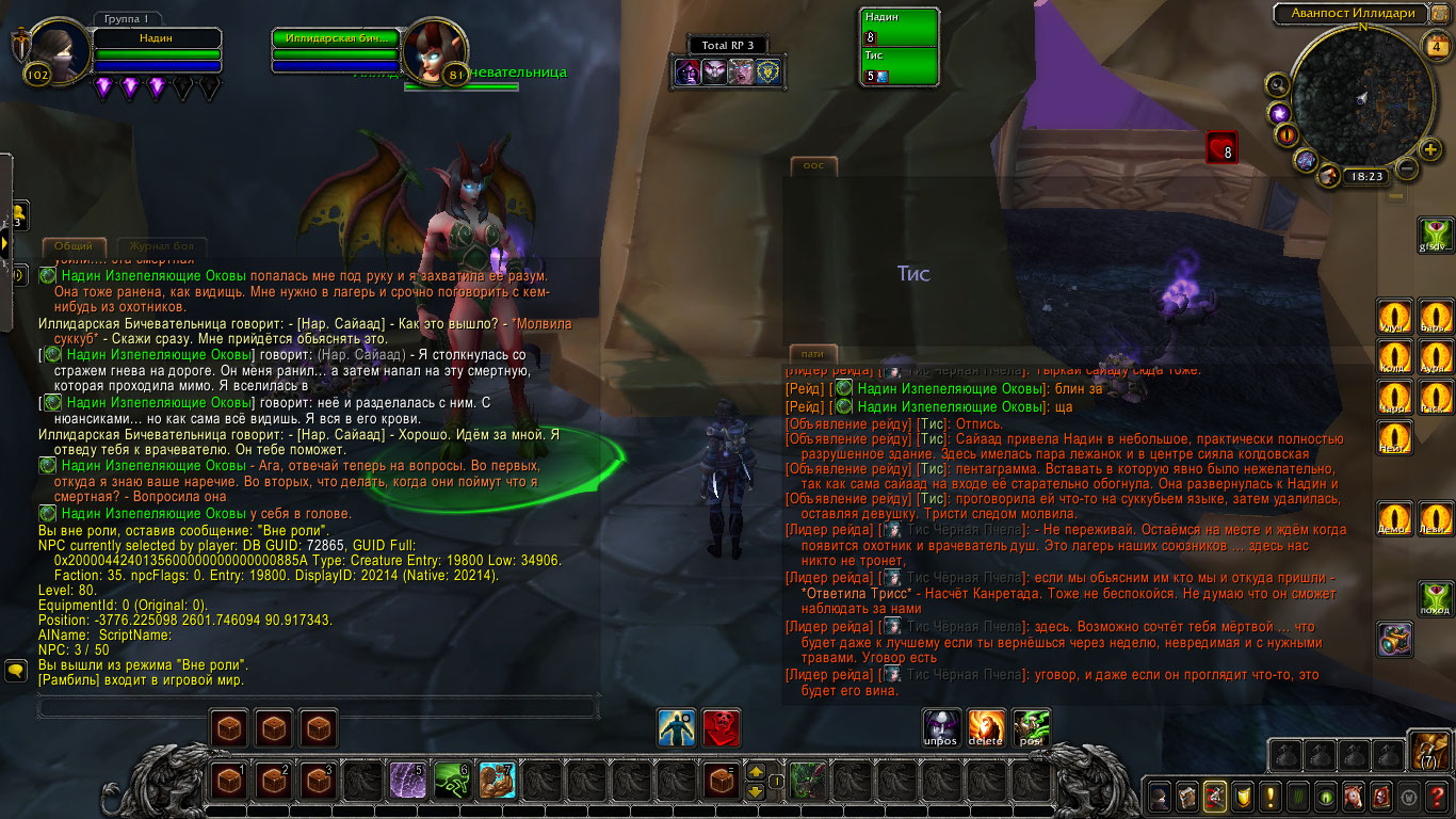 Опав на землю, Надин тяжело дышала и ей было трудно держать глаза открытыми. Цепляясь за жизнь своими остаточными силами, девушка под команду Тристи начала искать в подсумке демона любое средство, что поможет ей в критической ситуации. Камень Здоровья, который она тут же использовала оттянул смерть подальше от неё и дал шанс на спасение. Упираясь руками об мёртвое тело что с каждой секундой хладело, Надин кашляя продолжила рыться в сумке и искать хоть что-то. В цепкие руки попался ей занимательный фрагмент портального камня и горсть потрепанных временем монет Легионовского происхождения. Убрав найденное в сумку, девушка с трудом встала и направилась дальше, откашливаясь и приходя в себя от прошедшего боя. Адреналин покидал её тело, возвращая холодную рассудительность. Остановившись на перекрестке, Надин наблюдала тройную развилку. Демоническое чутье помогло Тристи обнаружить неподалёку демона, который был душою и сущностью роден сайааде. Указкой Тристи направила Надин в сторону предполагаемого союзника.