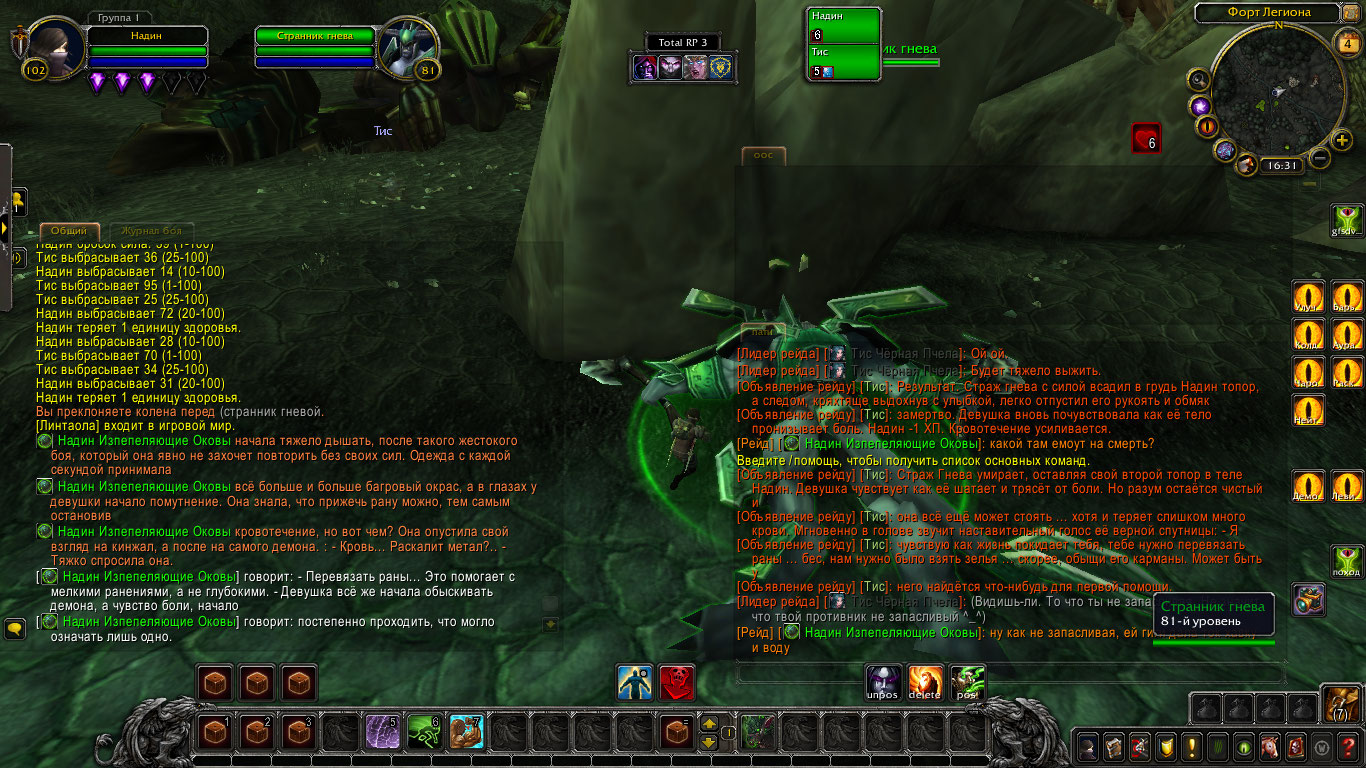 Слабость девушки дала о себе знать. Даже забравшись на высоту и имея выгодное положение для атаки, ей не хватало сил чтобы своими прыткими движениями ранить демона. Колотая рана продолжила кровоточить и вызывать тяжесть в бою, а вместе с этим притупляя чувства девушки и навевая усталость. Однако, она почувствовала легкий заряд бодрости, ибо воздействие магии демонессы помогли ей воспарить духом и на время забыть о слабости и вернуться к сражению. Тактика Надин срабатывала, короткие перебежки между скалами и скрытые нападения оттуда, откуда не ждал демон срабатывали. Заливаясь природной яростью и размахивая своей секирой направо и налево, Страж Гнева был ошеломлен от своей же собственной силы и приходил в себя, нервно рыча и судорожно тряся руками. Одна из его секир выпала с руки и демон принялся вопить, а поймав момент, Надин нанесла ему смертельный удар прямо в грудь и сразила наповал недруга. Ядовито-зеленая жидкость пролилась из открытой раны на пол, обрамляя ею все вокруг. После этого укорачиваясь от атаки неустанного демона дерущегося до конца своей жизни, Надин прыгнула на голову демона и занося ещё один удар кинжалом. Захлёбываясь своей собственной крови и падая бессильно на землю, он все же достал Надин ударом своего кулака и отбросив её, испустил свой дух.