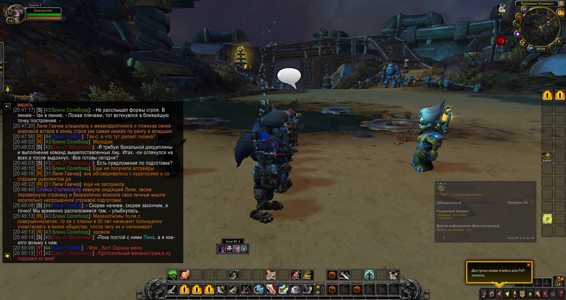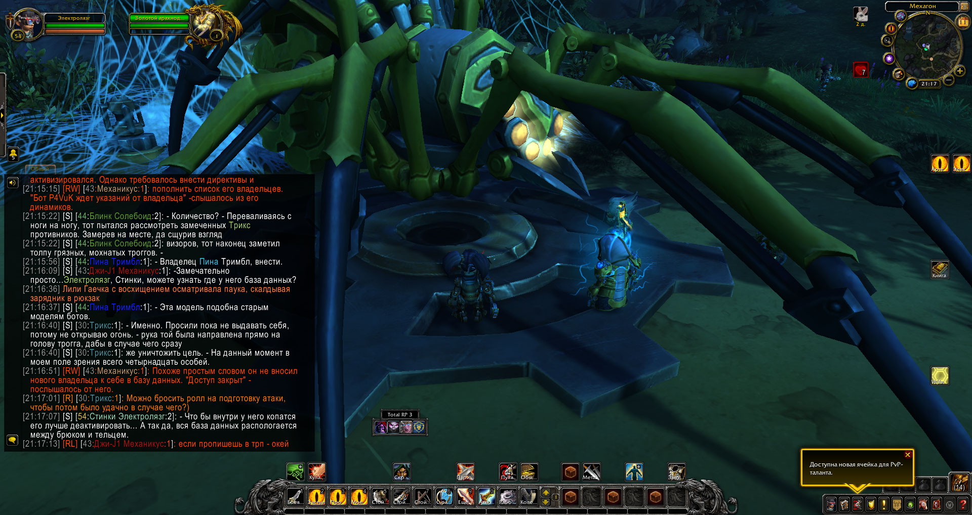 Попытка леди Пины внести себя в базу данных голосовым управлением не увенчалась успехом. И обсудив саму модель арахна-бота, принято решение перезагрузить его мыслительный блок. Разбираться с этим полезла Стинки. Забравшись под механизм, она использовала свою «Хавталку» и вскрыла блок, а дальше требовалась приложить энергию тока, что бы вызвать перегрузку и устроить перезагрузку. Но что-то пошло не так и после первого разряда бот изъявил команду осмотра местности и начал просто вращаться на месте. Гномка была в ловушке и требовалось снова использовать искру. Выждав момент, Стинки снова использовала энерго-дугу. Паук резко застыл. Заряд заставил его направится в сторону механагномов и пробежав сквозь их ряды, посбивав парочку по пути, и побежала дальше к берегу, где были трогги.