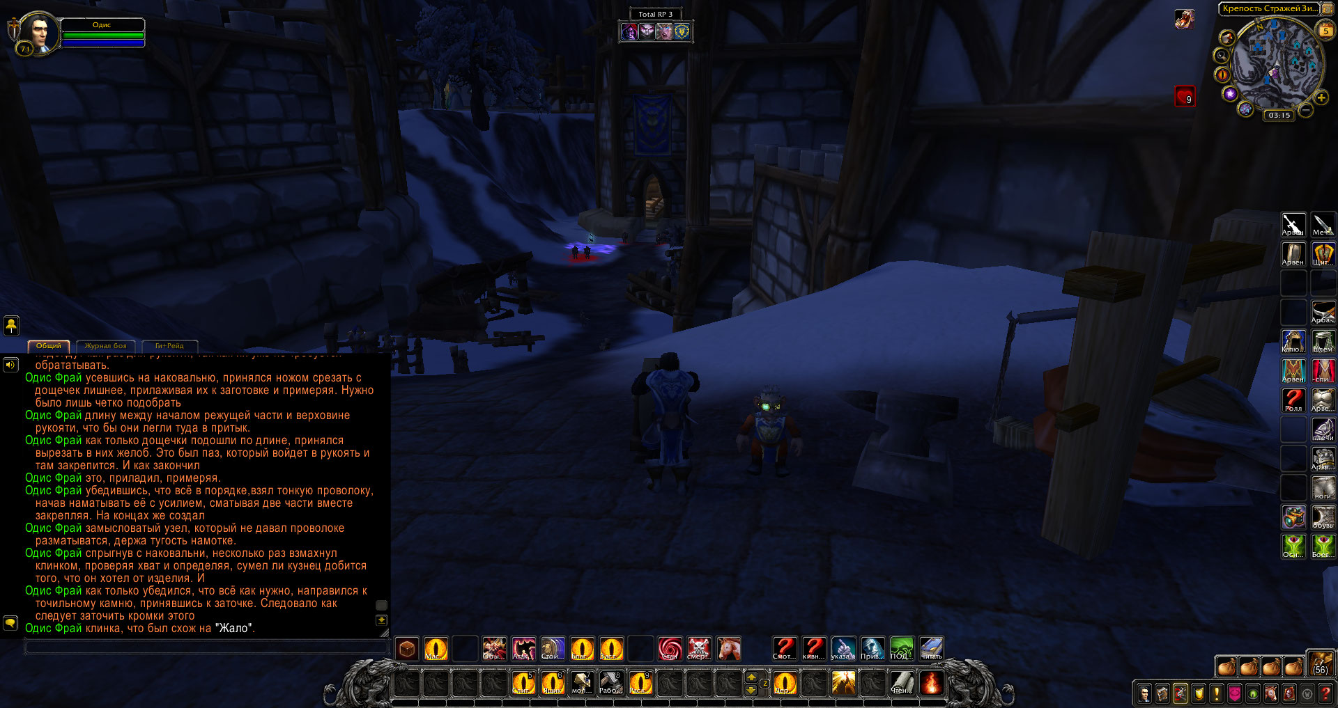 Конечно печально, что местный кузнец не выжил, так бы работа шла вдвое быстрее. Но Одису не привыкать. В момент, когда заготовка по мнению кузнеца Одиса была разогрета как полагается, она при помощи клещей мигом ушла в колоду с водой. И так было проделано несколько раз. Данная работа заключалась в закалке, которую не сделал до этого в Златоземье. Закончив, встал было за точильный камень, но тут ему не дали. Подошел Араторис и велел бросать всё и готовится. В этот самый момент протрубили трубы, глася о нападении и поднимая тревогу...
