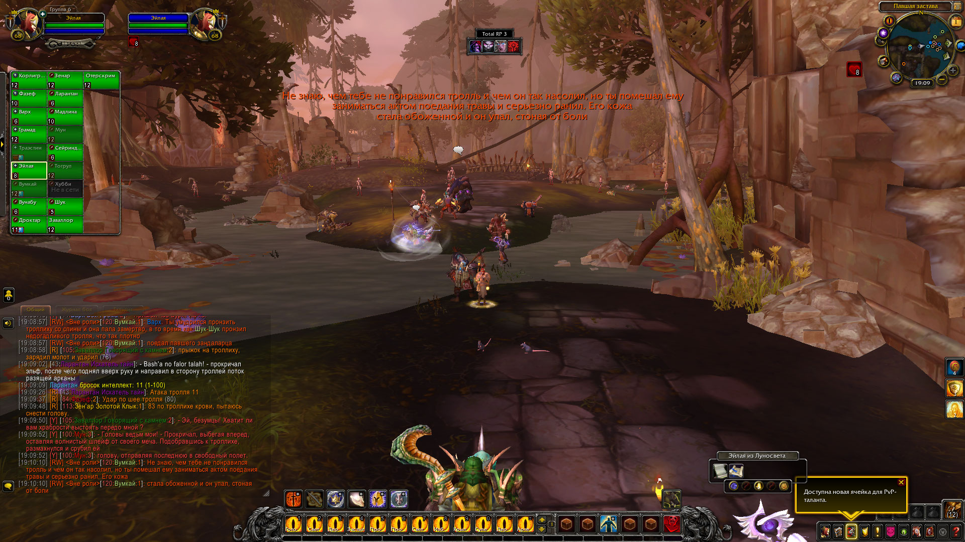 «Лоа сегодня благоволят нам. Впереди, на холме, находится Атина, „матриарх“ троллей крови. Гнусное, отвратительное создание. Планы меняются. Сегодня мы разберемся с этой угрозой целиком и полностью. Мы убьем Атину, и тогда среди троллей крови воцарится полный хаос. Она очень сильная проклинательница. Так что вы нападете первыми. Я обойду ее и застану врасплох. Пошли. Мы вернемся в Зулдазар еще до заката.»