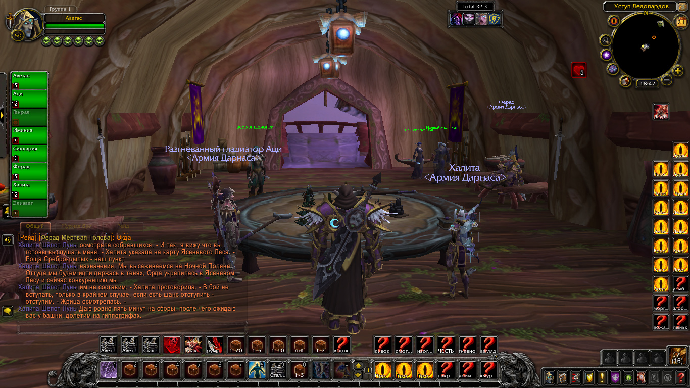 осле возни с браконьерами, отряд вернулся к своим делам. Каждый разбрелся кто куда, но не надолго. Через час, или около того, по лагерю разнесся призыв к действию от жрицы Халиты. Член сестринства созывал смельчаков для того, чтобы провести дерзкую вылазку в Ясеневый Лес за лунными камнями, специальными предметами для проведения ритуалов. Звучало достаточно заманчиво, посему, на клич отозвалось три стража, двое часовых, жрец Элуны и два рыцаря смерти. Собравшись в ставке, Халита провела маленький инструктаж касательно того, что они должны сделать и поведала о том, как они должны действовать. Для перемещения были выбраны гиппогрифы, которые доставят калдорай на Ночную Поляну. Пять минут на сборы и миниатюрное войско собралось у башни в ожидании погрузки.