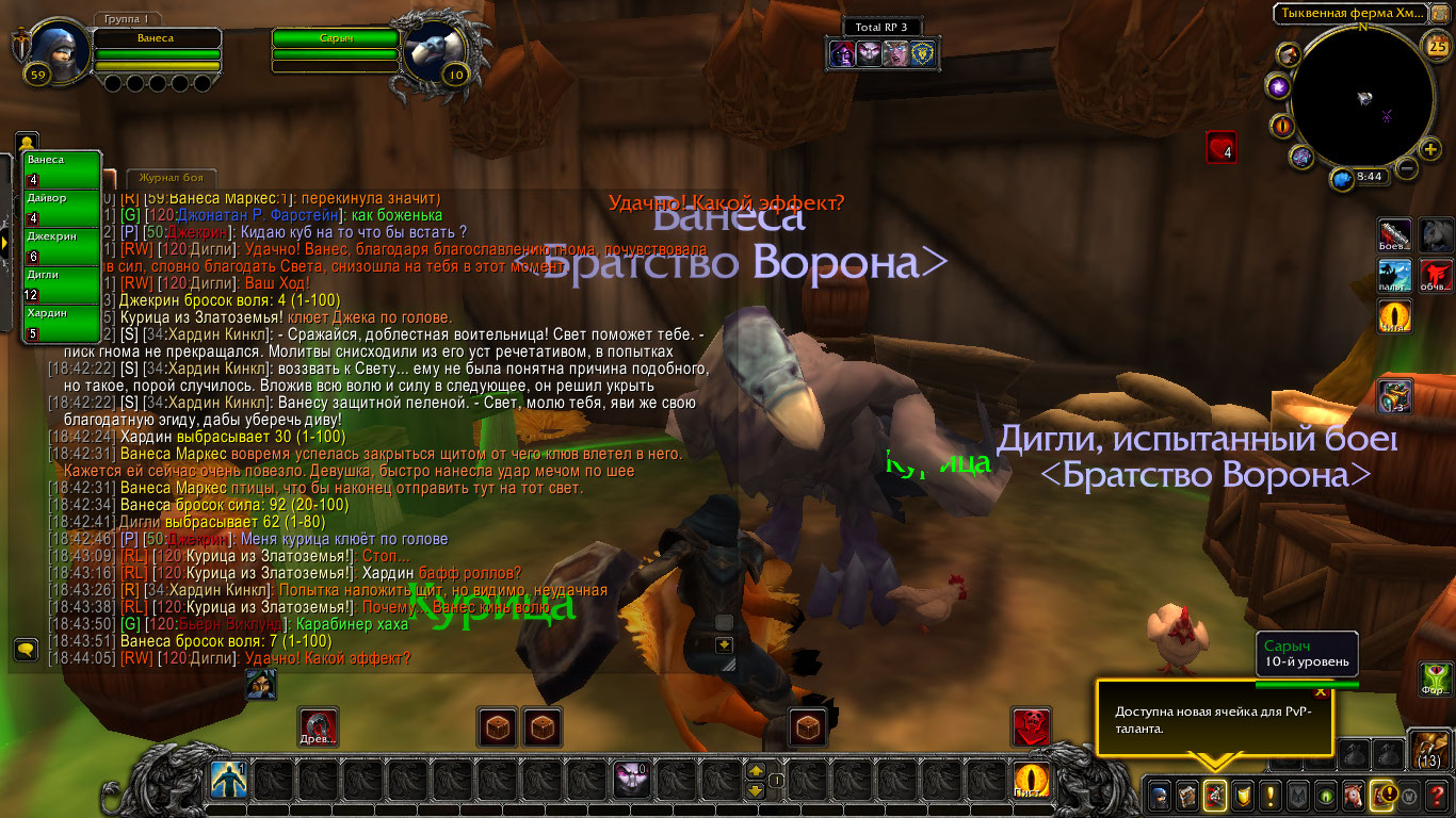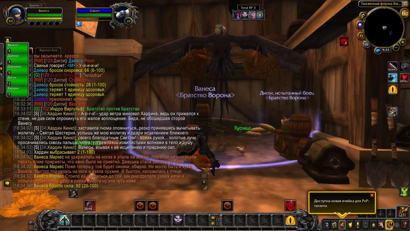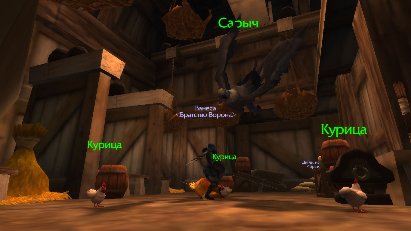 Он уже успел схватит тушку свиньи и хотел взлететь, но Ванеса вовремя успела выскачить из-за угла и кинуть на него лассо, правда попала она не в него а в его добычу, но затормозить того все же смогла, ведь хищник, не хотел отпускать свою добычу. Вот уже и Дайвор смог сделать не большой барьер, который не дал птице улететь в дырку на крыше. Завязался бой. Каждый делал что мог, девушка принимала удары на себя, что бы Сарыч, не кинулся на ее соратников. Правда и птица явно не собиралась сдаваться. Она даже смогла откинуть Ванесу от себя, от чего та получила несколько ушибов. Но та быстро встала и стала сражаться дальше. Девушка успела нанести несколько хороших ударов, от чего птица, свалилась на пол, но все равно не сдавалась, та даже попыталась выклевать Ванесе глаз, благо девушка успела закрыться щитом. В конце концов, компания все же смогла победить Сырча, совместными усилиями. Ванеса, забрала себе перо с птицы. Через не большой промежуток времени, фермер пришел посмотреть на сделанное дело. Убедившись, в том что дело сделано, он отдал всей компании обещанную плату, а в вот Хардину, досталась старая мантия какого-то мага, который в свое время оставил ту у фермера. Не много передохнув, все отправились назад в усадьбу.