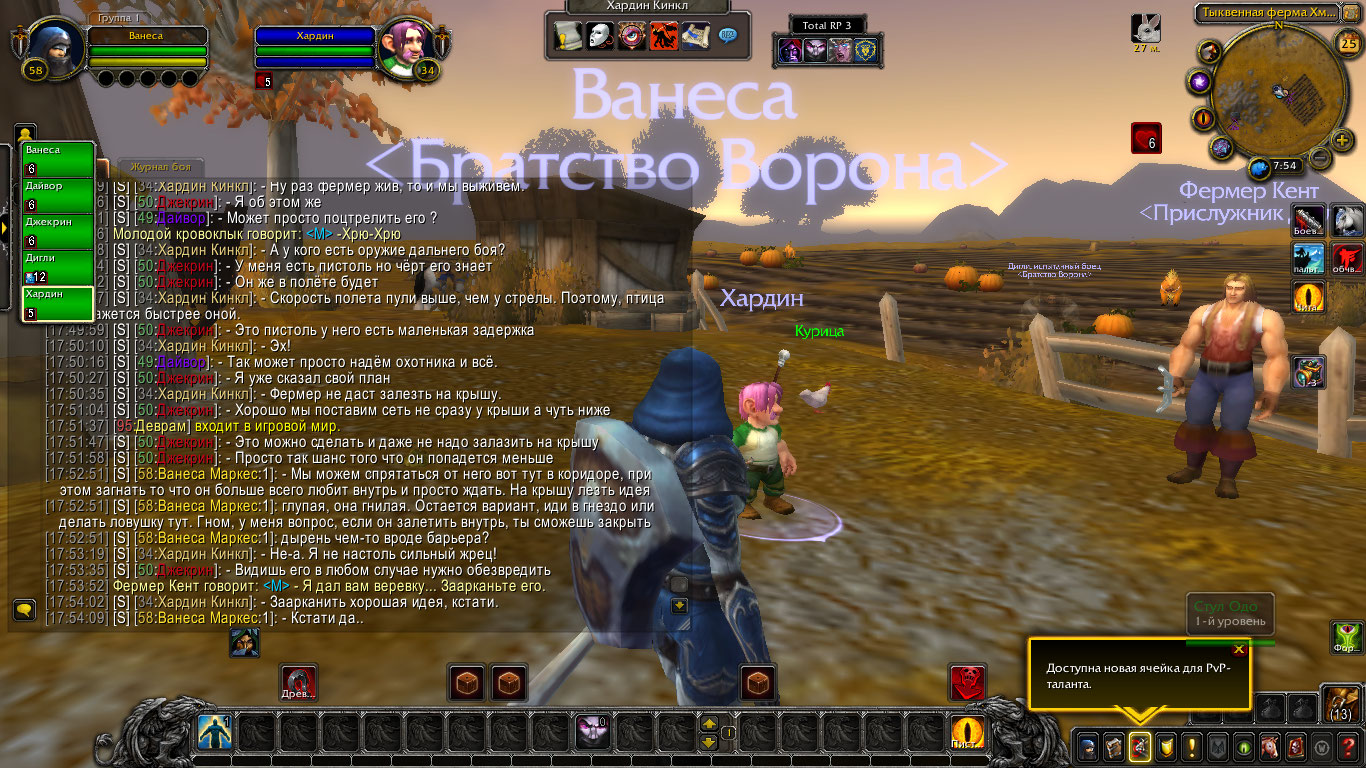 Был вечер, Ванеса пришла в усадьбу Братства Воронов. Где Дигли сказал что нужно срочно отправляться в Западный край и помочь тамошнему фермеру. Пока девушка пошла переодеваться доспехи, к усадьбе уже подтянулись и остальные. Узнав куда отправляются, вся компания снарядилась и отправилась в путь, по пути все в основном молчали. Правда один из компании был без лошади и девушка предложила ему одолжить золото на покупку скакуна, но тот отказался. Как говорится дело его, но Ванесе это показалась не много странным, ведь удобнее было бы перемещаться с ездовым животным. Путь прошел хорошо и без происшествий. Компания в лице, Ванесы, Хардина, Джекрина а так-же Дайвора, добралась до тыквенной фермы Хмуроброва.
