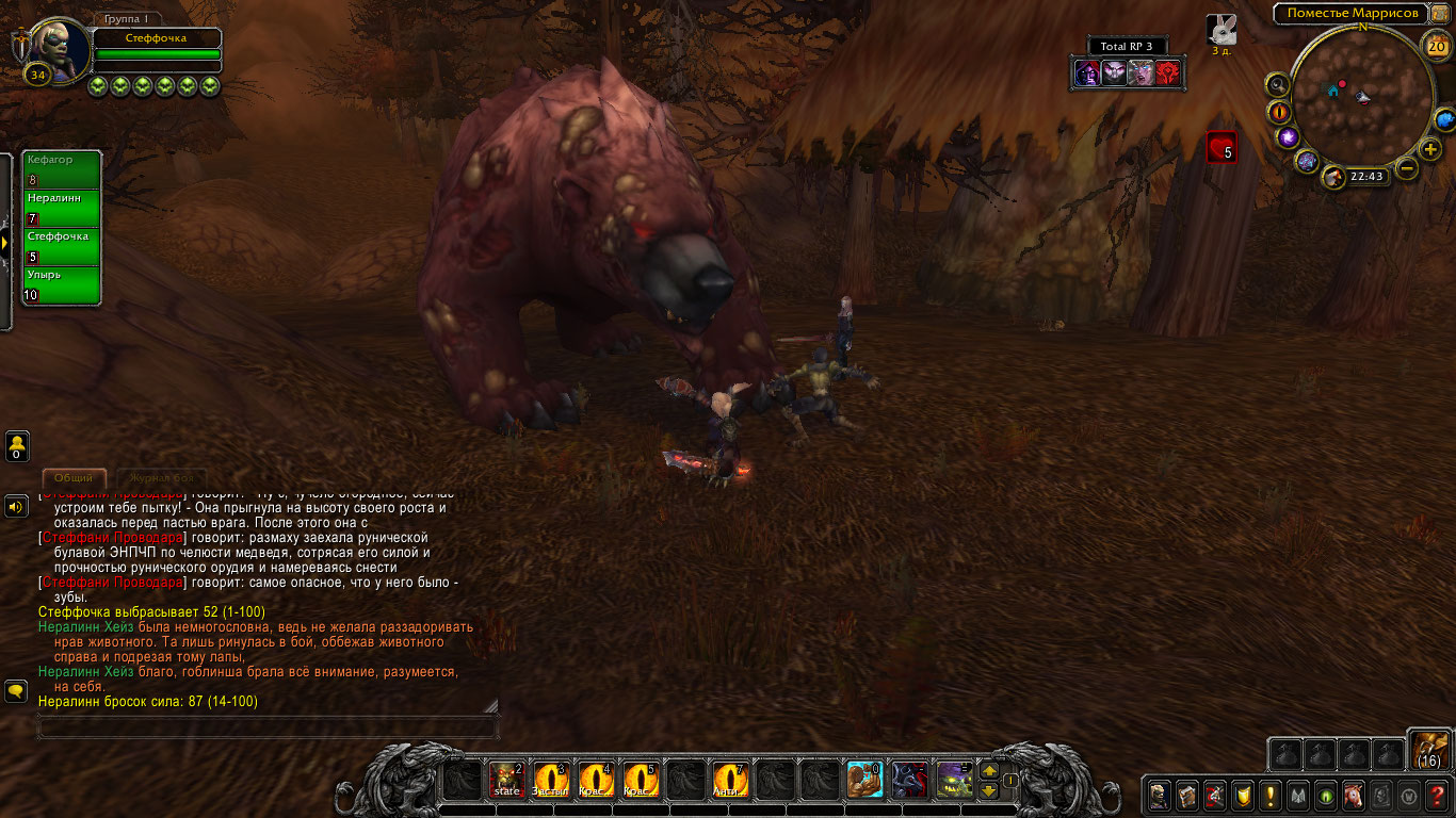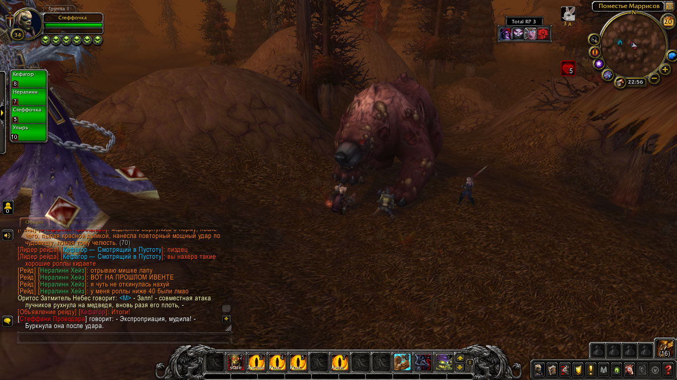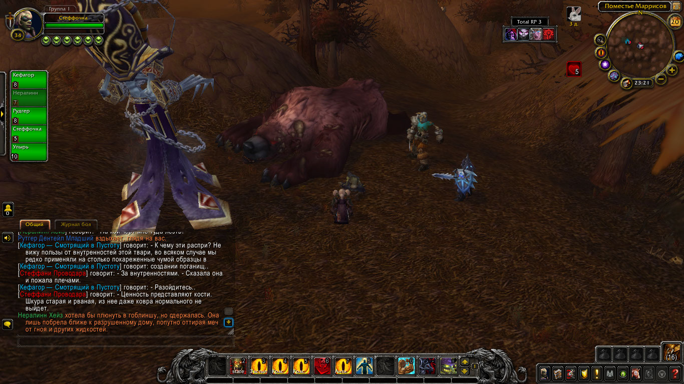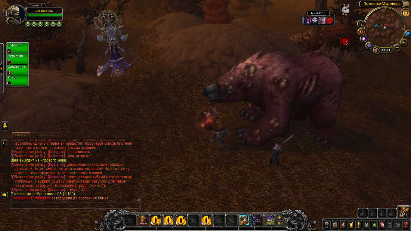 Но в результате длительного боя медведь все же почти оторвал руку Стеффани. Тогда та в наглую забралась в глотку огромного медведя и начала крушить его изнутри! Покуда Нералинн и Попрыгунчик рубили зверя снаружи, гоблинша рвала внутренности и кости твари так, где оне могла защититься. В конечном итоге медведь пал, не имея возможности более держаться на ногах. Через некоторое время его бок был разрублен, и изнутри деловитой походкой вышла гоблинша рыцарь смерти.