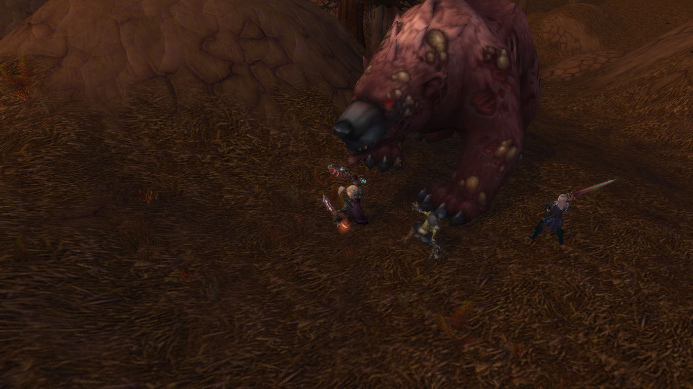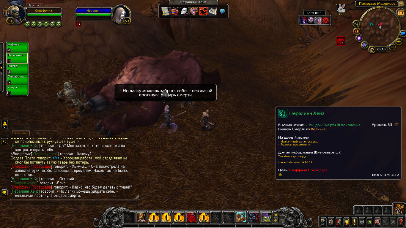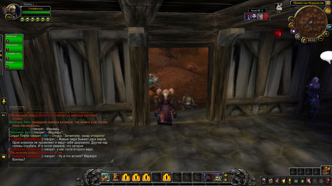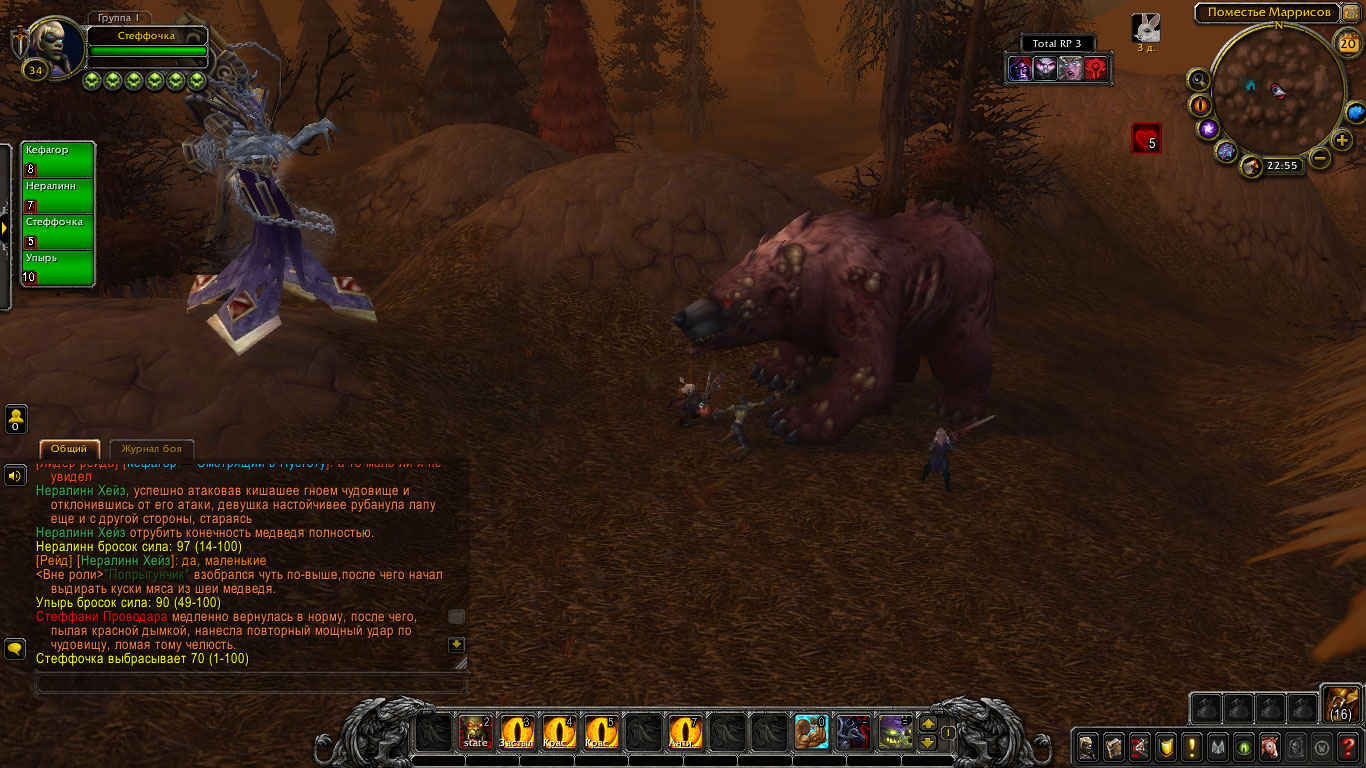 Но в результате длительного боя медведь все же почти оторвал руку Стеффани. Тогда та в наглую забралась в глотку огромного медведя и начала крушить его изнутри! Покуда Нералинн и Попрыгунчик рубили зверя снаружи, гоблинша рвала внутренности и кости твари так, где оне могла защититься. В конечном итоге медведь пал, не имея возможности более держаться на ногах. Через некоторое время его бок был разрублен, и изнутри деловитой походкой вышла гоблинша рыцарь смерти.