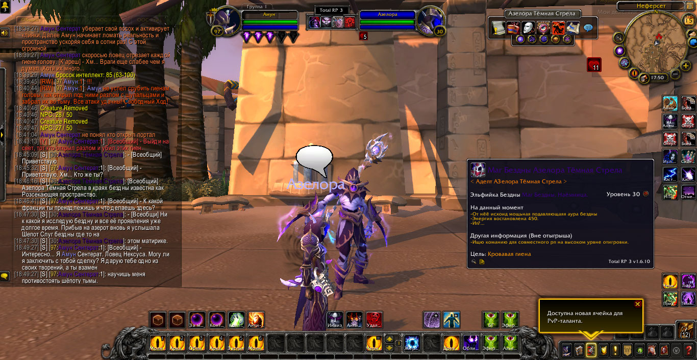 — Амун встретил эльфийку по имени Азелора, с которой заключил союз. Они вместе планирую очистить Неферсет от хищников. Также эльфийка хочет помочь Амуну в его обучении на пути противодействия Силам Тьмы.