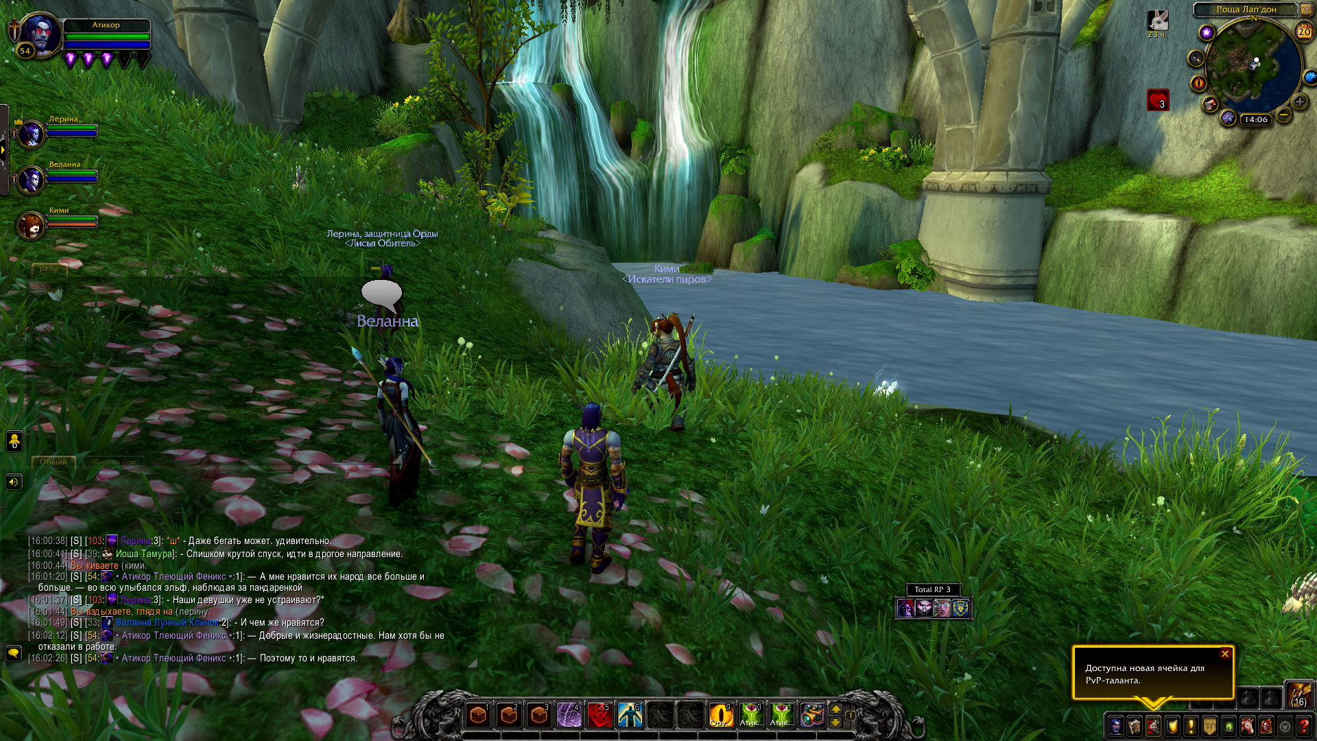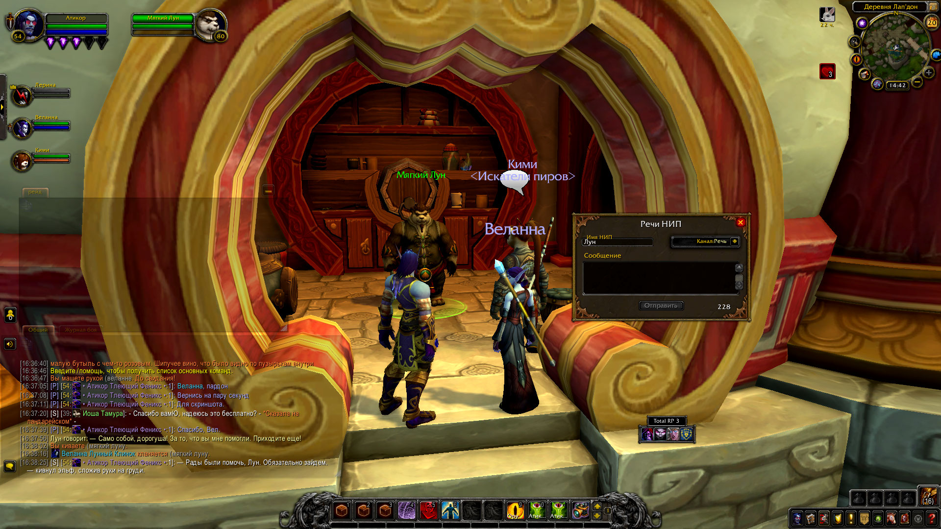 — Атикор, Веланна и Лерина, от лица Рен'Адар, выполнили небольшое поручение от Мягкого Луна и рыбака. Теперь в деревне Лап'дон о них начали теплее отзываться, хотя, есть и те, кто еще воспринимает Рен'дорай в штыки.