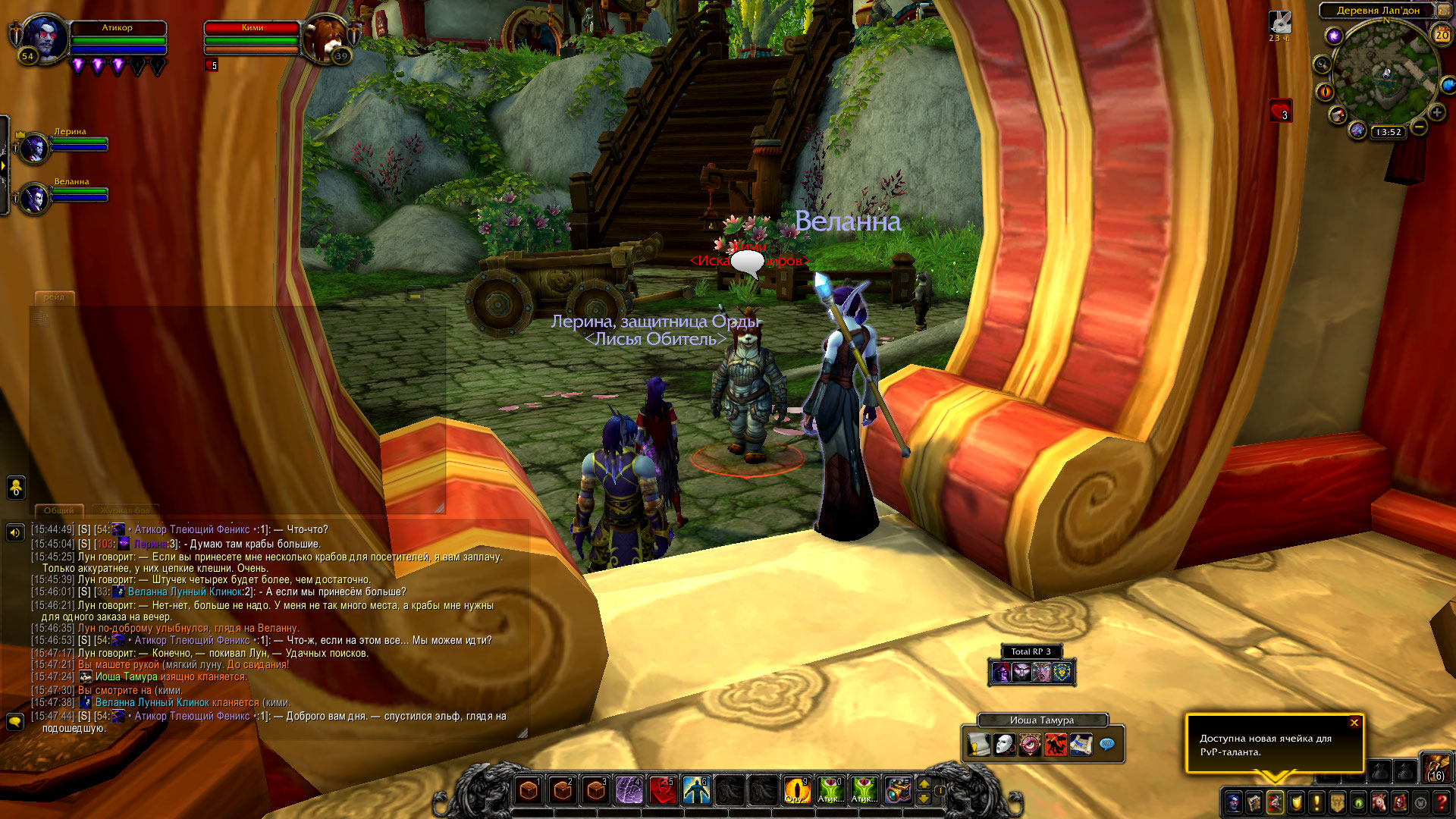 Именно поэтому, группа эльфов решила поправить свою репутацию в глазах Пандаренов. Хотя-бы в пределах деревни. Вчера в таверне, Леди Реннаэль с ее подчиненными услышали о том, что деревенский рыбак потерял ларец со своими снастями и просит неравнодушных найти его. Атикор, Лерина и Веланна решили помочь пандарену с этим делом и наткнулись на местного повара — Мягкого Луна. Он им объяснил, где примерно искать и что, а также дал им еще одно поручение — собрать крабового мяса, или лучше принести крабовые тушки прямо к нему на кухню. Эльфы согласились, а после, прямо у выхода, встретили одну доброжелательную пандаренку, что согласилась помочь в поисках.