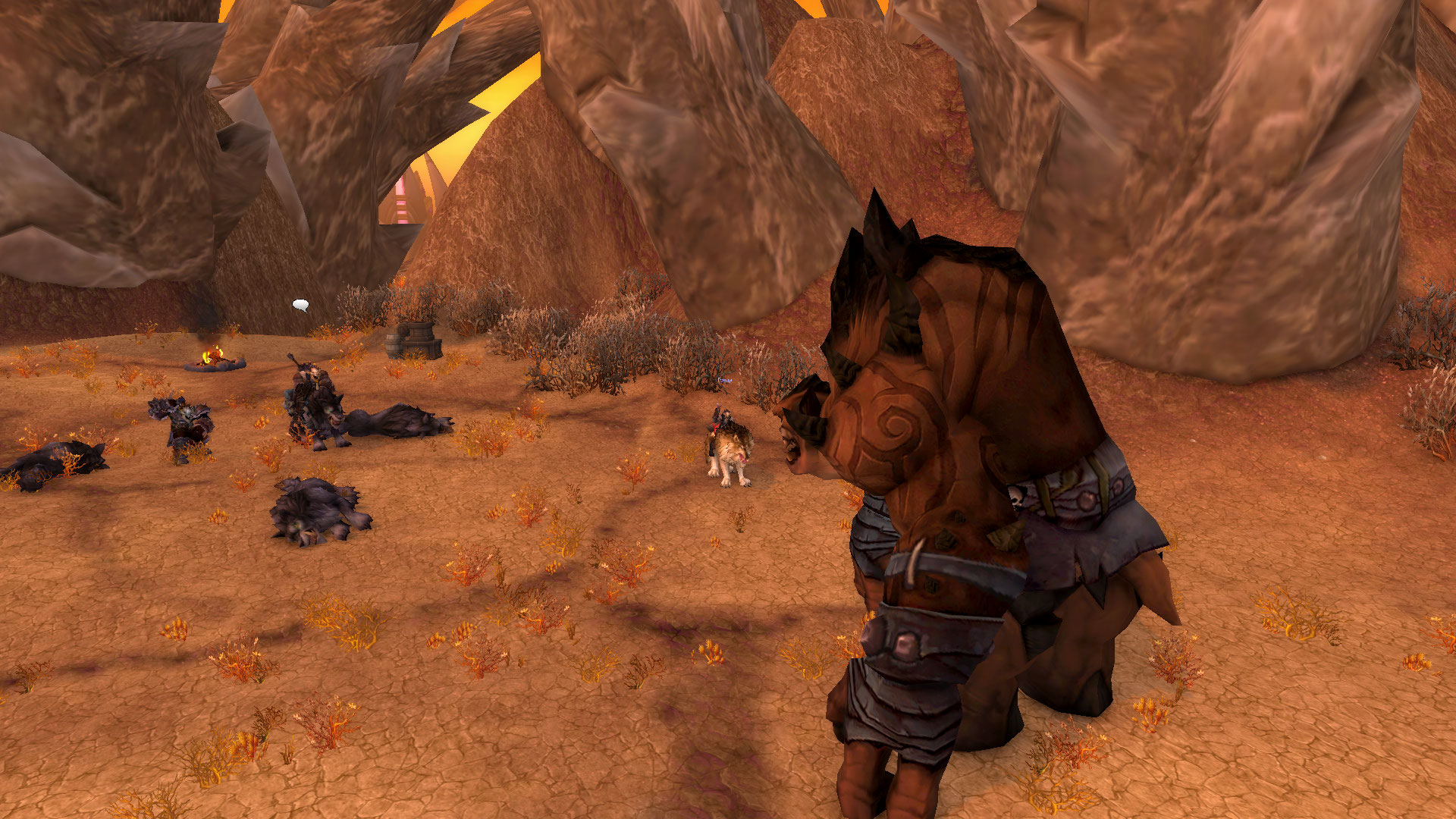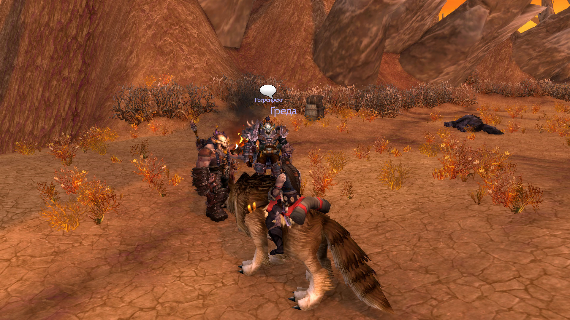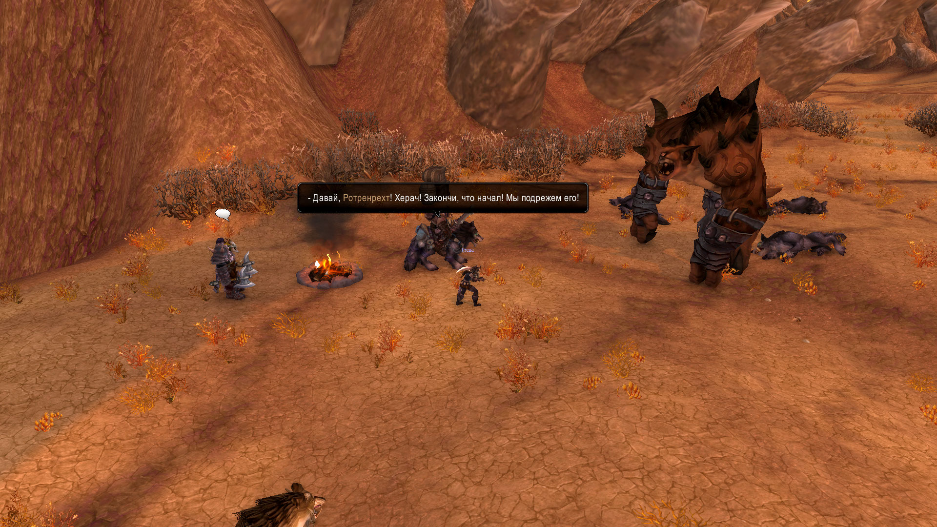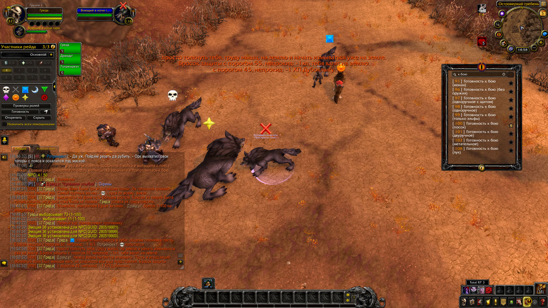 Худые облезлые псины вышли на след орков и решили попробовать получить себе добычу. Но орки были не промах, а верные спутники Греды и Дракдуга тоже оказали свою поддержку в бою. Три враждебных волка были побеждены, два из них отправились к своим предкам и пойдут на корм и меха для орков. Третьего же ранили не смертельно.
