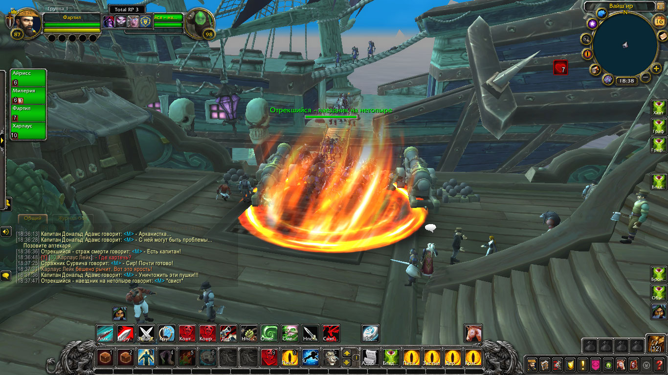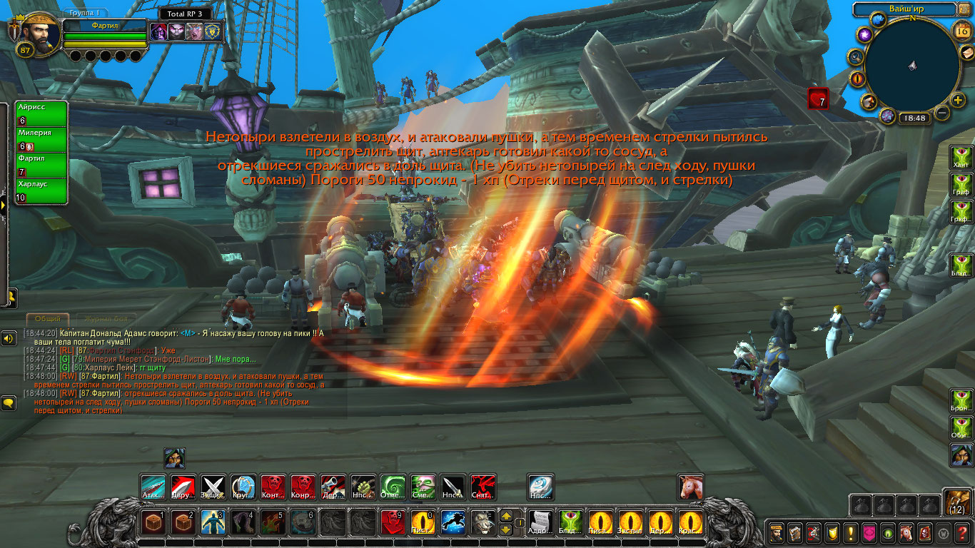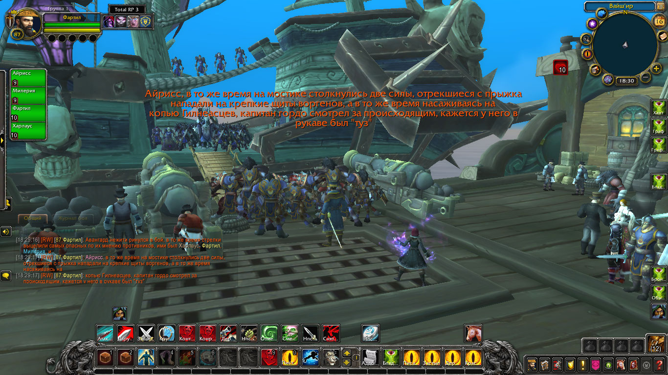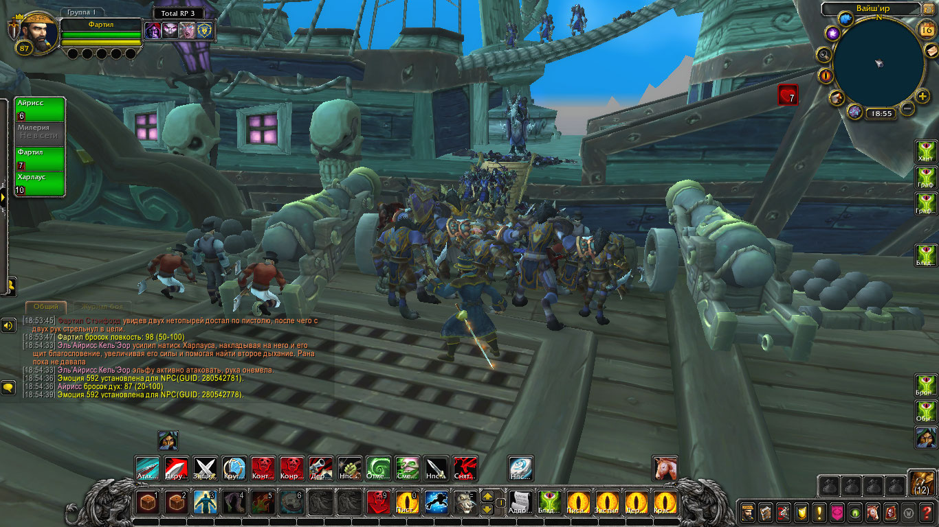 Отрекшиеся корабль которых стоял километре от судна гилнеаса, так же бросил якорь, принявшись готовится к бою. Прошло порядком десяти минут, после чего враг начал своё движение, ловко корабль отрекшихся не давал развернутся гилнеасцам в свою сторону, промах за промахом ядра начали кончатся, а враг тем временем был впритык к кораблю.