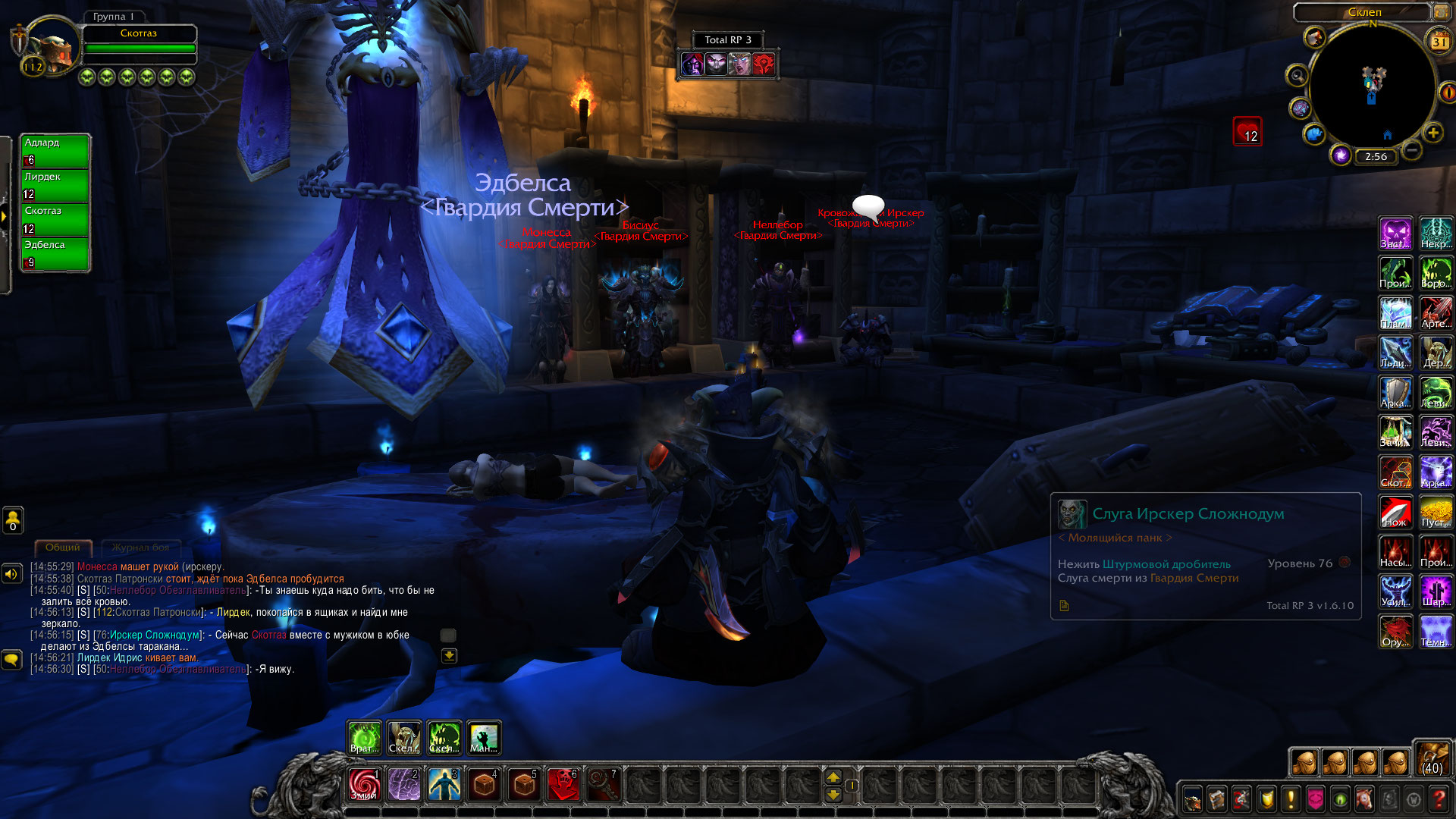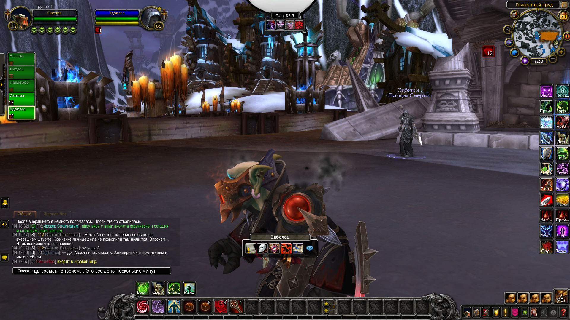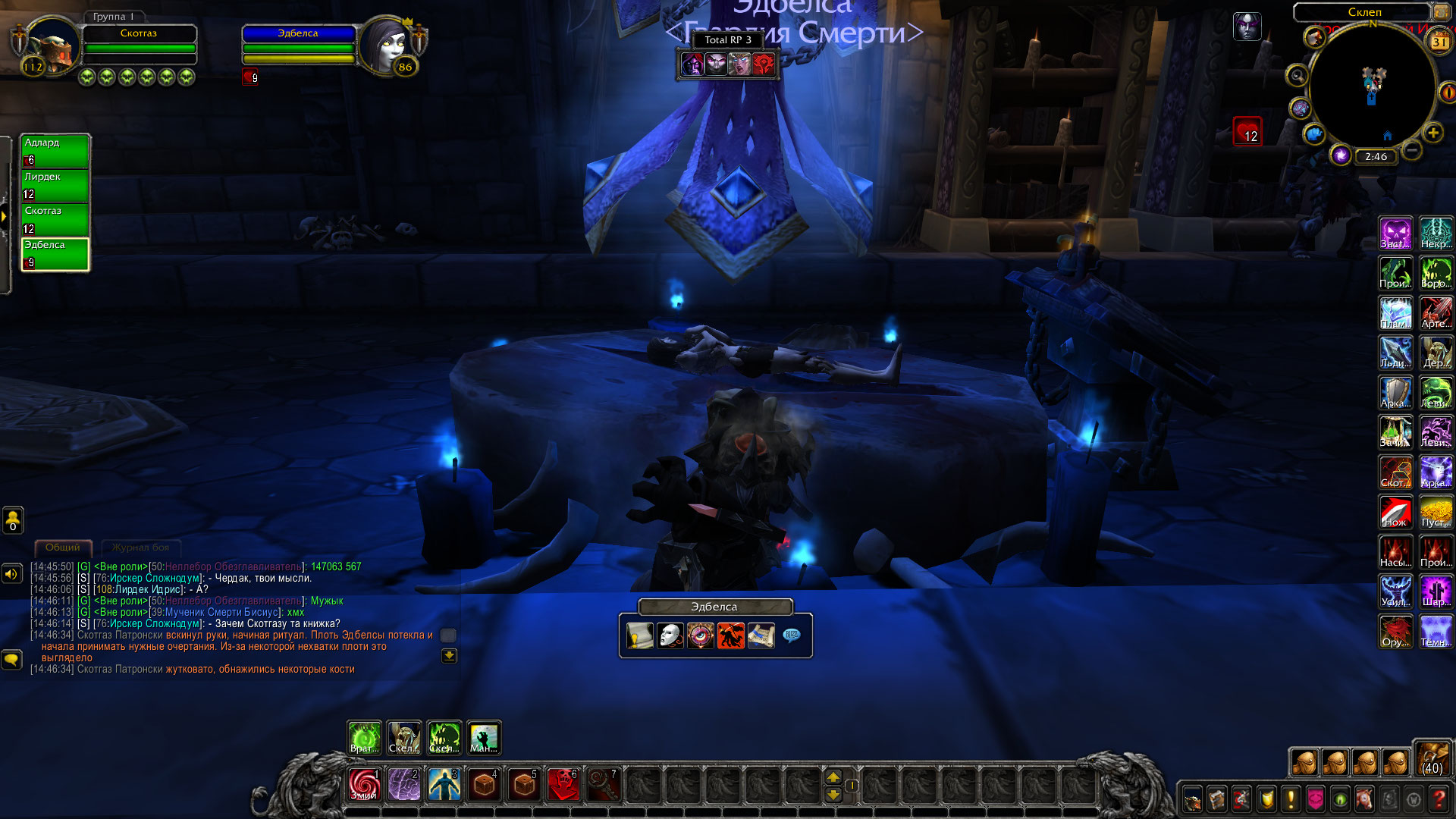 Превращение в нежить это не всегда легко, особенно насильная. Мертвецы с придыханием вспоминают прошлую жизнь, даже понимая, что уже никогда не смогут к ней вернуться. Такая участь постигла и Эдбелсу, но не всё было потеряно. К её великой радости, Скотгаз частенько занимался такими вещами, как восстановление тел. А девушка судя по всему была очень привязана к нему. Обсудив это дело в Валькирионе, они отправились на поиски рабочих рук. Первыми были встречены лич Адлард и послушник Лирдек. Они были отправлены в склеп за самыми свежими трупами, пока Скотгаз повёл Эдбелсу к своему особняку. Спустившись в подвал, он расспросил девушку о пожеланиях во внешности. Ответ был ожидаем, она хотела внешность дворянки. Гоблин полез в свою библиотеку и нашёл одну из автобиографических книг личей, коих было в достатке у Ордена. Там же были и найдены зарисовки внешности, лич при жизни была Лордеронской дворянкой. Внимательно рассмотрев все возможные зарисовки из книги, гоблин приказал Эдбелсе лечь на алтарь. К этому времени появился Адлард с Лирдеком, несущим трупы. Скотгаз погрузил девушку на алтаре в летаргию, а затем начал ритуал. Плоть на теле потекла, принимая новые очертания. Из-за старости Эдбелсы в не-жизни, плоти на костях не хватало. Вот тут и пригодился один из свежих трупов, плоть которого была позаимствована для ритуала. Тело девушки приобрело вид свежего трупа, ювелирная работа опытного некроманта. Осталось лишь лицо, некоторые дворянские черты были добавлены Скотгазом, исходя из зарисовок в книге. Целью однако было сделать не полную копию, поэтому лишь некоторые черты были перенесены на лицо пациента. Теперь Эдбелса походила скорее на живую, чем на мертвеца. Её выдавал лишь бледный оттенок кожи, холодность тела и не самый выразительный взгляд. К тому же, её легко можно было перепутать с кем-то из дворян, настолько хорошо Скотгазу удалось провести тонкие манипуляции. Затем гоблин вывел девушку из летаргии и вручил ей зеркало, было видно что она весьма сильно удивлена, и уж тем более довольна результатом. Поблагодарив некролорда, она поднялась и облачилась в свою одежду послушника. После же, все покинули особняк и разбрелись по Валькириону, смотреть было более не на что.