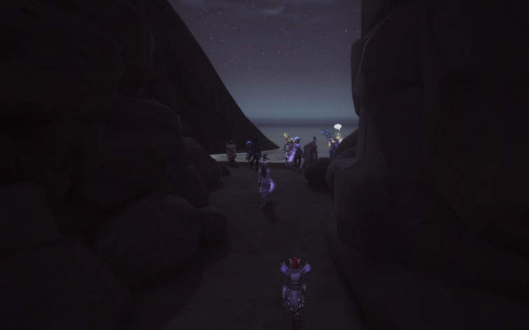 Из сухой пустыни — в Долину Штормов, где как раз начиналась буря. Дождь лил щедрыми струями, ветер едва не срывал всех в море. Грязь под ногами была ненадёжной опорой, но герои поднимались выше, к Обрыву Забвения. К каменной арке, где ждала Ксал'атат. Путь, чем выше они поднимались, тем богаче становился украшен костьми несчастных, погибших в битвах с Йенажем и слугами Бездны из моря. Никаких сомнений и колебаний не возникало, подсознательно все понимали, что идут спасать Азерот из хватки Древнего Бога. Дело было почти завершено и оставалось… сделать последний шаг.