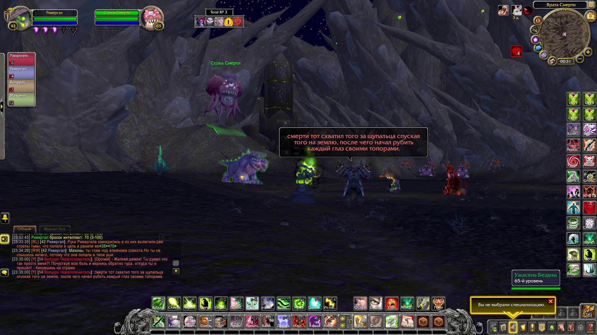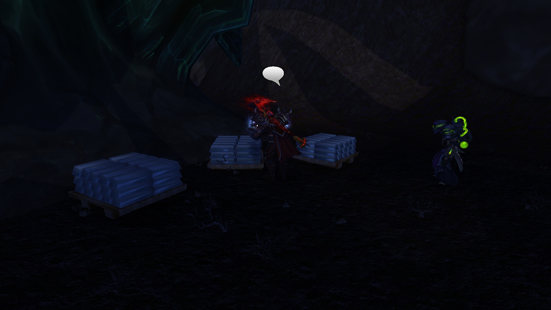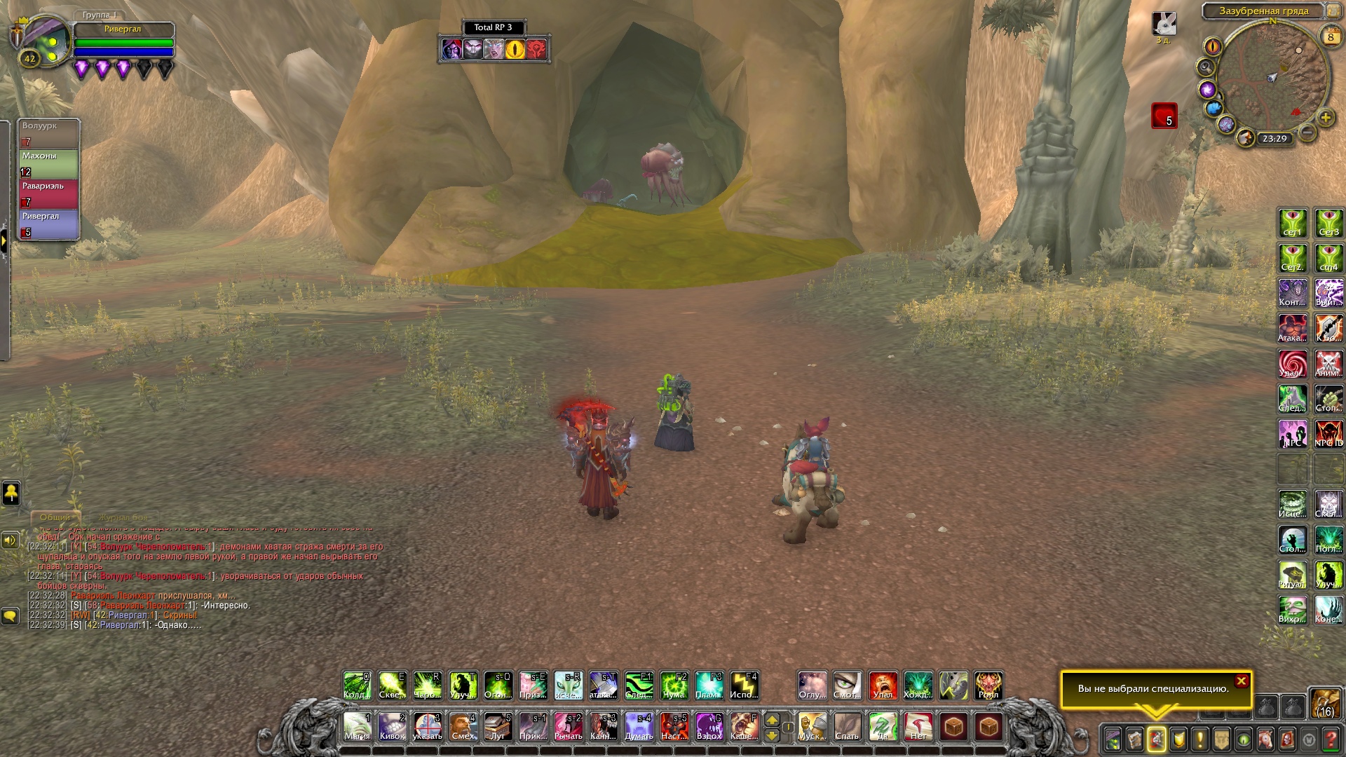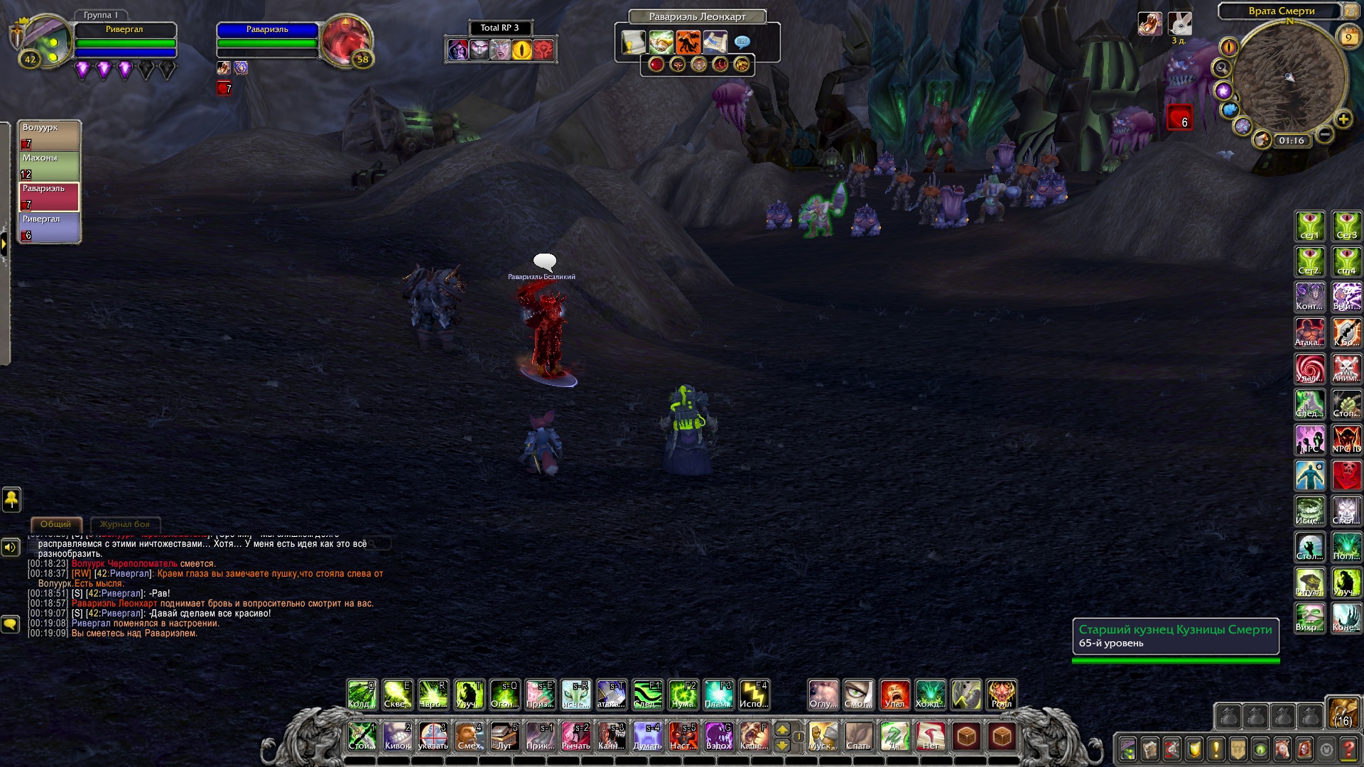 Ривергал и Махоны ринулись за ним, чтобы помочь. Справившись с демонами, Равариэль начал расспрашивать орка, что тяжело дышал и был полностью в крови демонов. Тот, не доверяя группе, рассказал о себе и поведал ей, что в этой пещере есть шахта, где орки добывали адамантит, но демоны вытеснили их и взялись добывать ее сами. Рыцарь решил проверить сказанное орком самолично, причем удостовериться в металле, что он его описал. Ведь данный метал, был как раз тем, что ему нужно, дабы выковать себе перчатки. Орк присоединился к группе и последовал за рыцарем. Пройдя вглубь пещеры, герои и орк заметили там полчище демонов, что сторожили места добывания материала. По началу все хотели пройти незаметно, но чуткий запах демонической крови на орке был замечен псами. На отряд напали. Ривергал сжигал врагов своим некротическим пламенем, Махоны стреляла в неприкрытые части тела демонов, Равариэль взмахами косой отрубал конечности врагов, а орк с яростью валил врагов на землю и вырывал их глаза. Герои успешно отбились и продолжили идти все глубже в шахту. Внезапно по пути на них сверху полетел сгусток слизи, что поразил вульпера и рыцаря, слизь быстро застыла, тем самым обездвижив пострадавших. Ривергал заметил демона, что сделал это и пустил в него потоковое заклинание, что разорвало его изнутри. Кровь полилась ручьем, а Махоны с Равариэлем выбрались из оков мерзкой слизи. Пройдя дальше по пещере, отряд заметил поджидавшую их группу демонов. Некромант призвал своих порабощенных трупов, а рыцарь покрылся красной аурой, вульпера перезарядила свои ружья, орк же просто ринулся в бой не сказав ни слова. Бой прошел быстро. Вся группа героев была полностью покрыта демонической кровью. Вульпере это не нравилось. Равариэль принялся иссушать тела врагов, а Ривергал же порабощать их души, дабы призвать более мощных слуг. Орк и вульпера смотрели на это с удивлением и непониманием. Герои продолжили путь. Уже приблизившись к концу пещеры, они заметили вдали огромный отряд демонов и рабочих, что копали ту самую руду, которая была нужна рыцарю. Орк заметил пушку демонов и все сразу поняли, что они будут делать. По команде орк должен был поразить врагов, которых Равариэль стянет к себе хваткой смерти. Задача некроманта заключалась в том, чтобы покрыть рыцаря щитом и защитить его от снаряда. Все прошло гладко и без ранений со стороны героев. Вскоре оставшаяся группа демонов была разбита вдребезги, а Равариэль нашел то, что искал. После этих событий основная троица попрощалась с орком, и они разошлись в разные стороны. Группа решила устроить лагерь неподалеку от пещеры. Была ночь и все принялись отдыхать.