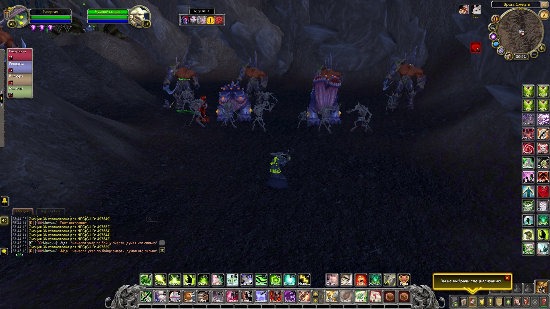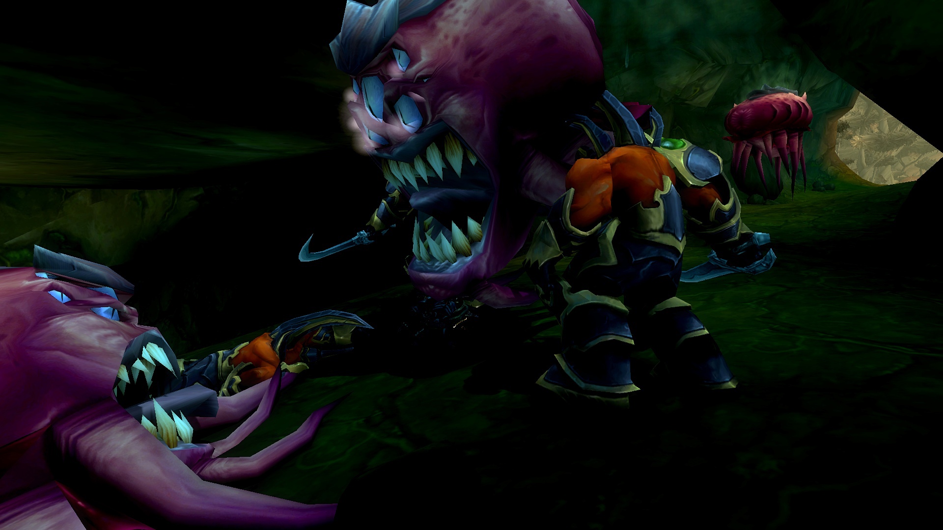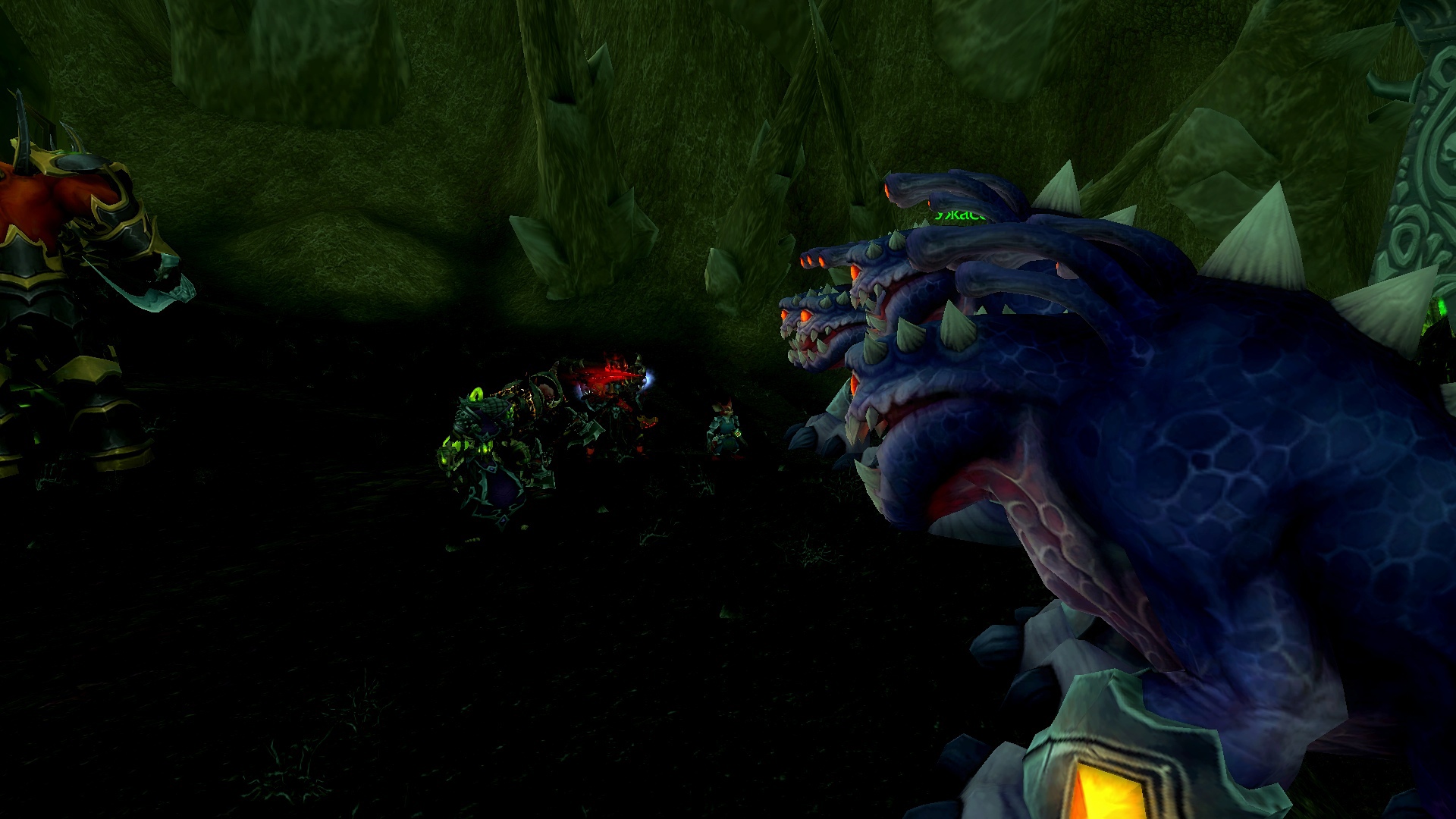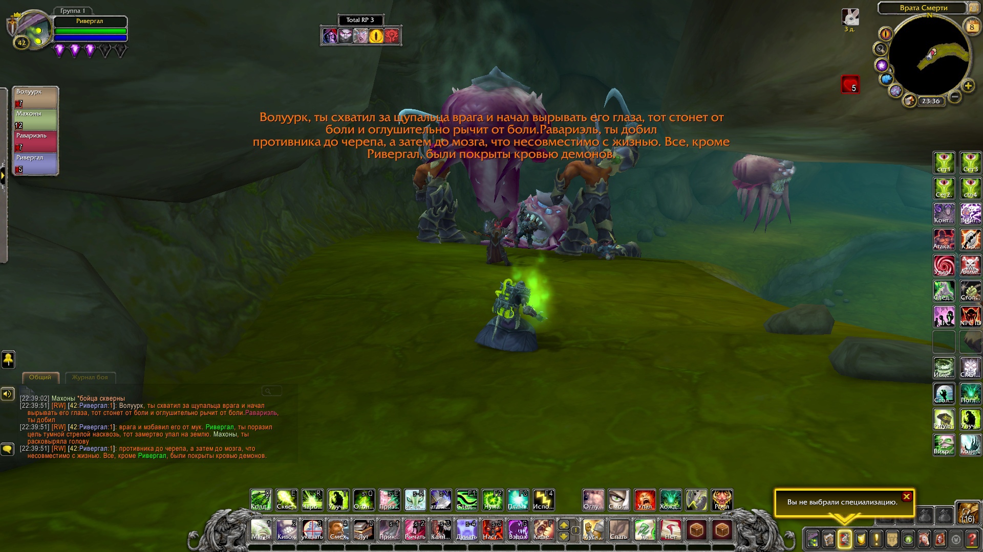 Ривергал и Махоны ринулись за ним, чтобы помочь. Справившись с демонами, Равариэль начал расспрашивать орка, что тяжело дышал и был полностью в крови демонов. Тот, не доверяя группе, рассказал о себе и поведал ей, что в этой пещере есть шахта, где орки добывали адамантит, но демоны вытеснили их и взялись добывать ее сами. Рыцарь решил проверить сказанное орком самолично, причем удостовериться в металле, что он его описал. Ведь данный метал, был как раз тем, что ему нужно, дабы выковать себе перчатки. Орк присоединился к группе и последовал за рыцарем. Пройдя вглубь пещеры, герои и орк заметили там полчище демонов, что сторожили места добывания материала. По началу все хотели пройти незаметно, но чуткий запах демонической крови на орке был замечен псами. На отряд напали. Ривергал сжигал врагов своим некротическим пламенем, Махоны стреляла в неприкрытые части тела демонов, Равариэль взмахами косой отрубал конечности врагов, а орк с яростью валил врагов на землю и вырывал их глаза. Герои успешно отбились и продолжили идти все глубже в шахту. Внезапно по пути на них сверху полетел сгусток слизи, что поразил вульпера и рыцаря, слизь быстро застыла, тем самым обездвижив пострадавших. Ривергал заметил демона, что сделал это и пустил в него потоковое заклинание, что разорвало его изнутри. Кровь полилась ручьем, а Махоны с Равариэлем выбрались из оков мерзкой слизи. Пройдя дальше по пещере, отряд заметил поджидавшую их группу демонов. Некромант призвал своих порабощенных трупов, а рыцарь покрылся красной аурой, вульпера перезарядила свои ружья, орк же просто ринулся в бой не сказав ни слова. Бой прошел быстро. Вся группа героев была полностью покрыта демонической кровью. Вульпере это не нравилось. Равариэль принялся иссушать тела врагов, а Ривергал же порабощать их души, дабы призвать более мощных слуг. Орк и вульпера смотрели на это с удивлением и непониманием. Герои продолжили путь. Уже приблизившись к концу пещеры, они заметили вдали огромный отряд демонов и рабочих, что копали ту самую руду, которая была нужна рыцарю. Орк заметил пушку демонов и все сразу поняли, что они будут делать. По команде орк должен был поразить врагов, которых Равариэль стянет к себе хваткой смерти. Задача некроманта заключалась в том, чтобы покрыть рыцаря щитом и защитить его от снаряда. Все прошло гладко и без ранений со стороны героев. Вскоре оставшаяся группа демонов была разбита вдребезги, а Равариэль нашел то, что искал. После этих событий основная троица попрощалась с орком, и они разошлись в разные стороны. Группа решила устроить лагерь неподалеку от пещеры. Была ночь и все принялись отдыхать.