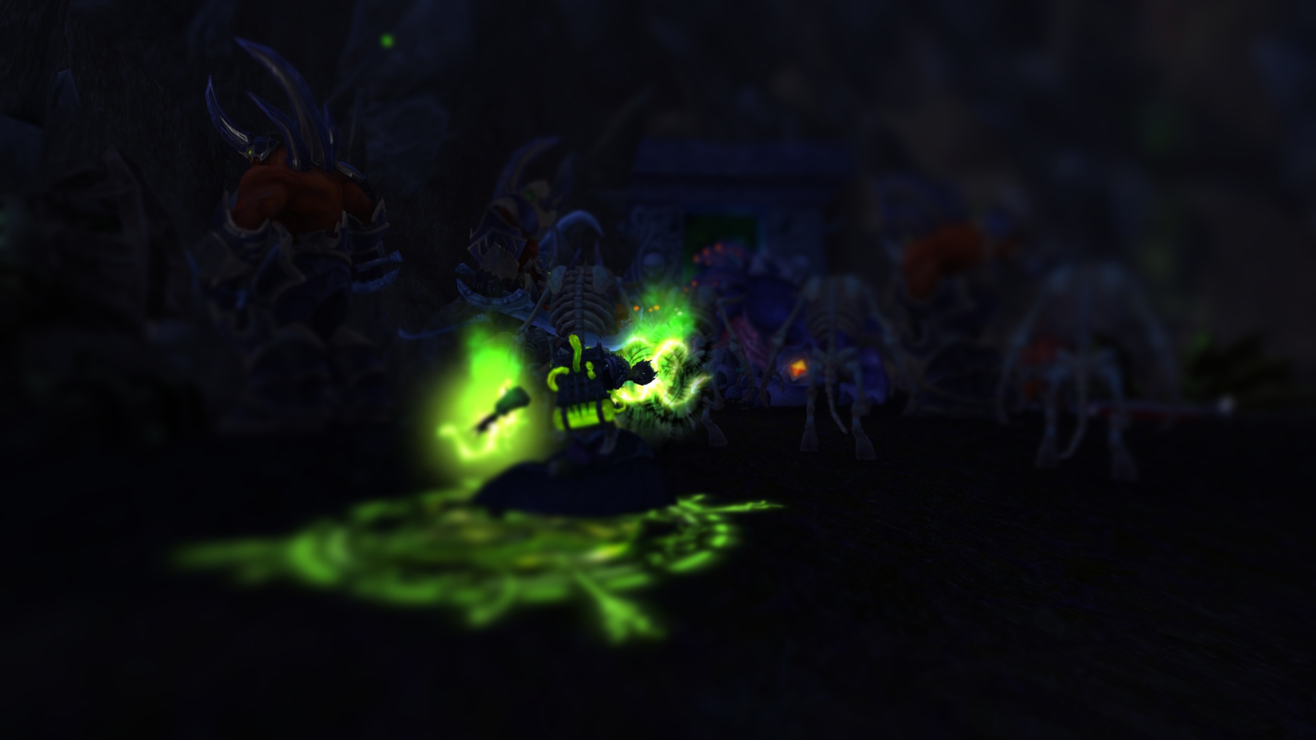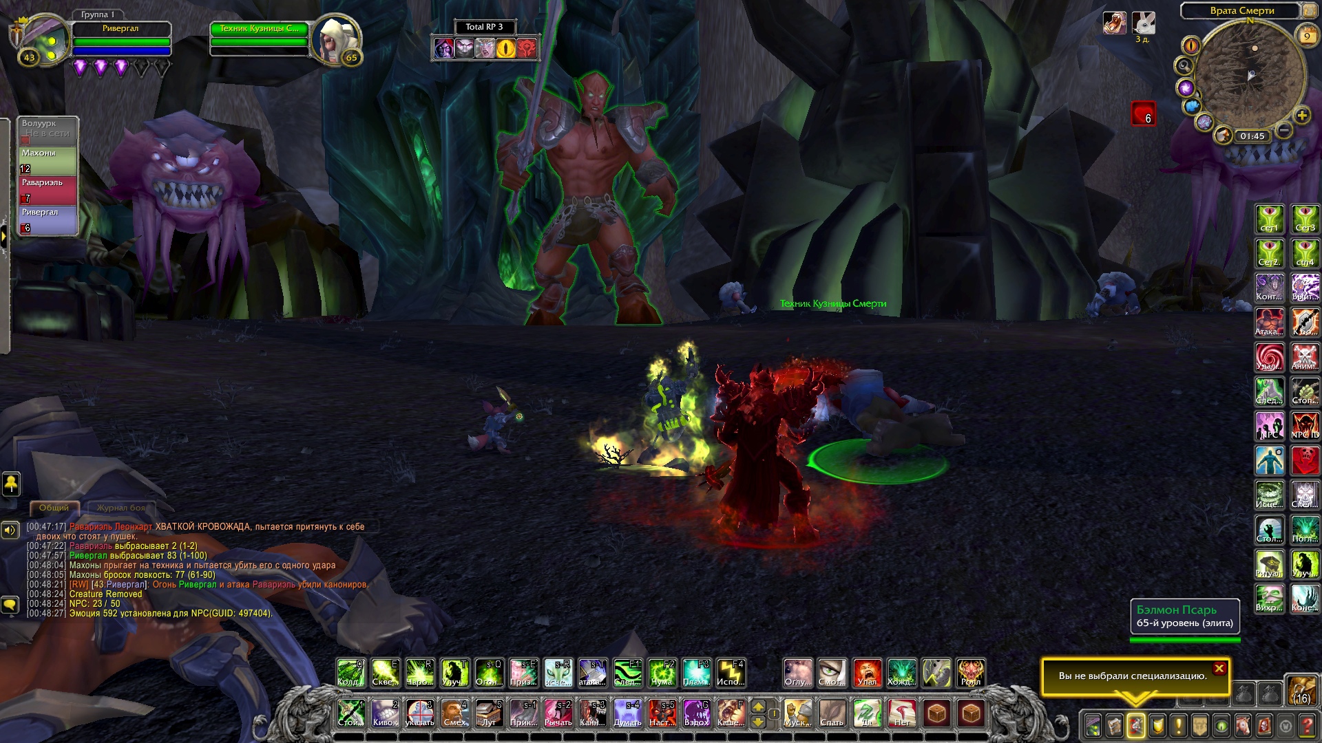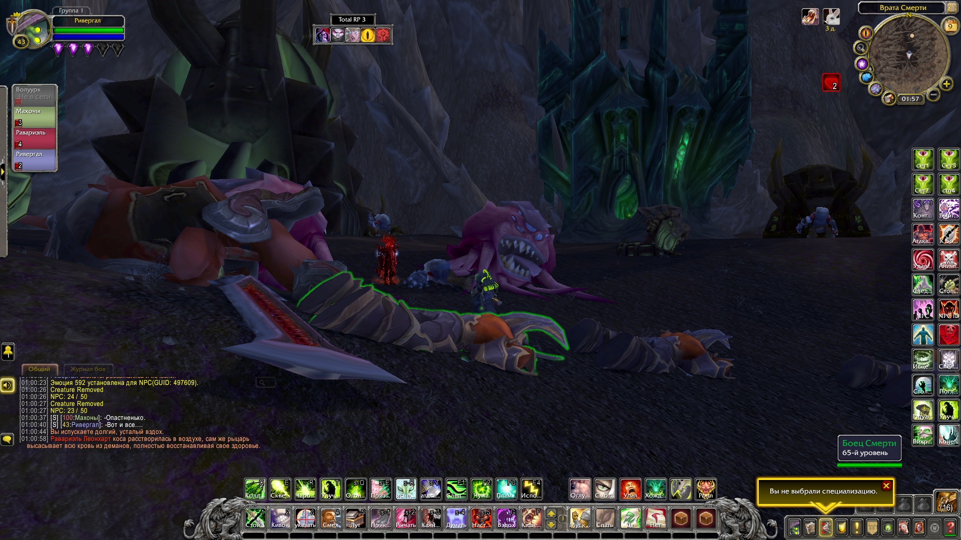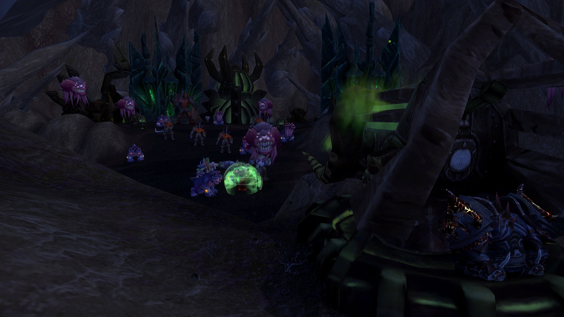 Ривергал и Махоны ринулись за ним, чтобы помочь. Справившись с демонами, Равариэль начал расспрашивать орка, что тяжело дышал и был полностью в крови демонов. Тот, не доверяя группе, рассказал о себе и поведал ей, что в этой пещере есть шахта, где орки добывали адамантит, но демоны вытеснили их и взялись добывать ее сами. Рыцарь решил проверить сказанное орком самолично, причем удостовериться в металле, что он его описал. Ведь данный метал, был как раз тем, что ему нужно, дабы выковать себе перчатки. Орк присоединился к группе и последовал за рыцарем. Пройдя вглубь пещеры, герои и орк заметили там полчище демонов, что сторожили места добывания материала. По началу все хотели пройти незаметно, но чуткий запах демонической крови на орке был замечен псами. На отряд напали. Ривергал сжигал врагов своим некротическим пламенем, Махоны стреляла в неприкрытые части тела демонов, Равариэль взмахами косой отрубал конечности врагов, а орк с яростью валил врагов на землю и вырывал их глаза. Герои успешно отбились и продолжили идти все глубже в шахту. Внезапно по пути на них сверху полетел сгусток слизи, что поразил вульпера и рыцаря, слизь быстро застыла, тем самым обездвижив пострадавших. Ривергал заметил демона, что сделал это и пустил в него потоковое заклинание, что разорвало его изнутри. Кровь полилась ручьем, а Махоны с Равариэлем выбрались из оков мерзкой слизи. Пройдя дальше по пещере, отряд заметил поджидавшую их группу демонов. Некромант призвал своих порабощенных трупов, а рыцарь покрылся красной аурой, вульпера перезарядила свои ружья, орк же просто ринулся в бой не сказав ни слова. Бой прошел быстро. Вся группа героев была полностью покрыта демонической кровью. Вульпере это не нравилось. Равариэль принялся иссушать тела врагов, а Ривергал же порабощать их души, дабы призвать более мощных слуг. Орк и вульпера смотрели на это с удивлением и непониманием. Герои продолжили путь. Уже приблизившись к концу пещеры, они заметили вдали огромный отряд демонов и рабочих, что копали ту самую руду, которая была нужна рыцарю. Орк заметил пушку демонов и все сразу поняли, что они будут делать. По команде орк должен был поразить врагов, которых Равариэль стянет к себе хваткой смерти. Задача некроманта заключалась в том, чтобы покрыть рыцаря щитом и защитить его от снаряда. Все прошло гладко и без ранений со стороны героев. Вскоре оставшаяся группа демонов была разбита вдребезги, а Равариэль нашел то, что искал. После этих событий основная троица попрощалась с орком, и они разошлись в разные стороны. Группа решила устроить лагерь неподалеку от пещеры. Была ночь и все принялись отдыхать.