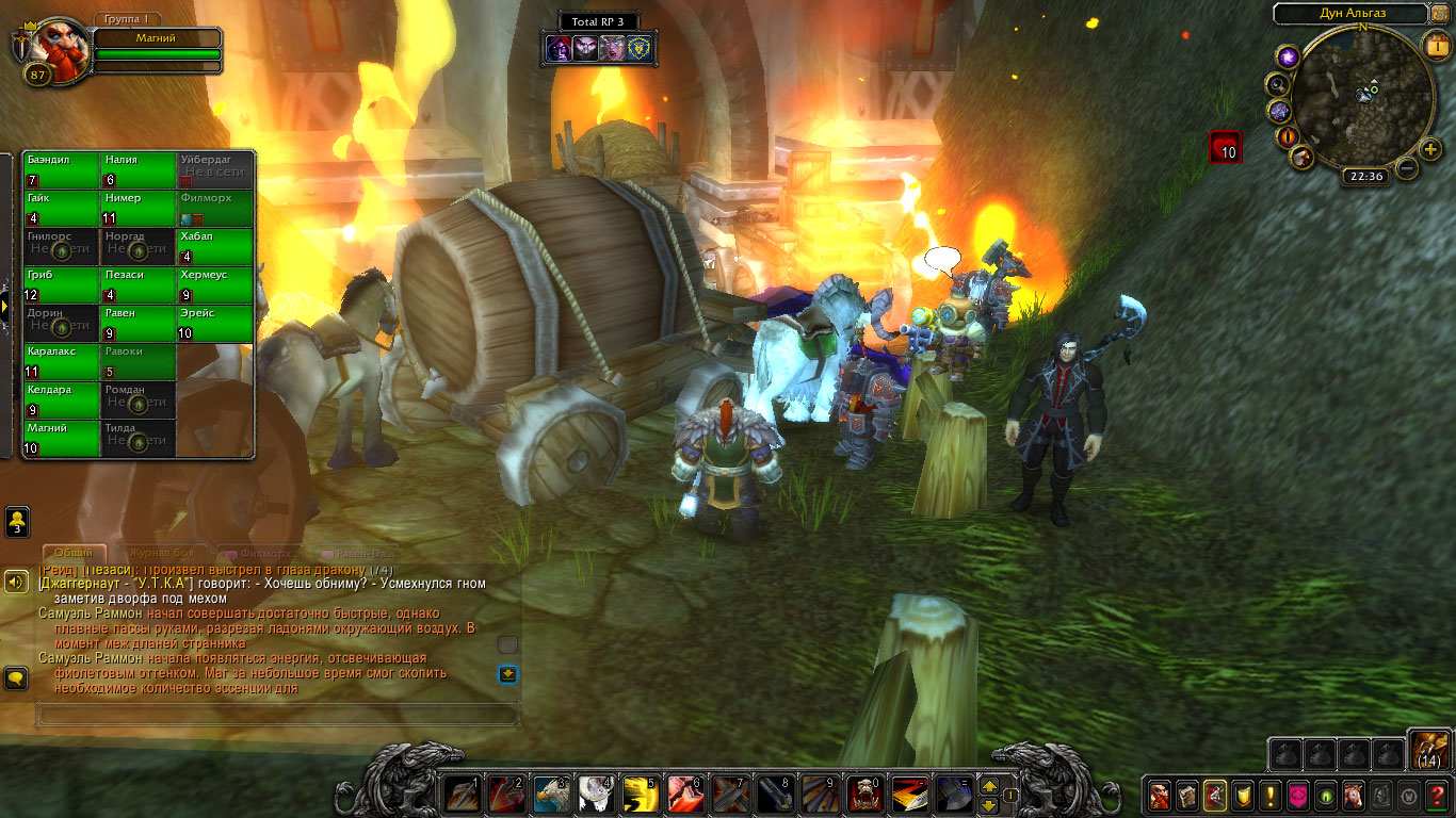 Завязалась битва между дворфами и сторонниками Клана Сумеречного Молота. Одни дворфы сдерживали натиск противника, а вторые спасали мирных жителей. Тан Келдара сдерживала натиск заклинаний противника барьером, которым окутала выход. Поэтому на крышу прохода телепортировалось несколько послушников Сумеречного Молота, которых закидали защитников Каз Модана различным взрывными колбами, открывая огонь из винтовок и огненными заклинаниями. Мирных жителей вывели из опасной зоны горные пехотинцы Дун Альгаза, а отряд дворфов пошли в атаку с новой силой. Перебив большинство культистов, все стали радоваться, а остатки сектантов отступили, призвав перед отходом двух средних по своим размерам сумеречных драконов. Но и на послушников Сумеречного Молота налетели злобные ящеры, которые изувечили множество бойцов, а также неплохо отыгрались на дерзкой ночной эльфийки Налии. Но в итоге их разорвали в клочья гномы с их механизмами, от чего сумеречные драконы попадали вниз и встретились с дворфийским оружием. Кто взял себе шкуру, а кто когти драконов, все двинулись дальше, разгромив баррикады и выходя в Болотину.По пути войско встретило служителя Собора Света в Штормграде, а также огромного грозового великана! Все вместе они прибыли в главный военный лагерь и начали подготовку плацдарма для штурма врат Драконьей Пасти. Но Клан Сумеречного Молота и род сумеречных драконов, ожидают отряд дворфов. Именно по этому силы прислужников Древних Богов сделали шаг назад, отступив основными силами в сторону Горнила Крови и руин дворфийского города Громтара. Тем самым давая шанс отряду дворфов прорваться к Грим Батолу и одержать легкую победу при взятии крепости, ведь сумеречный шёпот, жажда золота могут сделать из друзей врагов, а прислужники Древних Богов с лёгкостью нанесут удар из тени. Когда баталия была завершена и большинство дворфов отправилось спать, Равен задержался. Его интересовали как пострадавшие соратники, так и сумеречные драконы, чья природа была мало кому известна. Конечно, существовали книги, в которых описывались способности этих древнейших существ, чье происхождение было следствием множества различных экспериментов, но подобной литературы было крайне и крайне мало, да и информации было недостаточно. К счастью утомившегося чародея, ранеными занимался жрец из народа дворфов, поэтому одна цель, можно сказать, уже была выполнена; всё свое внимание он сконцентрировал на одном сумеречном драконе, что остался лежать на земле после серьезной баталии. В качестве трофея и предмета изучения Равен забрал глаз рептилии; он нашел свое место в недрах магического хранилища.