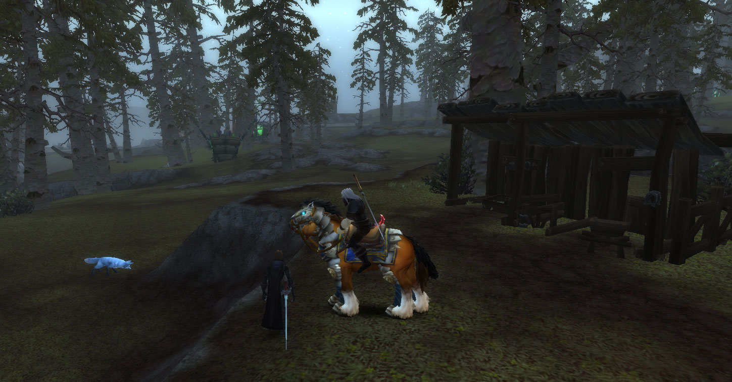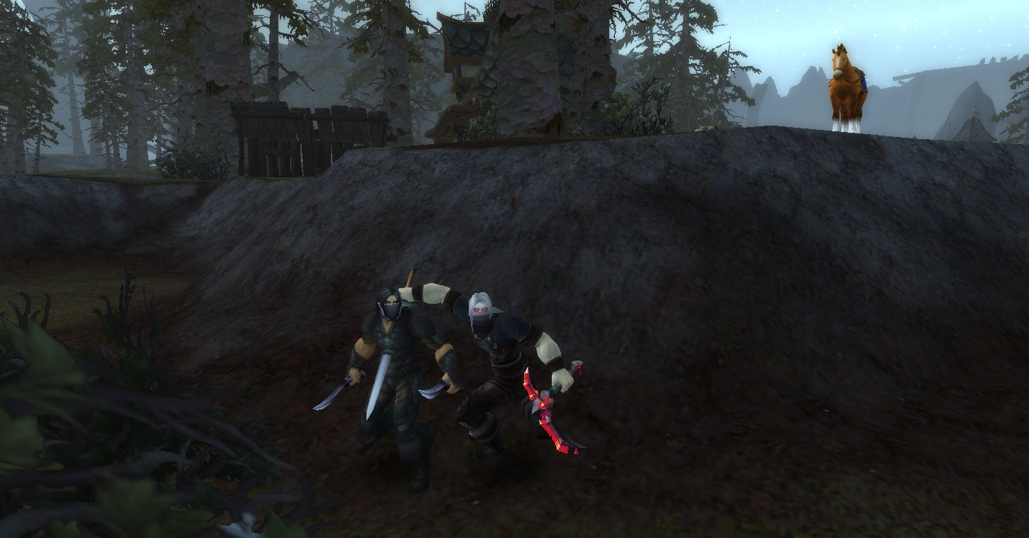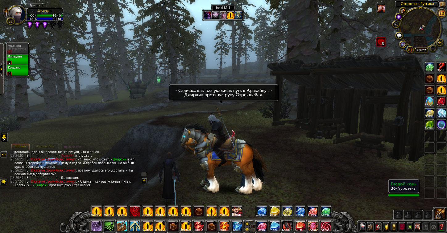 Джардин все это время ожидал послание от Аракайна, который обещал кровопийце дать возможность заполучить своего могучего скакуна смерти. Не то чтобы Джардин так сильно желал чего либо материального, но он привык получать то что заслужил за свою работу. Раздумия не живого прервала отрекшееся, которая заявила, что прибыла за Джардином от Аракайна. Джардин выслушал посланницу и решил проследовать за ней к месту нахождению омраченного. Всю дорогу новые знакомые перемолвились всего лишь парой предложений на подобии: «Ты кто? Откуда? Звать как? Куда идем?» И тому подобные фразочки. Перебравшись на другой берег через реку двое мертвецов встретили веселящегося и пьяного живого человека. Беженца… По нему было видно, что тот перебрал с алкоголем и не осознавал, что перед ним стоят два живых ходячих мертвеца. Однако убийцы не спешили того убивать ибо по его словам неподалеку есть его товарищи, а это значит, что если потенциальная жертва поднимет шум, то не мертвым придется разбираться с группой живых. На выживание подобный расклад мизерный, поэтому Джардин попытался припугнуть пьянчугу вымышленным чудовищем бродящим близ этих мест.