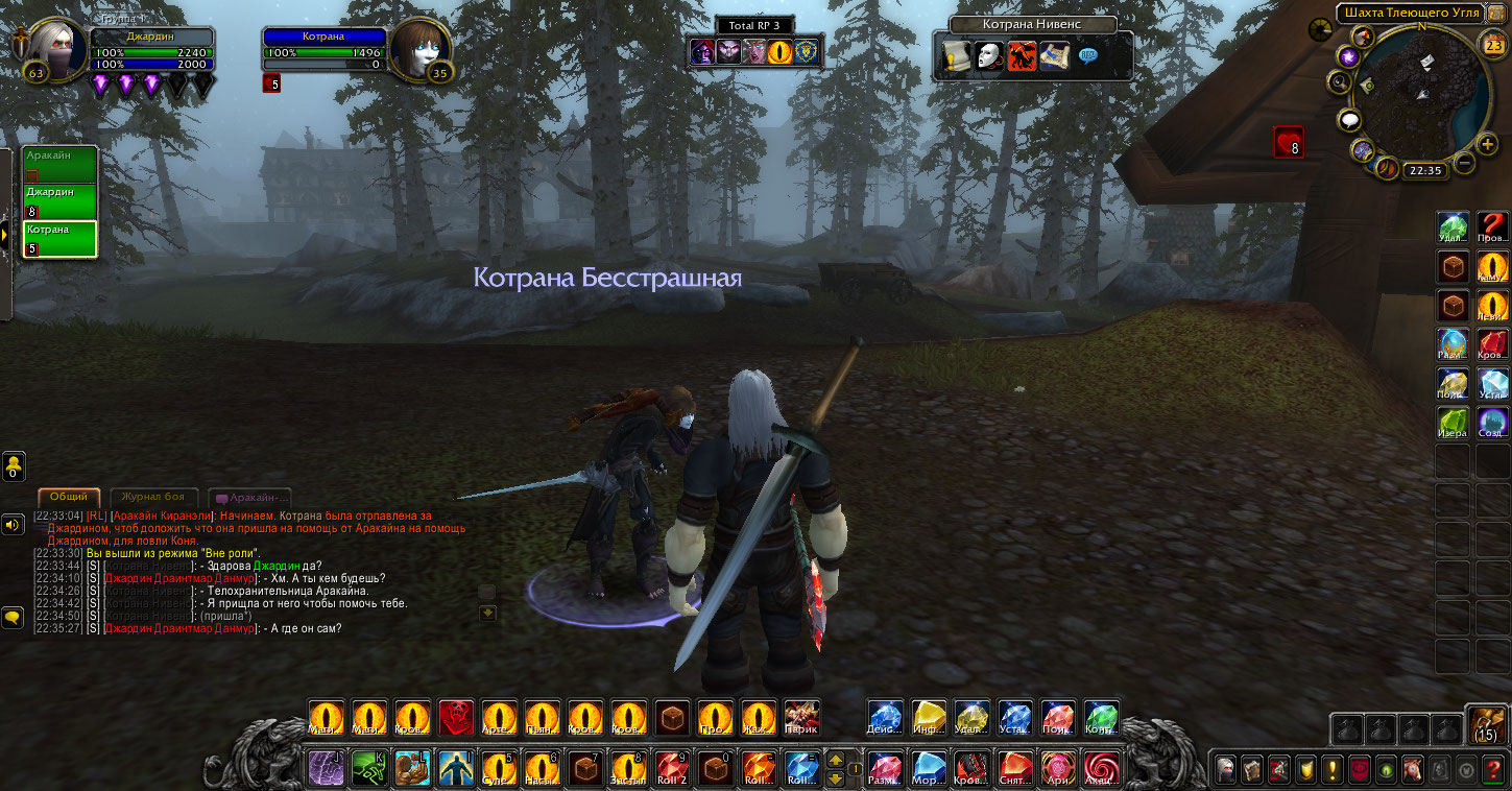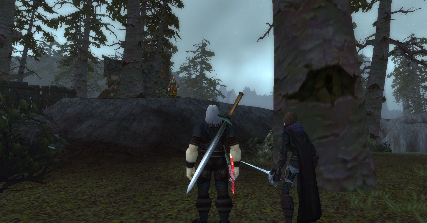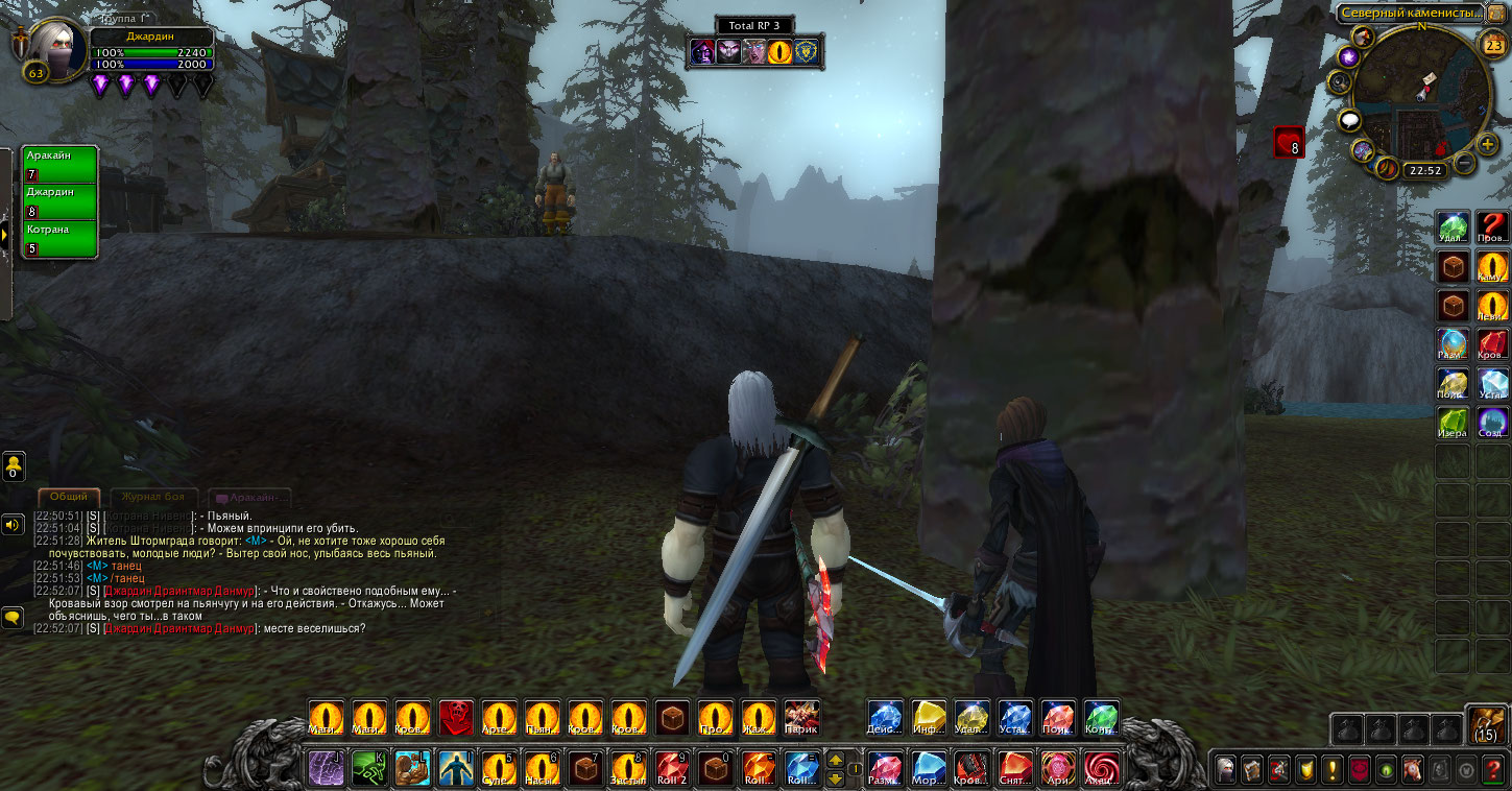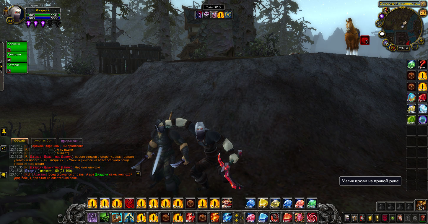 Джардин все это время ожидал послание от Аракайна, который обещал кровопийце дать возможность заполучить своего могучего скакуна смерти. Не то чтобы Джардин так сильно желал чего либо материального, но он привык получать то что заслужил за свою работу. Раздумия не живого прервала отрекшееся, которая заявила, что прибыла за Джардином от Аракайна. Джардин выслушал посланницу и решил проследовать за ней к месту нахождению омраченного. Всю дорогу новые знакомые перемолвились всего лишь парой предложений на подобии: «Ты кто? Откуда? Звать как? Куда идем?» И тому подобные фразочки. Перебравшись на другой берег через реку двое мертвецов встретили веселящегося и пьяного живого человека. Беженца… По нему было видно, что тот перебрал с алкоголем и не осознавал, что перед ним стоят два живых ходячих мертвеца. Однако убийцы не спешили того убивать ибо по его словам неподалеку есть его товарищи, а это значит, что если потенциальная жертва поднимет шум, то не мертвым придется разбираться с группой живых. На выживание подобный расклад мизерный, поэтому Джардин попытался припугнуть пьянчугу вымышленным чудовищем бродящим близ этих мест.