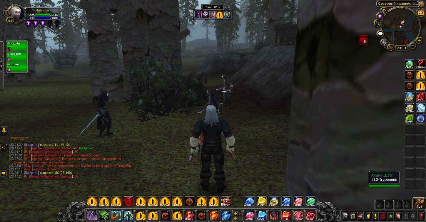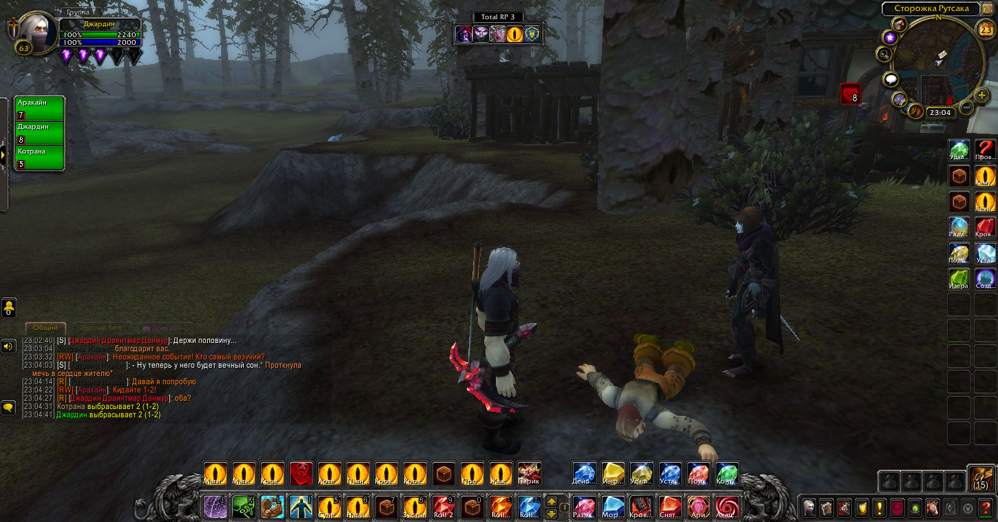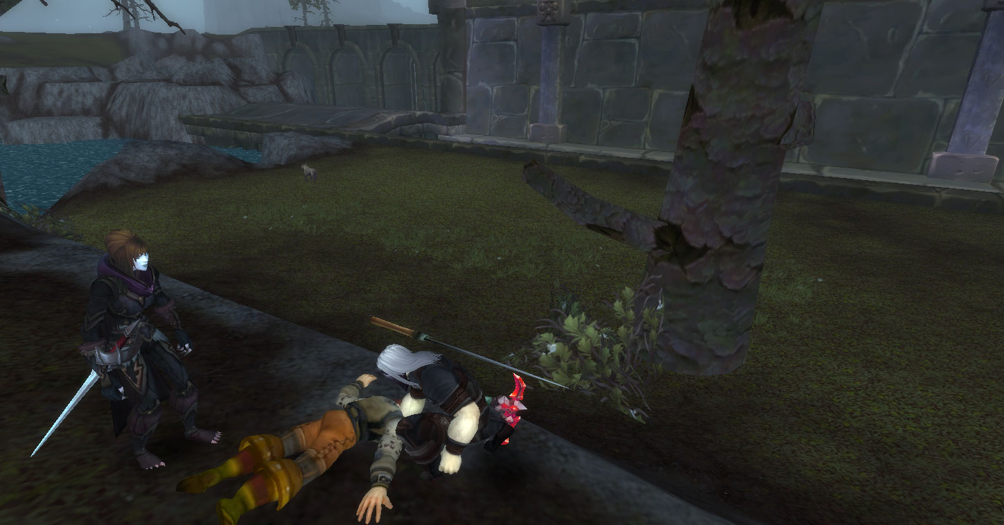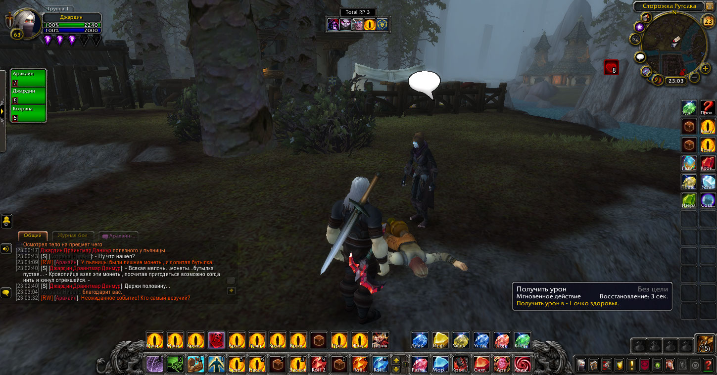 Зря пришлось думать над историей про какого-то чудища ибо пьяный человек после начала рассказа улегся на землю и захрапел с глупой ухмылкой на лице. Кровопийа вместе с отрекшейся обшарили человека и смогли найти какие-то монеты в его карманах и пустую бутылку отличного «Бурбона». После обыска не живая девушка перерезала глотку спящему и поспешила в кусты когда услышала приближение еще нескольких личностей. Кровопийца поступил примеру своей напарницы и затаился за деревом, но при этом держа свое вооружение уже наготове. Двое человек в черном обмундировании походившим на бандитское увидели мертвого товарища и насторожились. Шелест кустов привлек внимание людей, и именно в этих кустах сидела отрекшаяся. Джардин решил использовать данный момент и выйдя из своего укрытия швырнул свою косу в одного из людей. Коса вонзилась в торс дальнего воителя тяжело того ранив. Второй перевел свое внимание на кровопийцу и швырнул в того гранату дабы взорвать того. Однако Джардину хватило ловкости дабы избежать броска и вышвырнуть гранату подальше от себя.