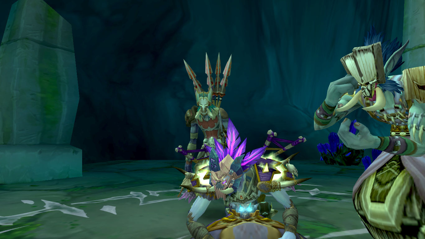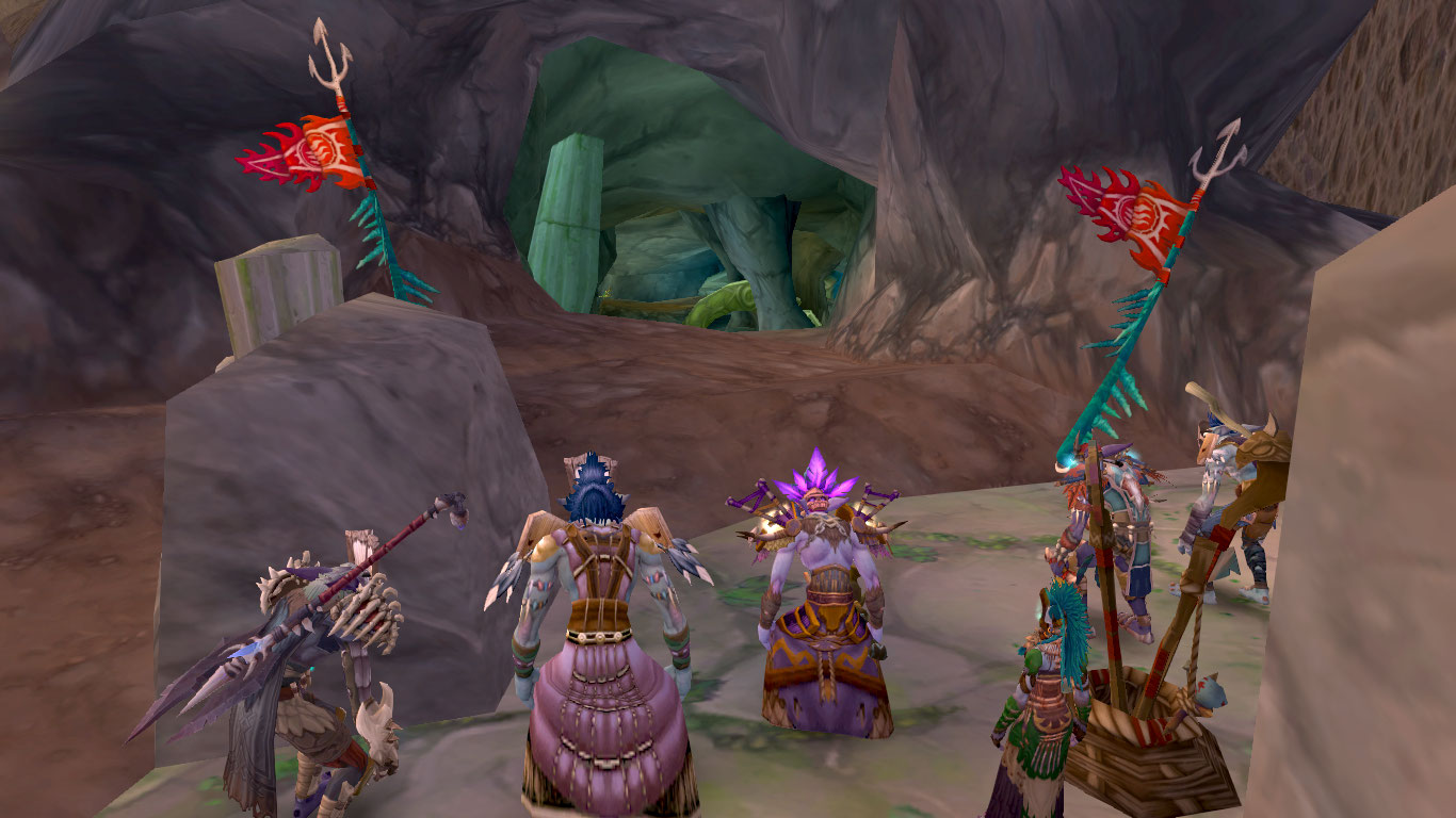 Стоя у входа мы услышали до жути знакомый звук – «Мргл-мургл-мерлг» – разлетевшийся эхом по всей округе. Зул'Тиман и его ученики остались ждать, пока наш отряд расчистит весь путь до глубин подземелья, на котором мы повстречали нескольких наг и мурлоков. Последние были побеждены с помощью простой, но эффективной тактики-обмана. За поворотом был размещён змеиный идол, а ничего не подозревавшие мурлоки наивно следовали за светящимися огоньками, призванными Зул'Дамунди. Как только идол заметил этих жалких «рыб», так сразу начал поливать их огнём. Тен'Ай встал на единственном пути к отступлению, а я бросил пару копей в мурлоков. Они были побеждены и пещера расчищена.