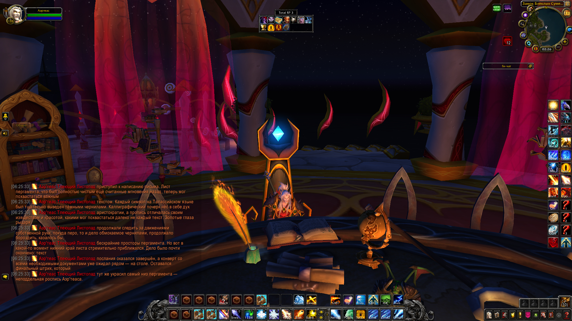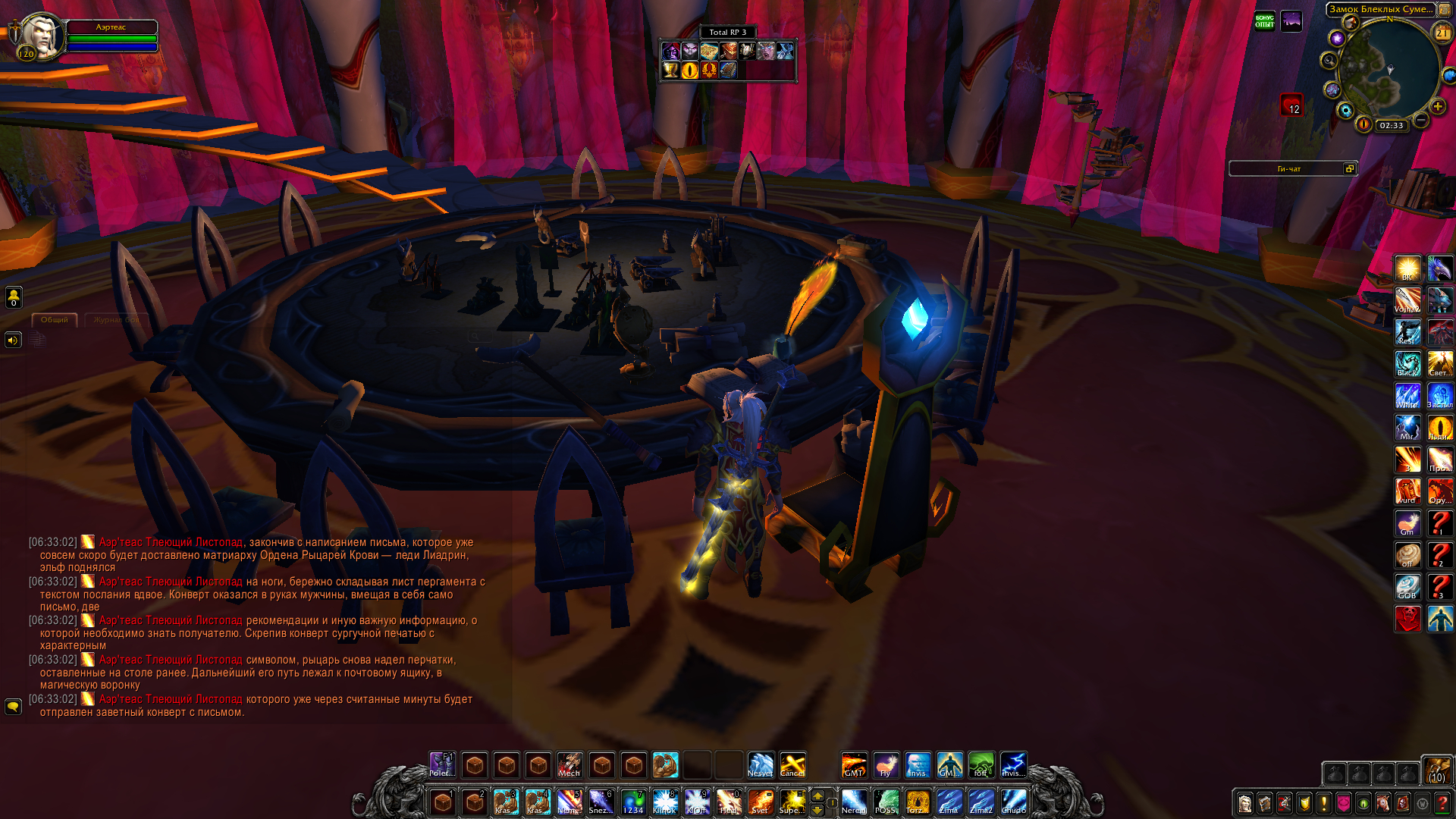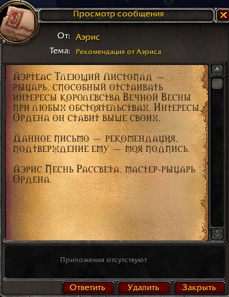 — Аэр'теас написал письмо леди Лиадрин, в котором доложил о своих заслугах перед Орденом Рыцарей Крови, народом син'дорай и всем Королевством Кель'Талас, а также запросил возведение в звание мастера-рыцаря. Эльф отправил послание и получил ответ.