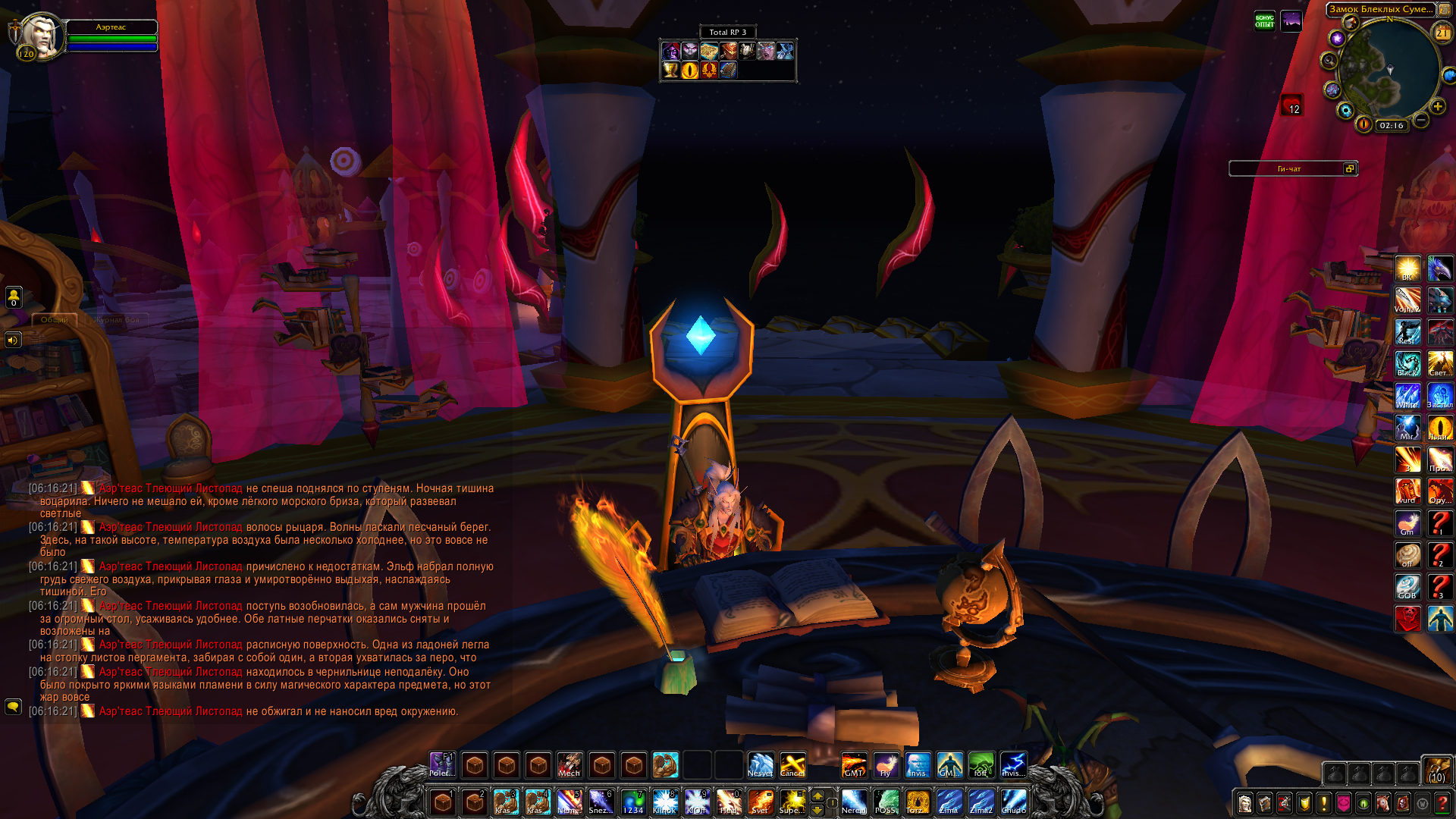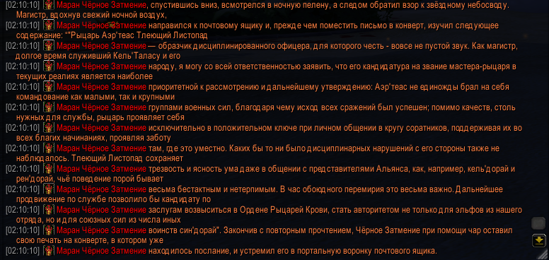 Подтверждением моих слов, кроме вышеизложенной отчётности, послужат рекомендации не менее почётных чинов. Маран Чёрное Затмение, герой и магистр Кель'Таласа, а также Ордена Похитителей Солнца, является автором одной из них. Вторая же написана от руки Аэриса Песни Рассвета, мастера-рыцаря Ордена Рыцарей Крови, который так же представляет наш орден в рядах Ревнителей Солнца, как и я.
