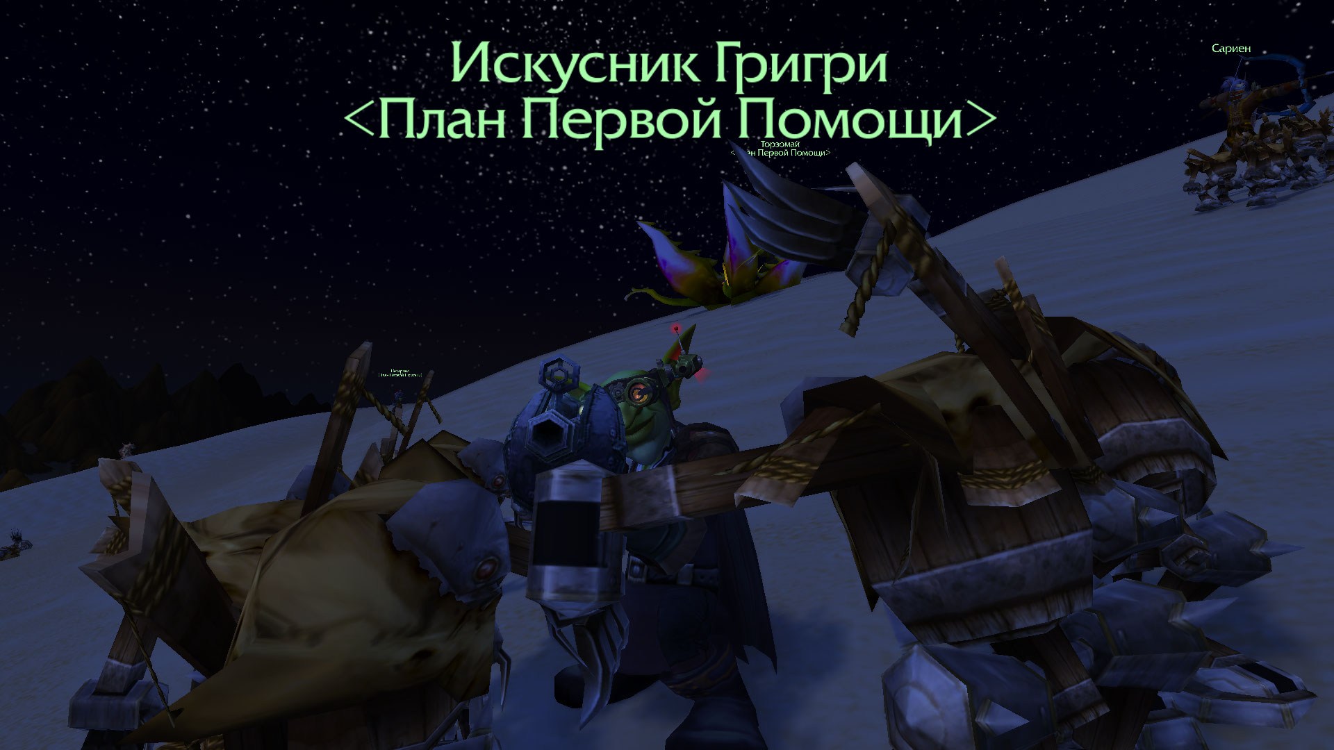 машин, безуспешно отстреливаясь от тех луком со стрелами. На помощь остроухому пришел Торзомай. Друид перевоплотился в крупного древня, сконцентрировав свои силы на израненном теле ночного эльфа. Прикрывала тех гоблинша Карина, занимающая позицию снайпера в этой битве. Она отстреляла всех подошедших к друиду роботов, позволяя беспрепятственно перенести раненого Сариена.