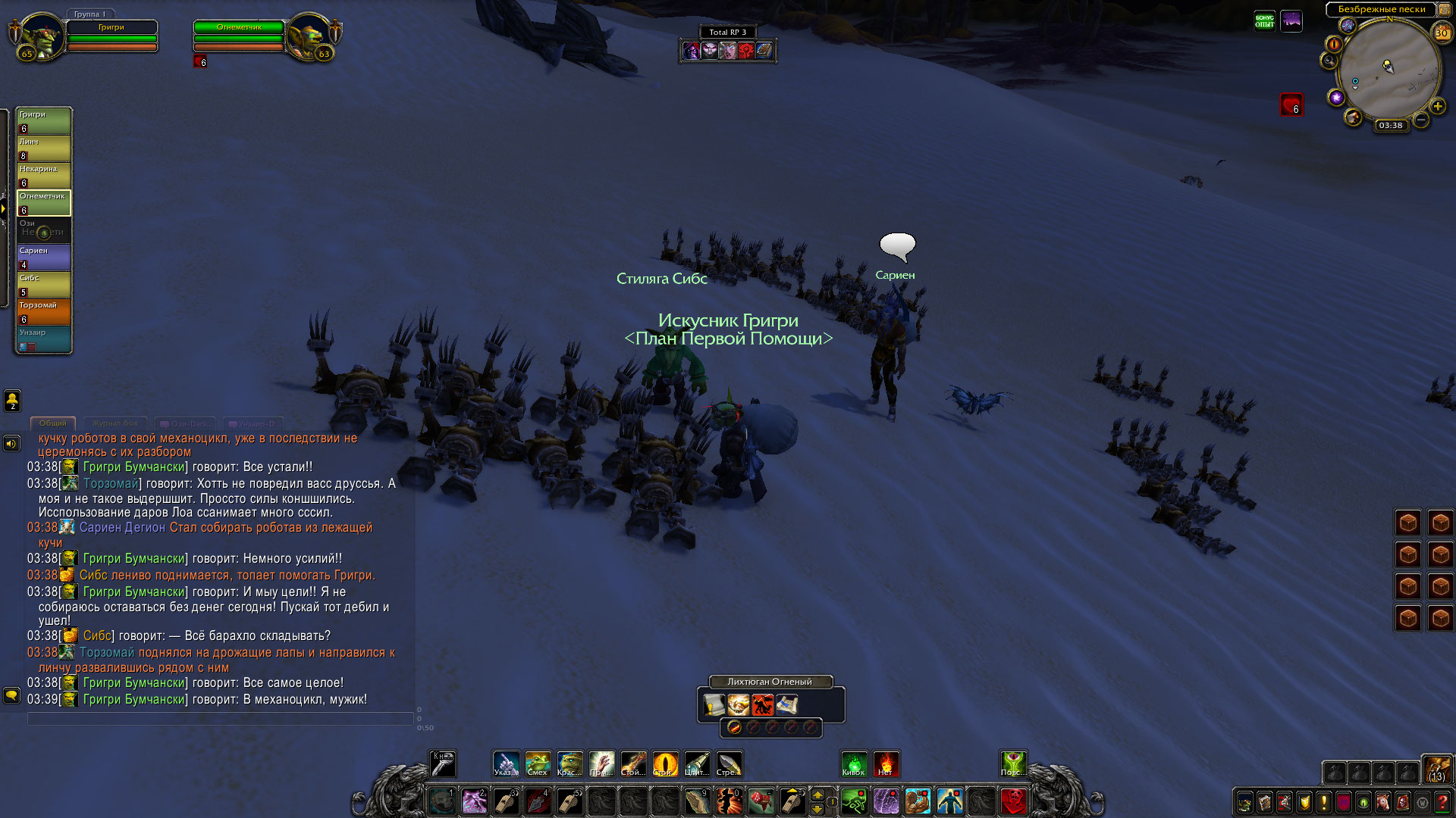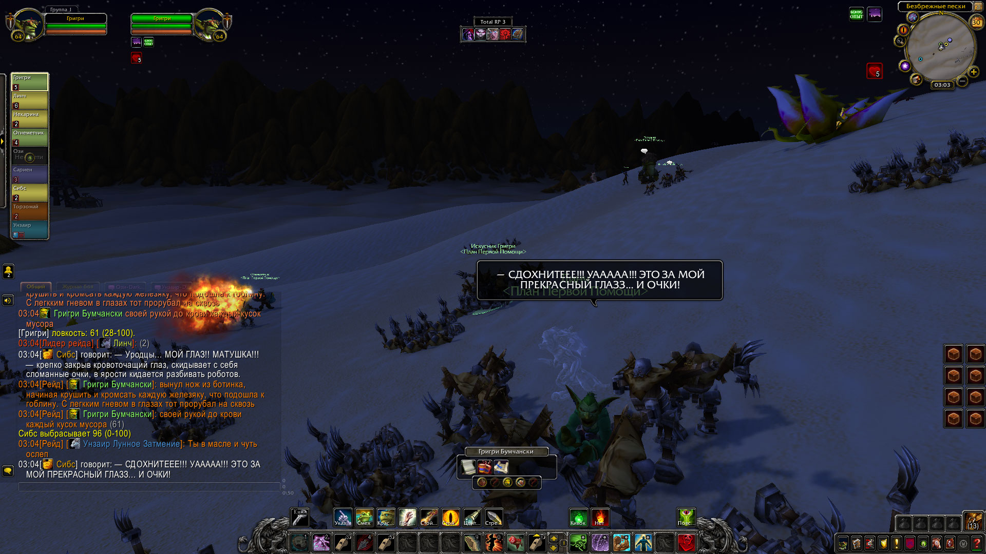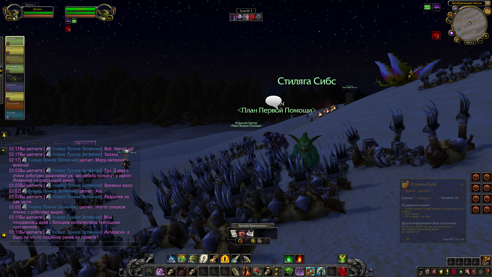 Прибамбасская ночка обещала быть жаркой. Группа отважных наемников, гонимых по пустыне Танарис в поисках наживы собрались в местной таверне «Воин дороги». Собрал компашку предприимчивый гоблин Григри, получавший весьма ценные сведения от своего информатора. Удалось же собрать гоблину вместе: ловкача вульпера Линча, работавшего подмастерьем у Григри, огнеметчика Лихтюгана Огненного, вечно ходящего на перевес со своим пламеметом, жаждущего наживы, амбициозного гоблина стилягу Сибса, юную гоблиншу-инженера Карину, друида Торзомая, занимающего уверенную позицию лекаря команды и слепого эльфа-путника Сариена, не работавшего на ППП в тот момент.