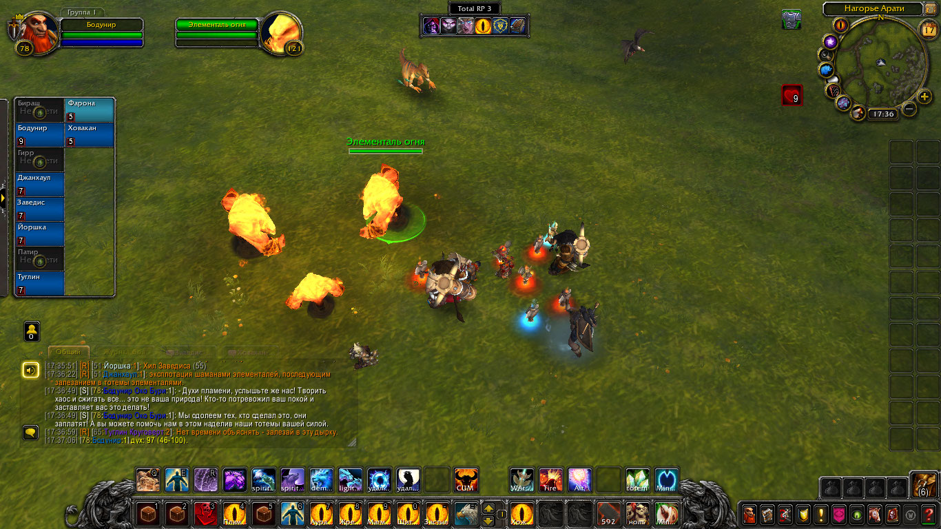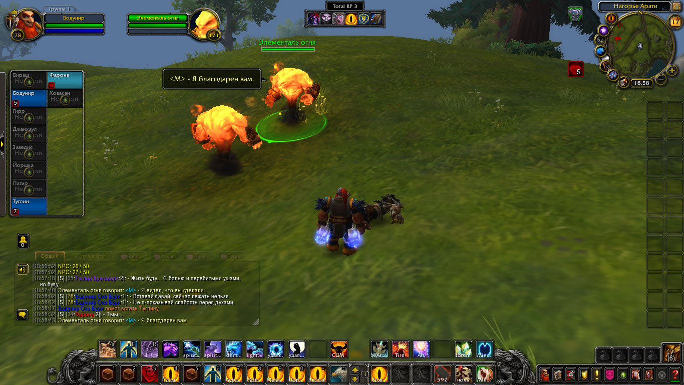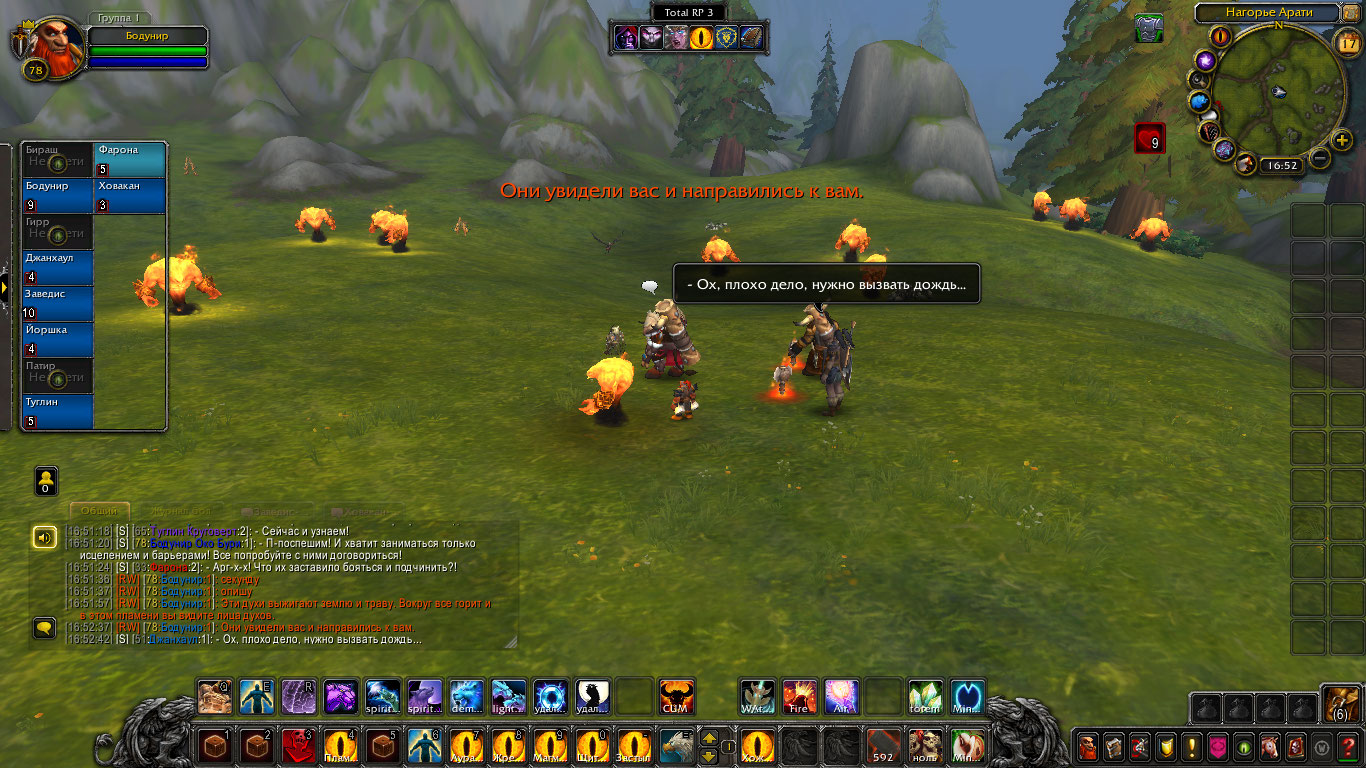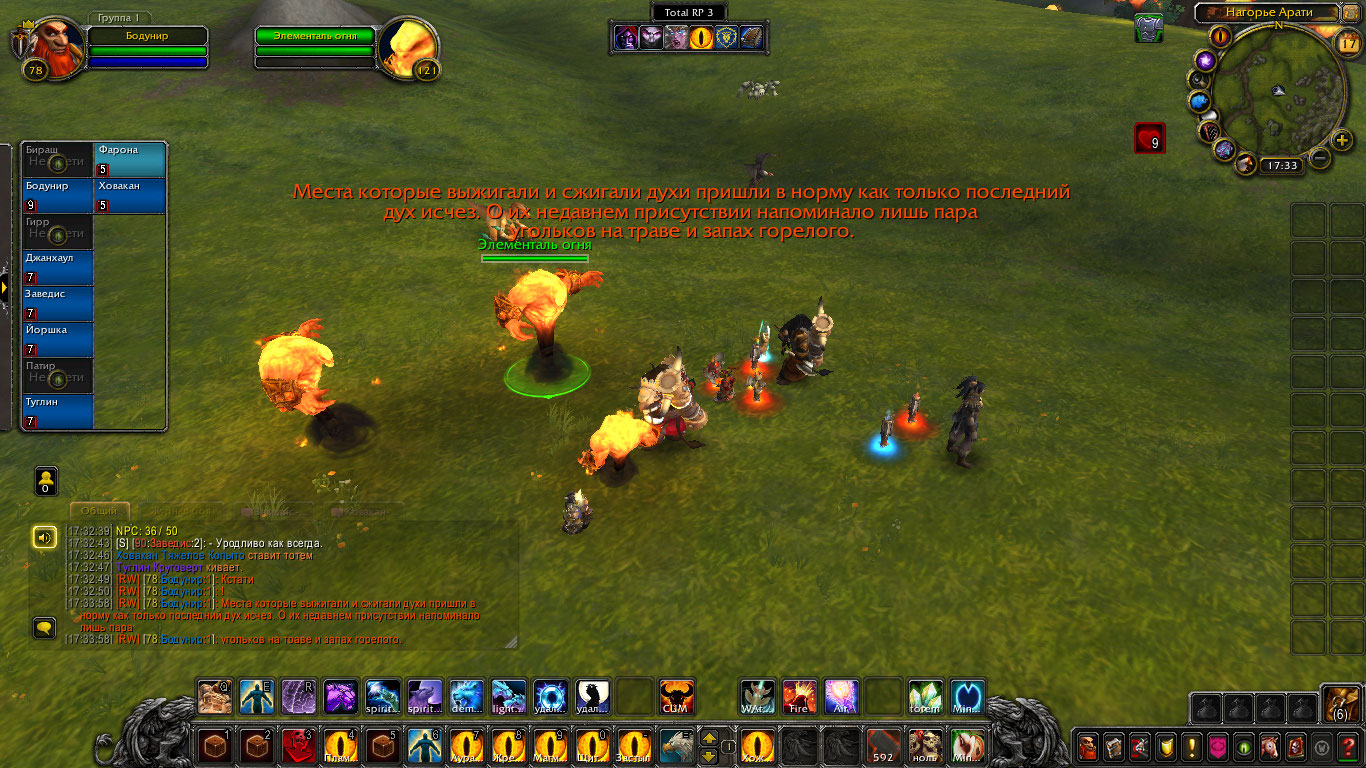 Шаманам пришли вести о новых волнениях стихий с Нагорья Арати. Говорилось что-то о частых пожарах и тряске земли. Связанным духами необходимо было проверить выяснить всё и устранить проблему. Прибыв туда они вскоре наткнулись на пожарища. Дерево, трава, земля, их выжигало пламя, а в нем они могли увидеть гневные лица духов. Их задачей было утихомирить пожары силой или договорившись и по возможности выяснить, что лишило их покоя и вынудило все это делать. Так же Бодунир предложил воспользоваться ситуацией и наполнить тотемы огня силой, зарядить их. Дворф вышел вперед, установил рядом тотем огня и воззвал к духам. Он сказал, что их природа и предназначение — дарить уют и тепло в очагах, дарить свет факелов и им же уберегать нас от тьмы. Но не сеять хаос и сжигать всё. Дворф воззвал к их благоразумию и предложил им помочь и вместо того чтоб сжигать огнем всё, наполнить этим огнем их тотемы дабы помочь в их миссии сохранения баланса. Один элементаль и правда пришел в себя и наполнил тотем шамана, но остальные два были были в гневе от того что их лишили покоя.