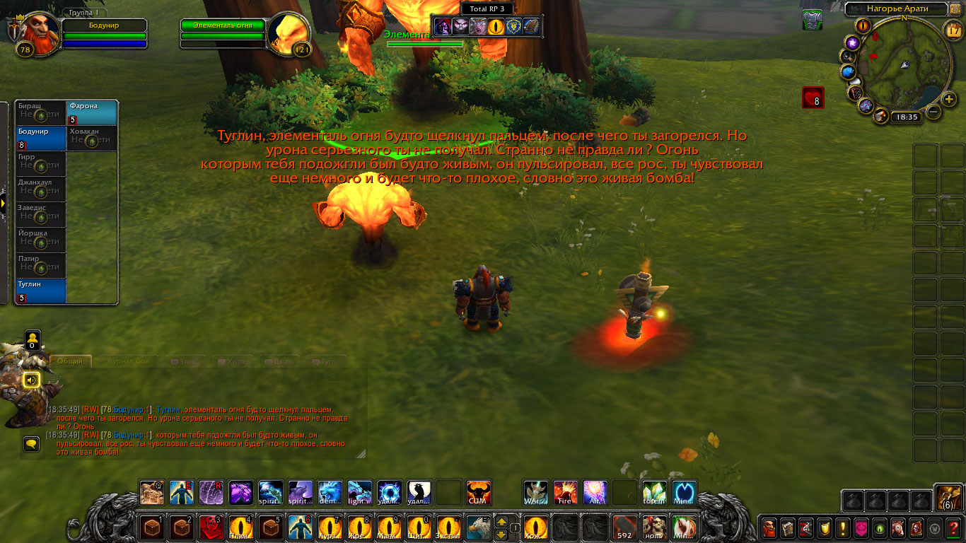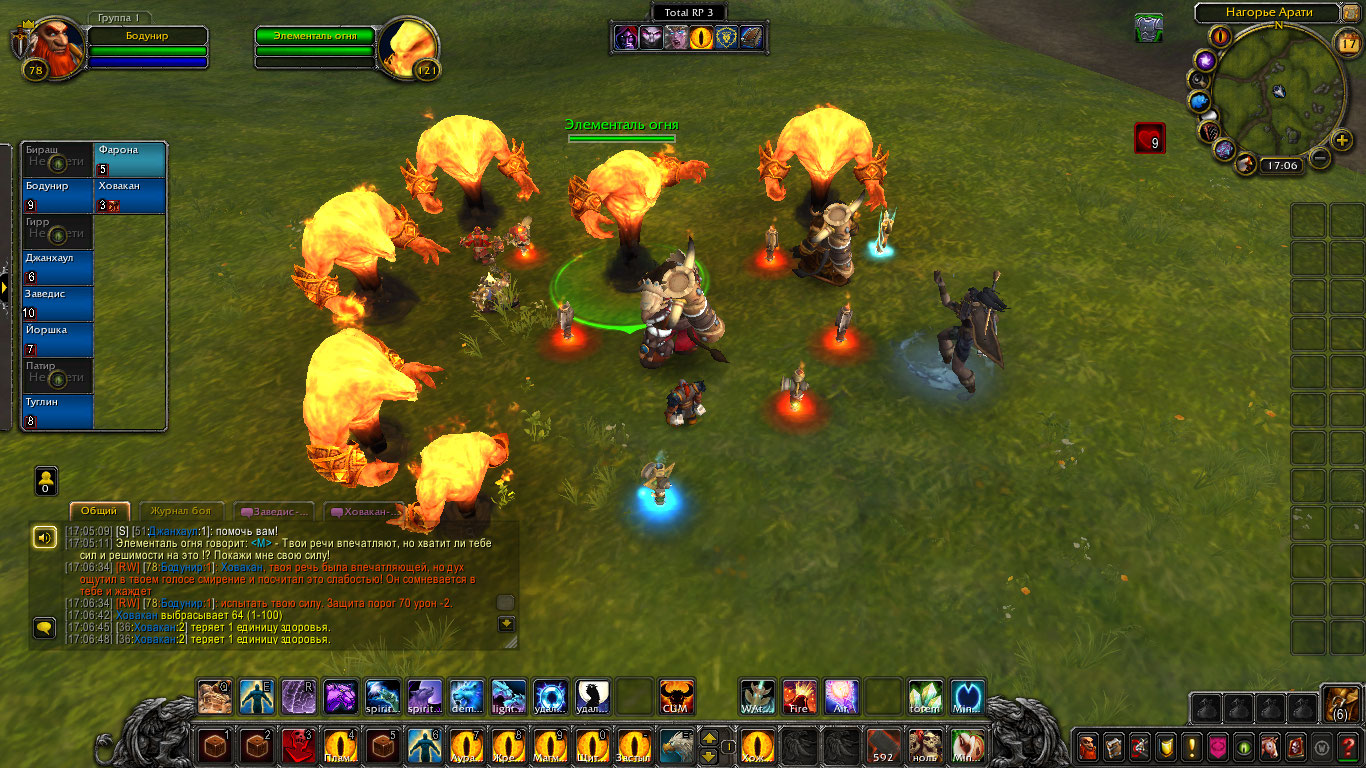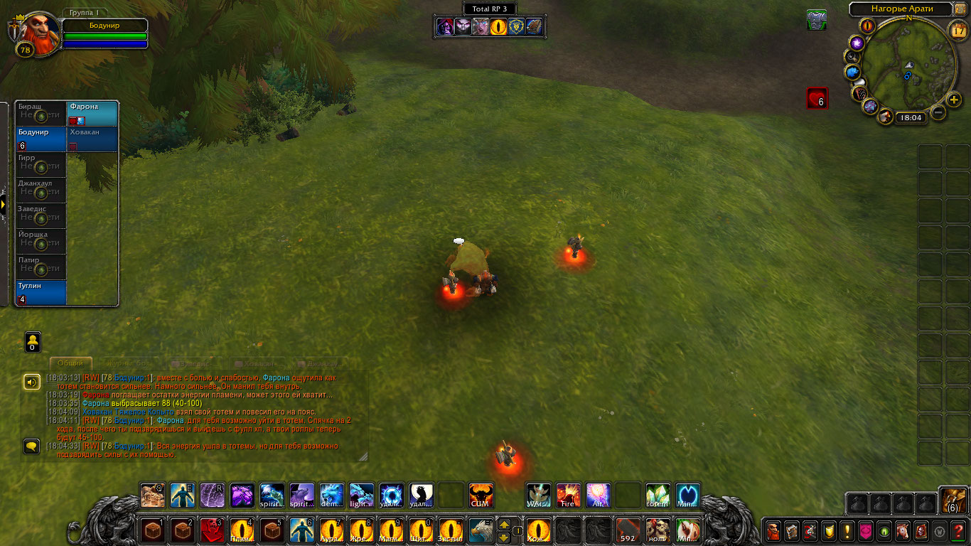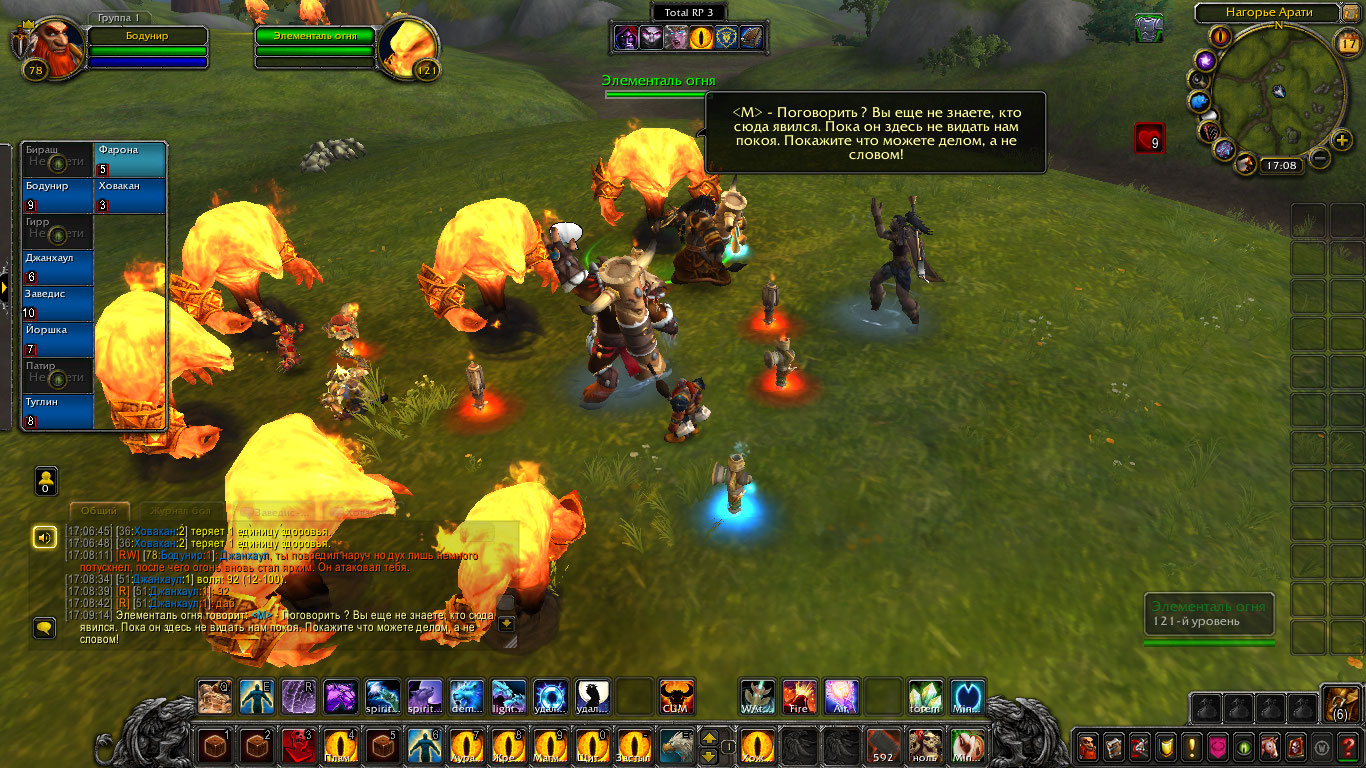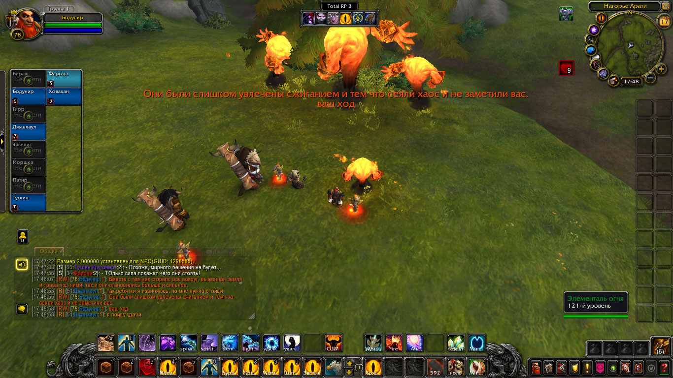 Шаманам пришли вести о новых волнениях стихий с Нагорья Арати. Говорилось что-то о частых пожарах и тряске земли. Связанным духами необходимо было проверить выяснить всё и устранить проблему. Прибыв туда они вскоре наткнулись на пожарища. Дерево, трава, земля, их выжигало пламя, а в нем они могли увидеть гневные лица духов. Их задачей было утихомирить пожары силой или договорившись и по возможности выяснить, что лишило их покоя и вынудило все это делать. Так же Бодунир предложил воспользоваться ситуацией и наполнить тотемы огня силой, зарядить их. Дворф вышел вперед, установил рядом тотем огня и воззвал к духам. Он сказал, что их природа и предназначение — дарить уют и тепло в очагах, дарить свет факелов и им же уберегать нас от тьмы. Но не сеять хаос и сжигать всё. Дворф воззвал к их благоразумию и предложил им помочь и вместо того чтоб сжигать огнем всё, наполнить этим огнем их тотемы дабы помочь в их миссии сохранения баланса. Один элементаль и правда пришел в себя и наполнил тотем шамана, но остальные два были были в гневе от того что их лишили покоя.