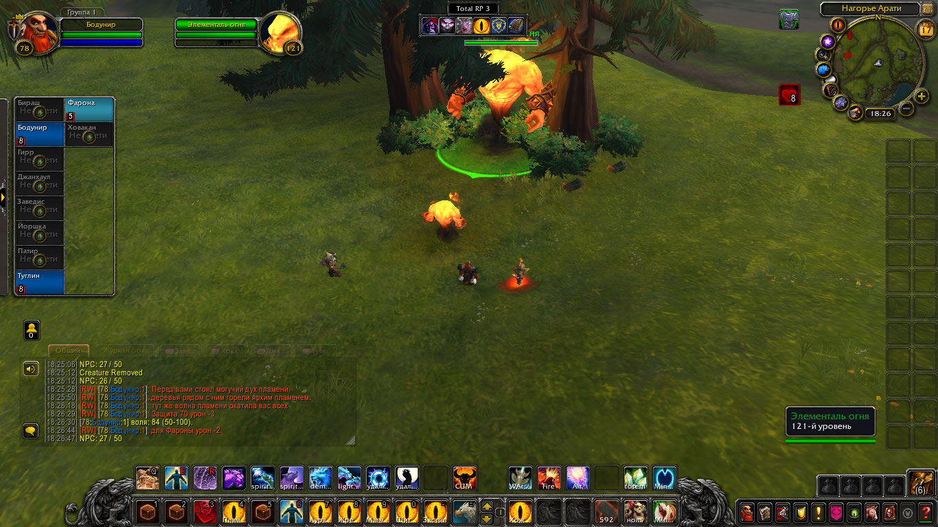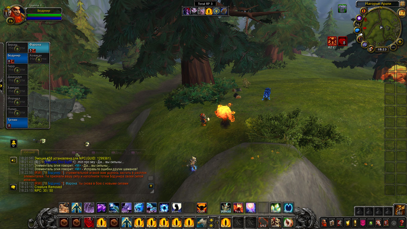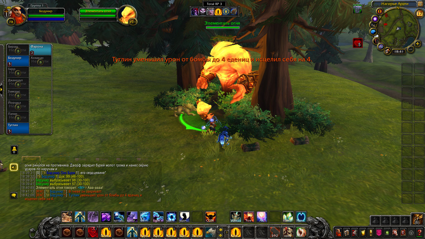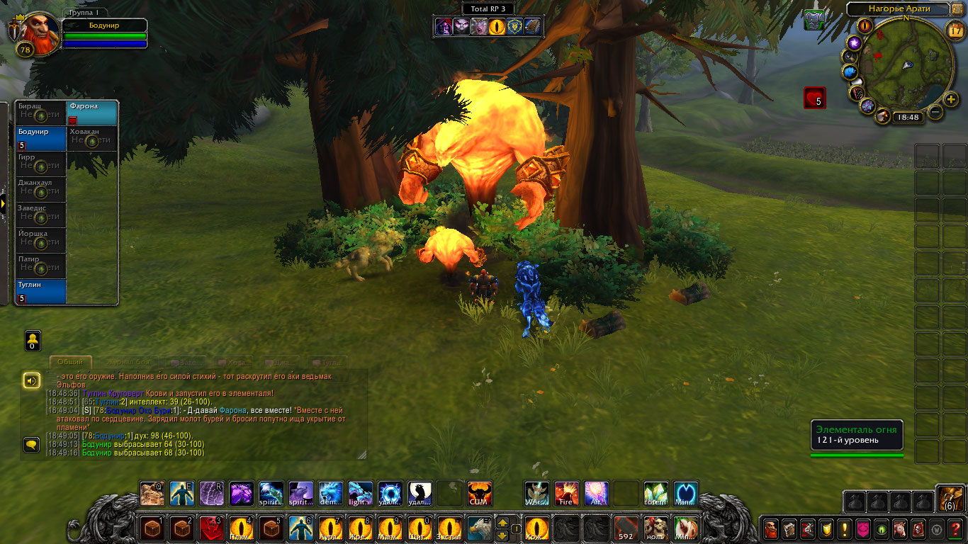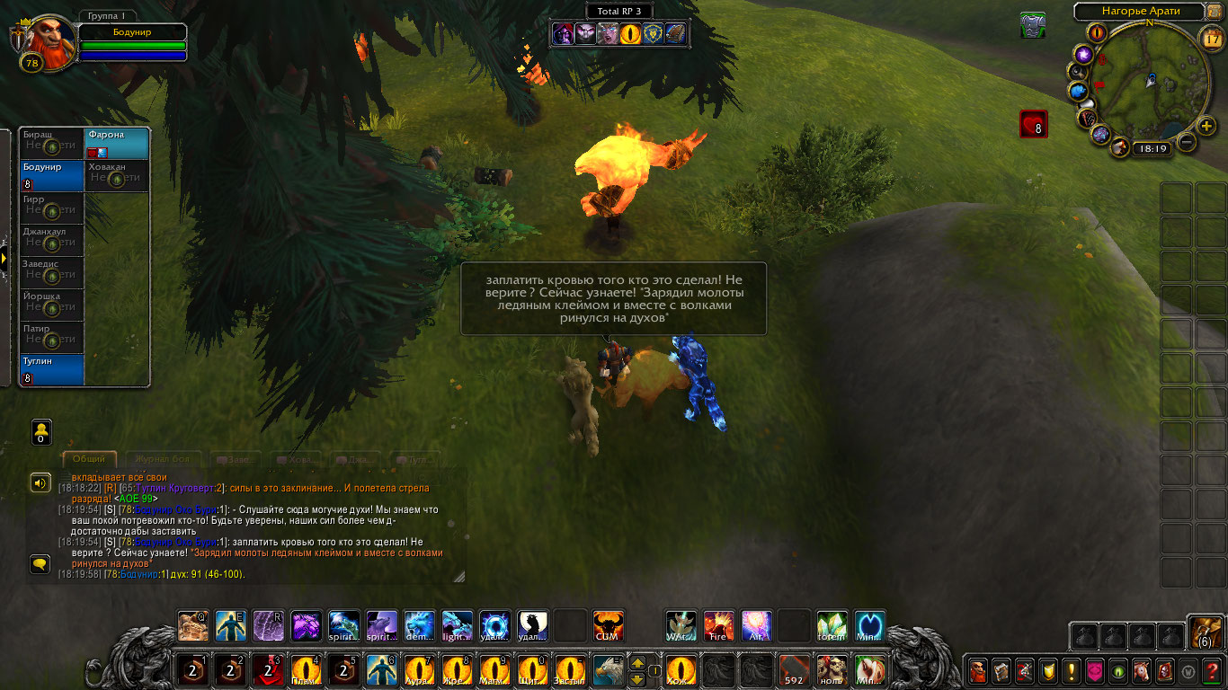 Дальше они продвинулись к лесу который частично уже был охвачен пламенем. Одно из деревьев уже обгорело и обуглилось, а неистовые духи сжигали все, и траву и землю. На глазах шаманов они поглощали пламя и становились больше и сильнее. Они были слишком увлечены тем что сжигали все и сеяли хаос и не заметили приближения шаманов, чем они и воспользовались. Туглин поразил троицу могучей цепной молнией, а дворф зарядил оружие ледяным клеймом и хорошенько вдарил по самому здоровому. Фарона и Ховакан так же показали себя во всей красе. Дворф требовал чтобы они перестали сеять хаос и одумались как и Ховакан. Но теперь они понимали, что им нужны не только слова но и показать что они могут на деле. Потому они не только договаривались, но и бились. Духи были впечатлены силой, но теперь были нестабильны, энергия переполняла их, а теперь они не могли ее сдержать. Бодунир был ближе всех к ним и Фарона поспешила заградить собой Бодунира дабы спасти его и у нее это получилось. Из элементалей вышли потоки жара и пламени, что не щадили никого, мгновенно трава и земля была сожжена и обуглена, а шаманы едва пережили это. Фарона так же тускнела. Но троица переполненных энергией духов успели часть своей силы использовать чтобы зарядить тотем Бодунира энергией. Фарона так же поглотила какую-то часть их сил. Но она была обессилена. С другой же стороны, хоть она и находилась на грани, она чувствовала что тотем переполнен энергией и в нем она сможет набраться сил и восстановиться, так она и сделала укрывшись в нем.