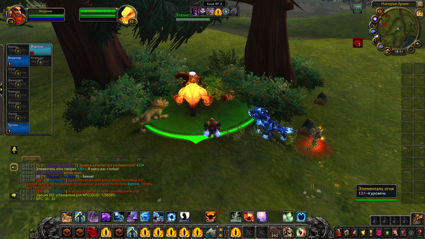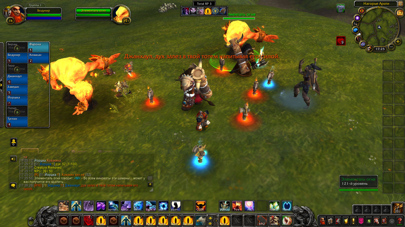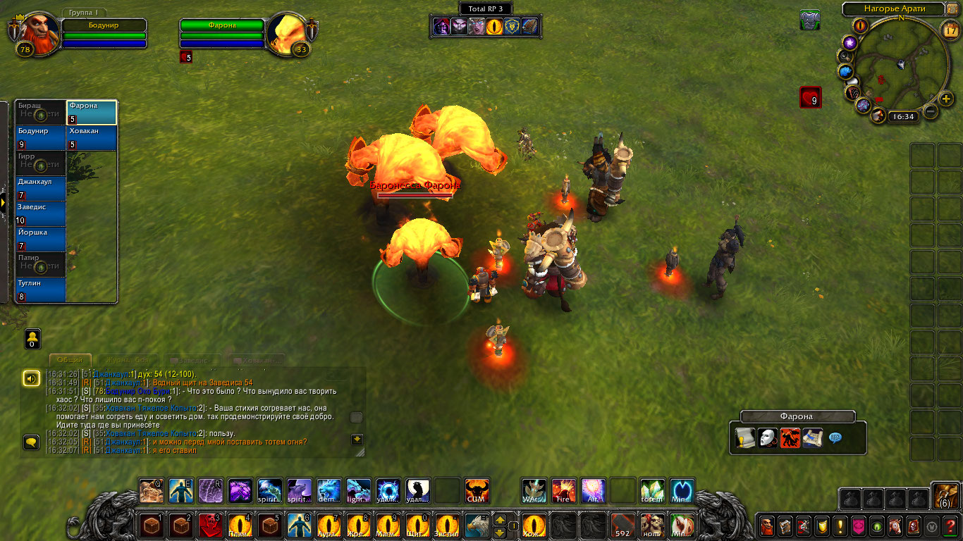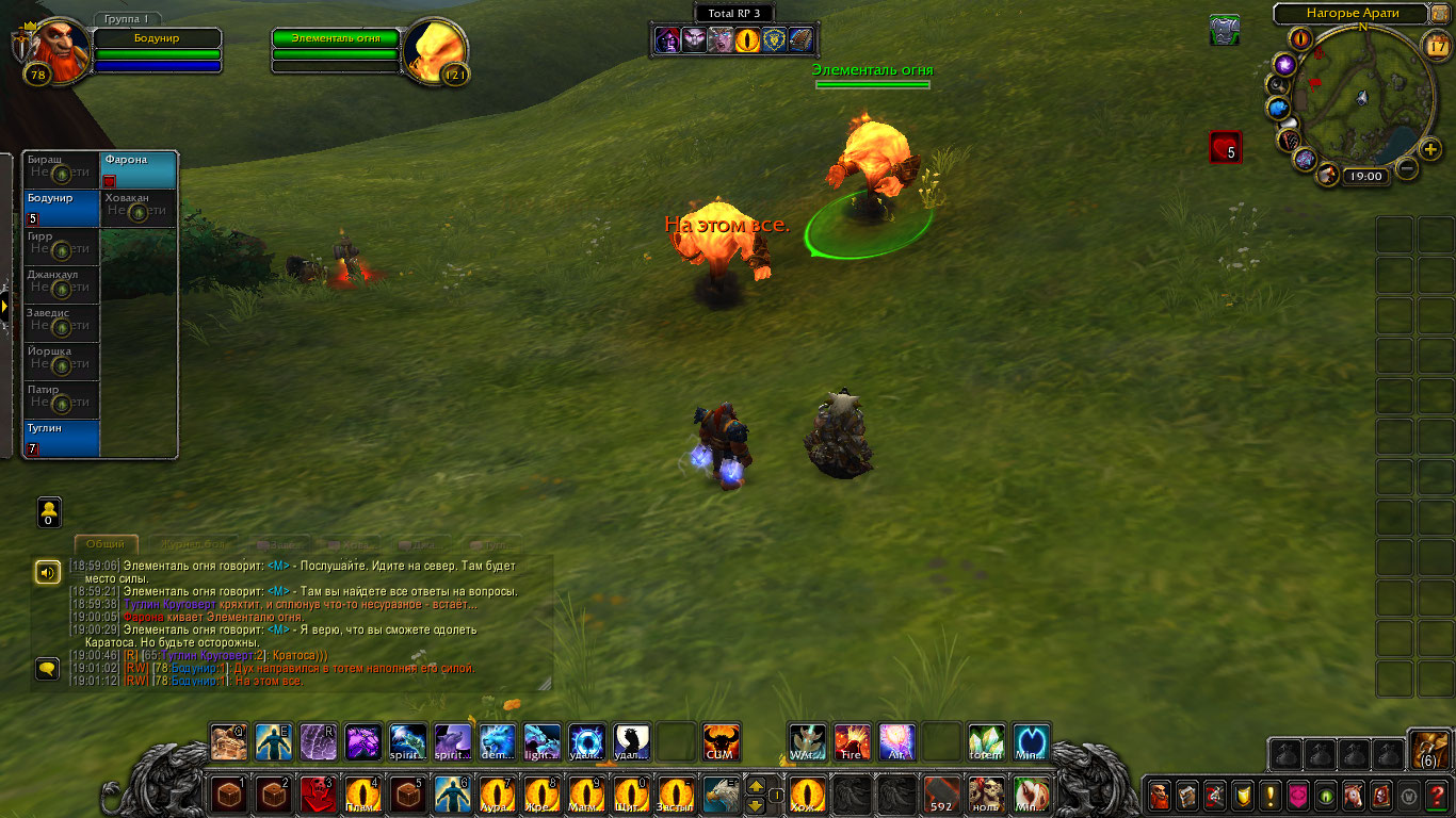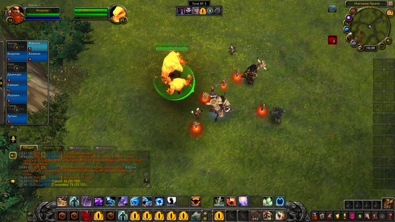 Другие же напали на Туглина и Бодунира, но тем удалось защититься. Бодунир призвал из тотема элементаля огня Фарону дабы тапомогла. Ховакан сумел договориться с одним, привести его в чувство и тот наполнил своей силой его тотем. Оставшийся же элементаль был зол, Фарона пыталась выяснить что стряслось, но тот чувствуя скорую гибель ринулся в толпу шаманов и взорвался, а его остаточная энергия была поглощена тотемами шаманов.
