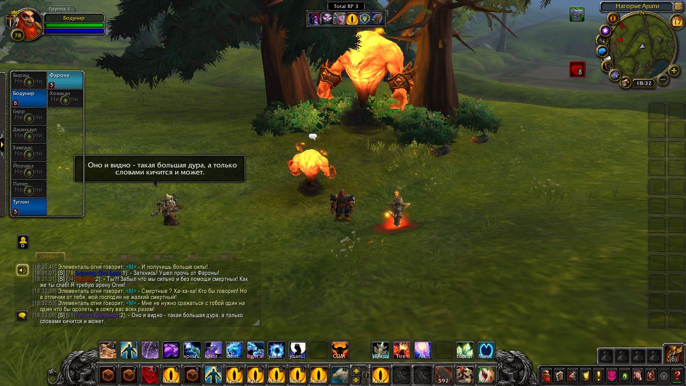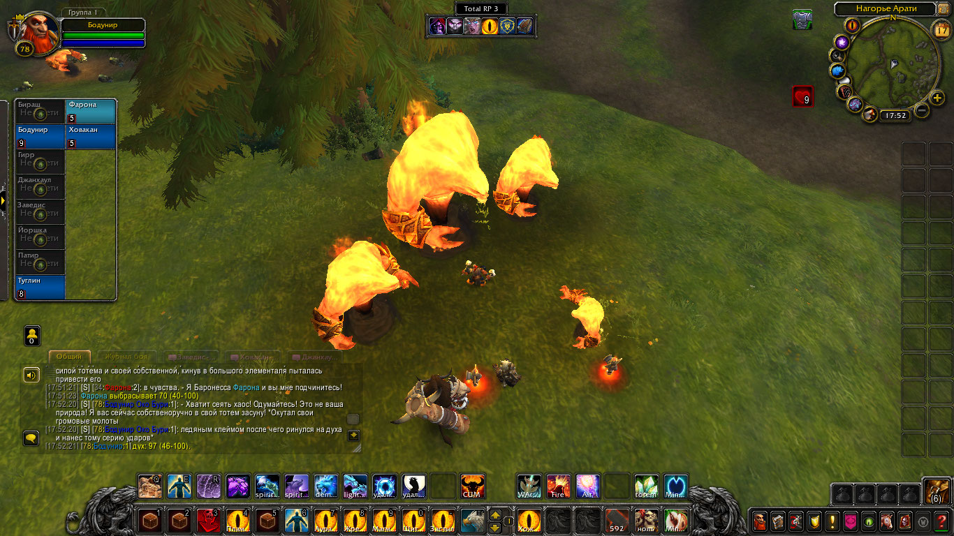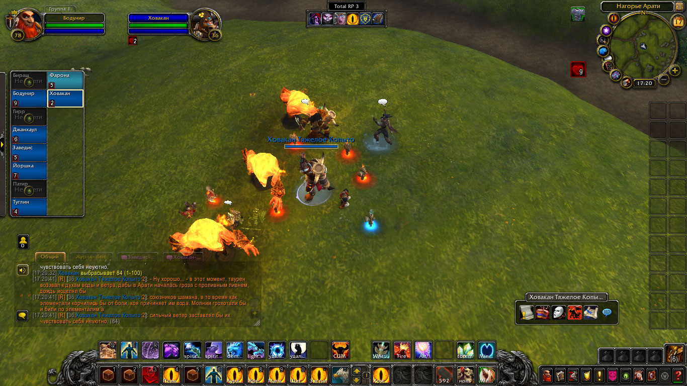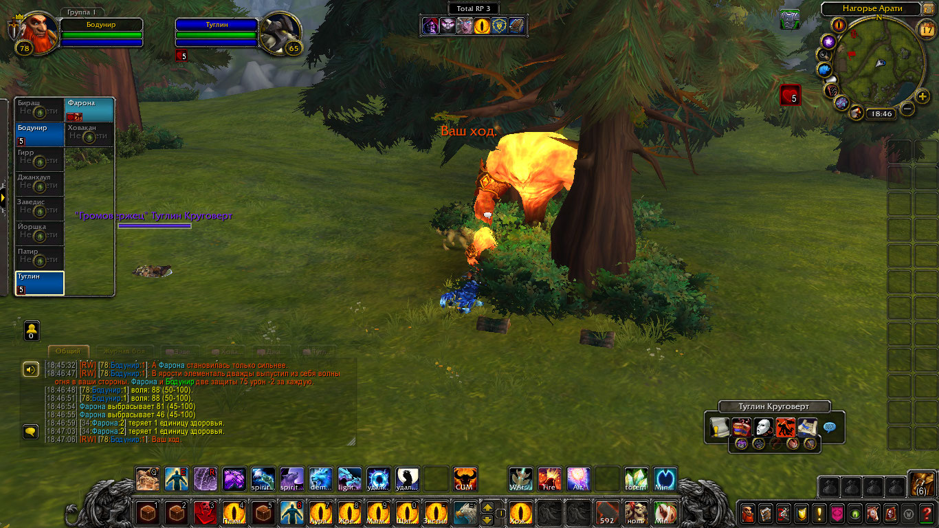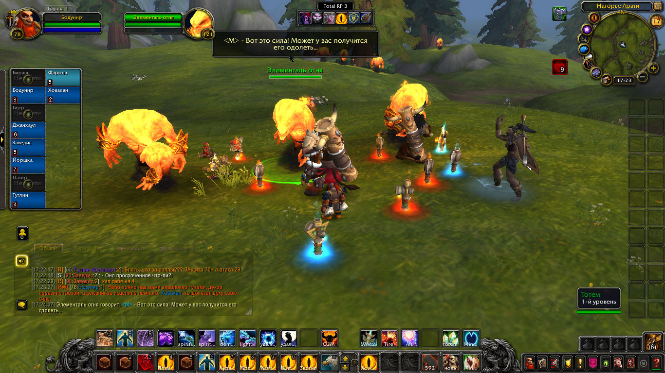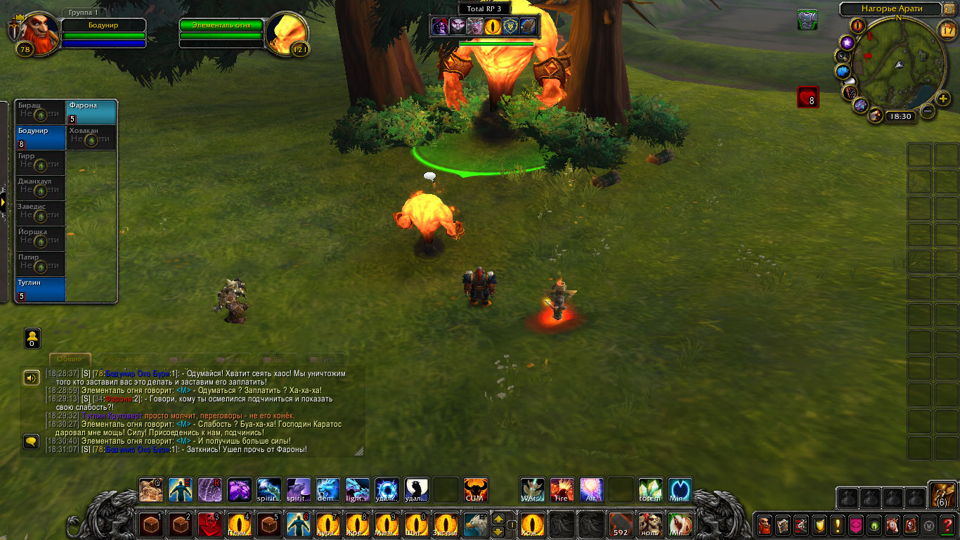 Другие же напали на Туглина и Бодунира, но тем удалось защититься. Бодунир призвал из тотема элементаля огня Фарону дабы тапомогла. Ховакан сумел договориться с одним, привести его в чувство и тот наполнил своей силой его тотем. Оставшийся же элементаль был зол, Фарона пыталась выяснить что стряслось, но тот чувствуя скорую гибель ринулся в толпу шаманов и взорвался, а его остаточная энергия была поглощена тотемами шаманов.