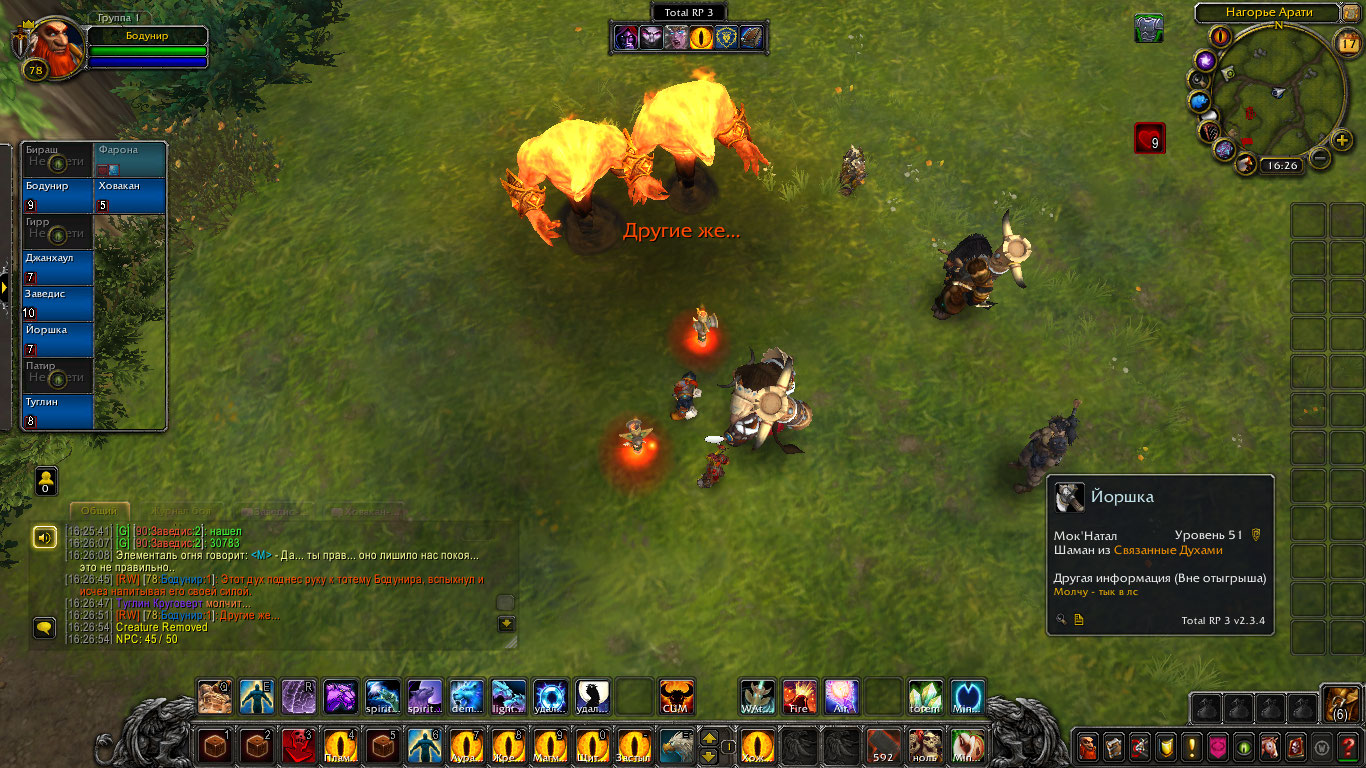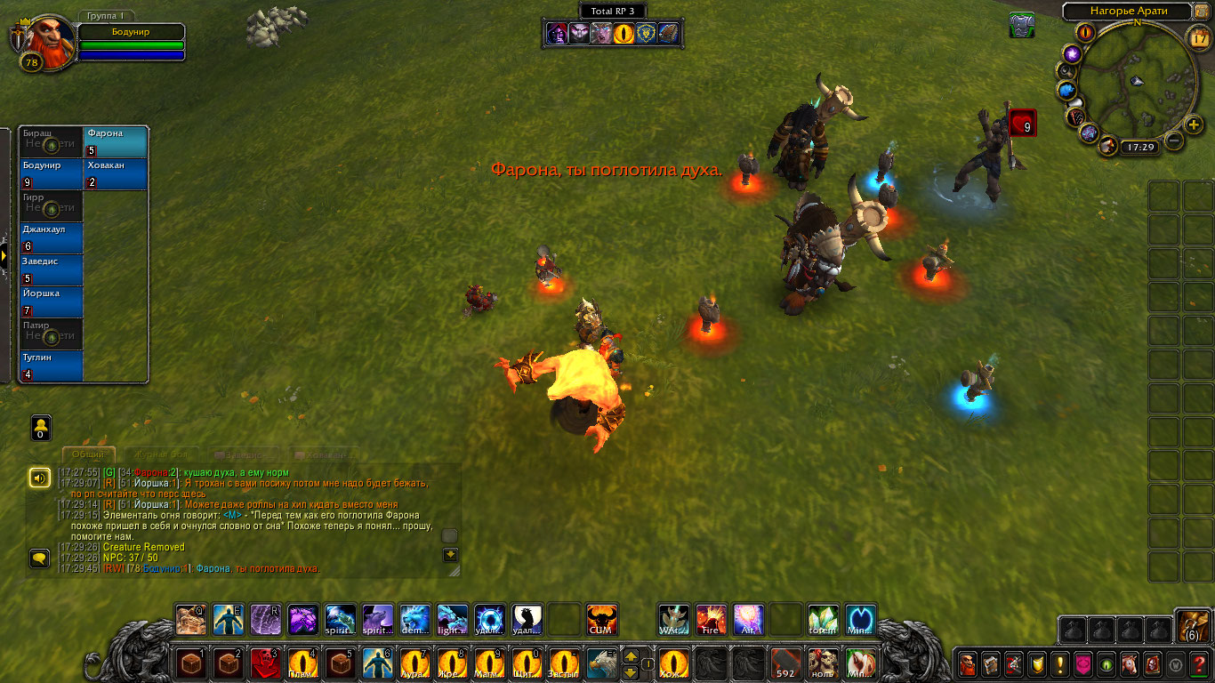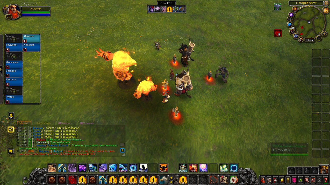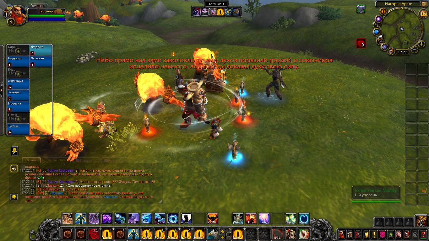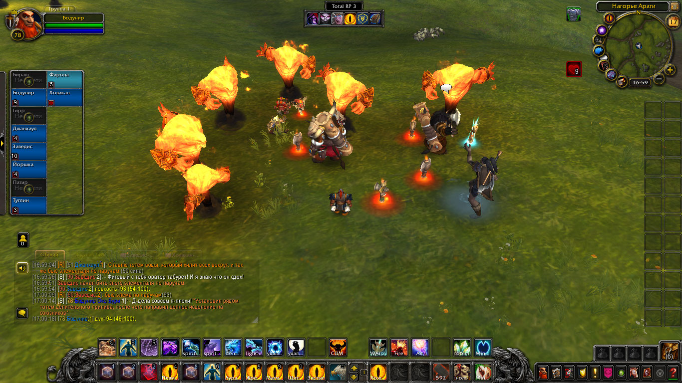 Другие же напали на Туглина и Бодунира, но тем удалось защититься. Бодунир призвал из тотема элементаля огня Фарону дабы тапомогла. Ховакан сумел договориться с одним, привести его в чувство и тот наполнил своей силой его тотем. Оставшийся же элементаль был зол, Фарона пыталась выяснить что стряслось, но тот чувствуя скорую гибель ринулся в толпу шаманов и взорвался, а его остаточная энергия была поглощена тотемами шаманов.