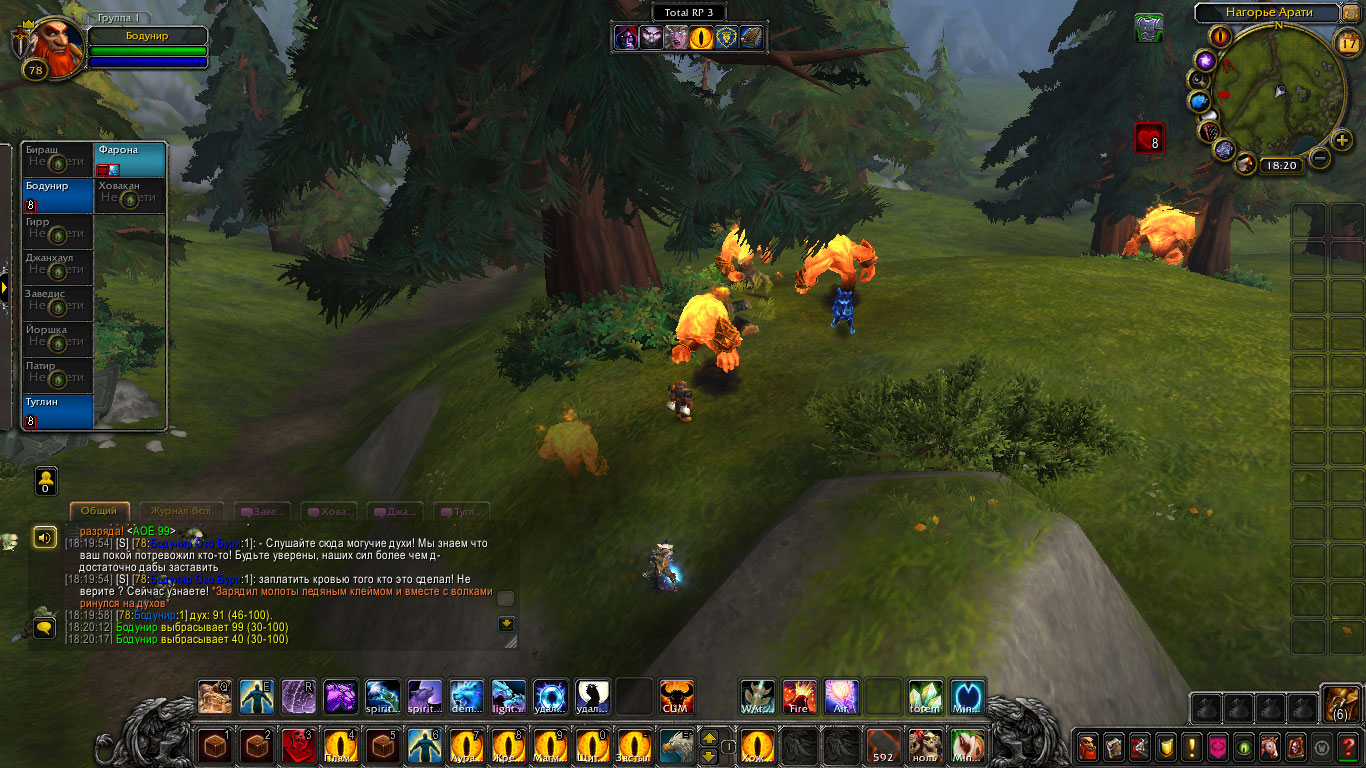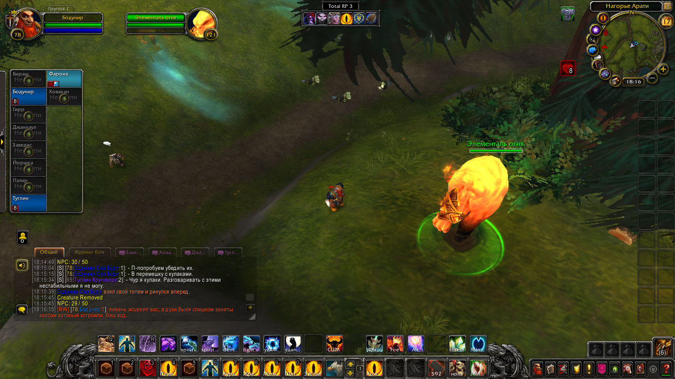 И снова духи заговорили про ошибки каких-то шаманов. Кто-то говорил про какого-то господина. Вопросов становилось все больше и больше, а ответов все не было. Наконец они добрались до последнего элементаля. Он имел внушительные размеры, стоял между двух деревьев, а все вокруг него было выжжено до углей. Бодунир начал было убеждать его что они накажут тех кто это сделал и помогут им, но дух лишь рассмеялся. Стало известно имя его господина — Каратос. По его словам он дал ему силы и предлагал Фароне перейти на его сторону. Та отказалась прислуживать какому-то смертному, но дух лишь рассмеялся замечая что она в том же положении, но его хозяин не смертный в отличии от нее. Он собирался сжечь их всех. Туглин сказал, что эти элементали только трепаться умеют, но дух щелкнул пальцем и гоблина охватило пламя. Но оно практически не вредило ему, но было все равно тревожно. Оно пульсировало будто живое, живое пламя что росло. Это было как будто затишье перед чем-то большим. Будто бомба замедленного действия. Живая бомба. Туглин чувствуя это отбежал от всех остальных и исцелил себя ровно на столько, сколько вреда нанесла бомба при взрыве, но боль никуда не исчезла, ему было очень больно. Дворф, Фарона и призрачные волки сражались с элементалем и в последствии им удалось провести сильную совместную атаку, хоть Бодунира и задело сгустком пламени. Они одолели духа и успели отбежать прежде чем его огонь навредил им. Тотем поглотил часть его сил, другую часть забрала Фарона становясь больше и жарче. Тут к ним пришел элементаль что поблагодарил их. Он все видел и спешил дать зацепку. Он сказал, что им нужно идти на север, к месту силы, там все началось. Дух усилил тотем Бодунира и исчез. После этого шаманы пошли отдыхать.