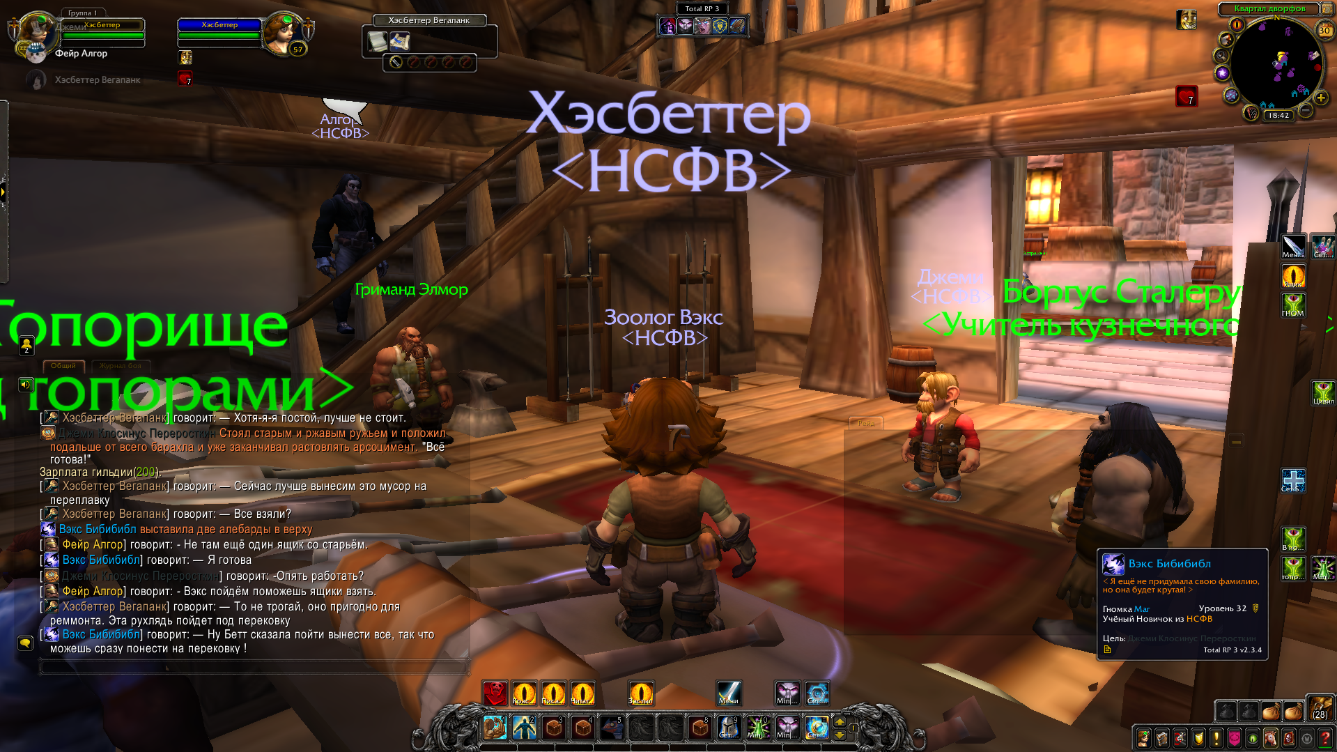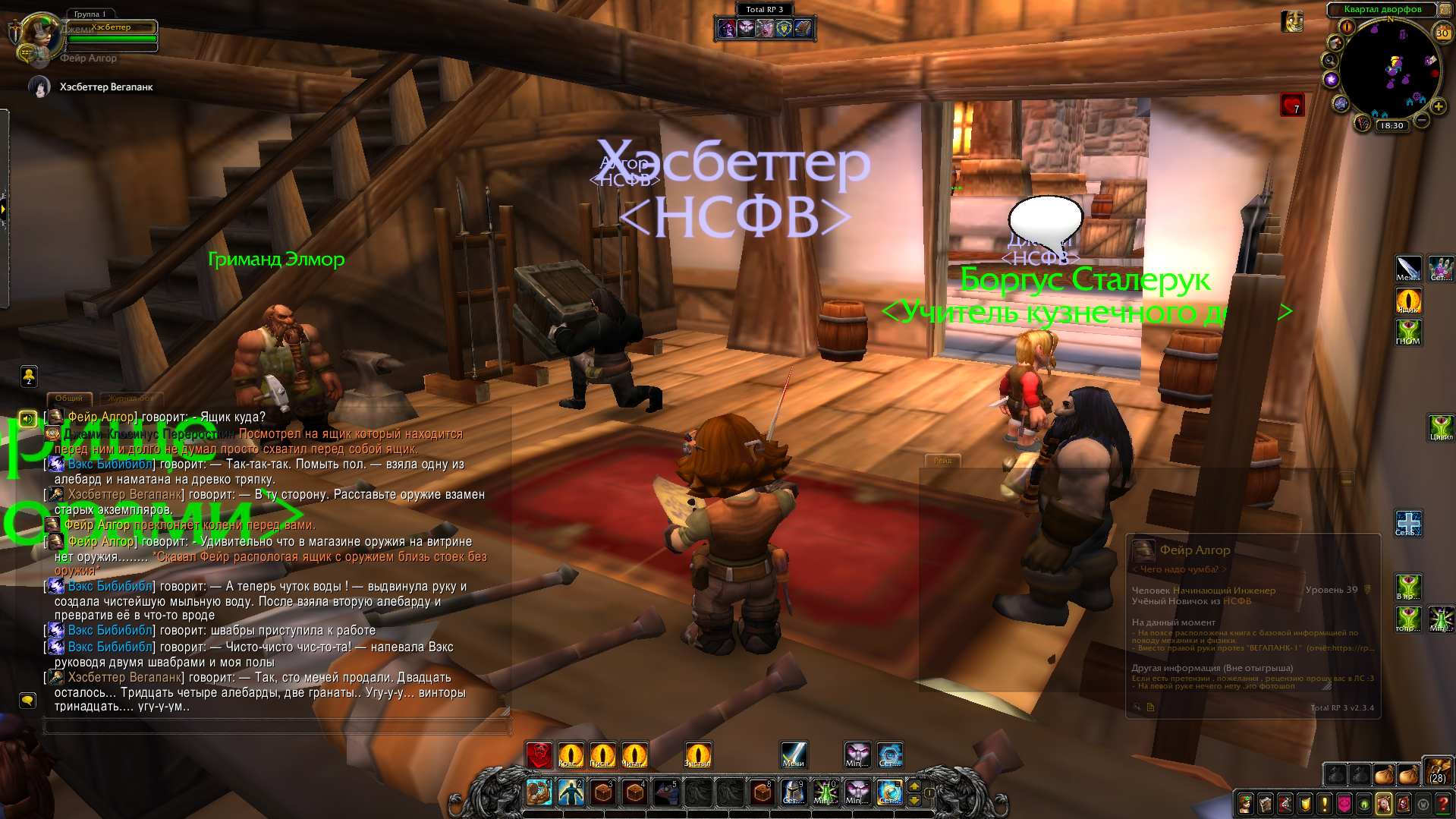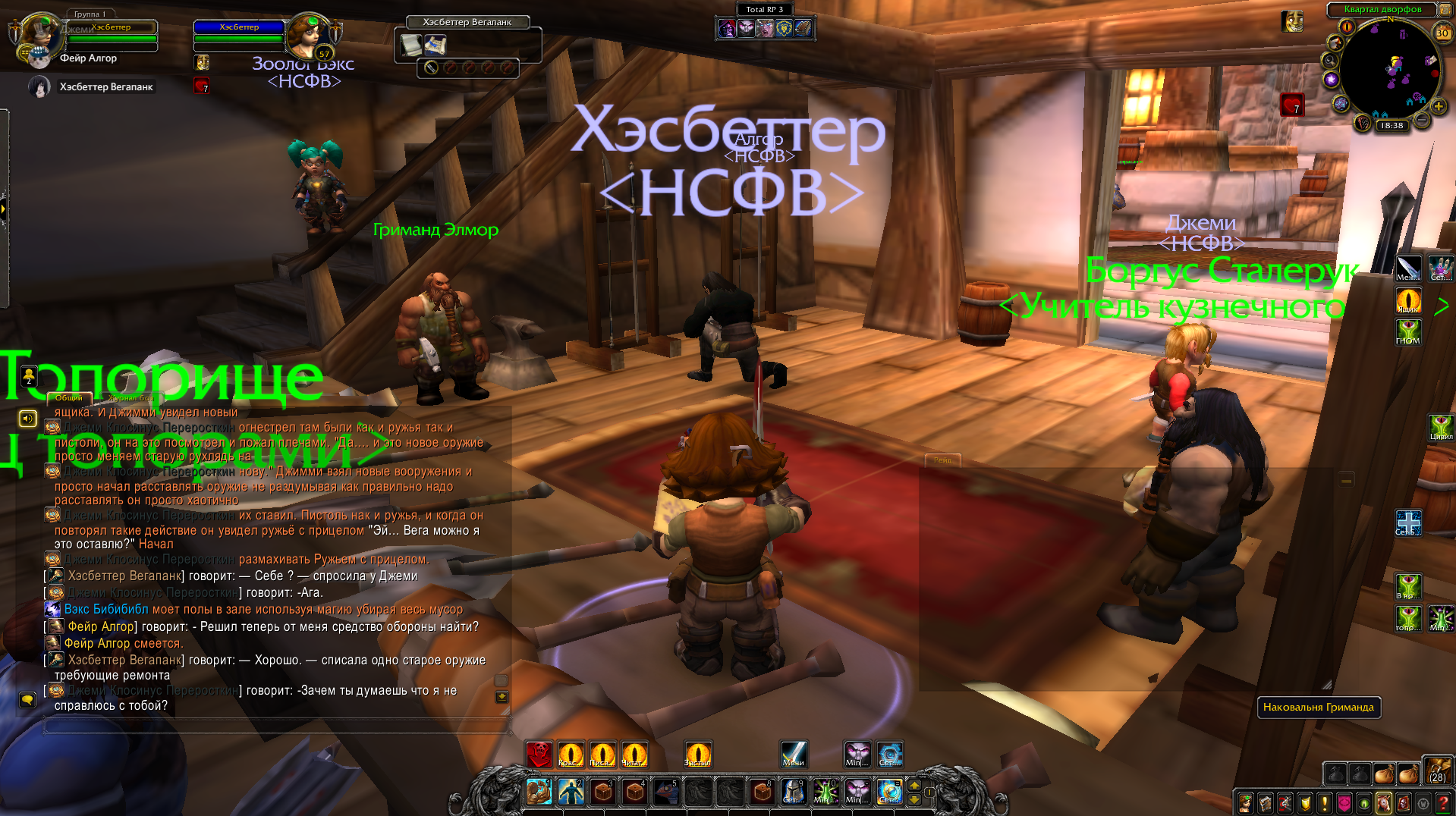 Вскоре после этого объявилась Хэсбеттер и Алгор, а после подоспел и Джеми. Группа немного пообщалась, но так и не смогла точно определить что вызвало проблемы. В конце концов, после небольшой перепалки Вегапанк скомандывала группе начать работу. Все было просто, она должна была провести полную ревизию, Алгор и Джеми выставить новые тавары, а также сложить все старые в отдельный ящик, ну а гномке Вэкс Бибибибл пришлось промыть полы. Делать было нечего и пришлось начать. Вэкс ловко превратила две алебарды в импровизированные швабры намотав на древко пару тряпок и с помощью только ей известных чар создала мыльную воду которой начала мыть полы с второго этажа. В это время Алго и Джеми успешно взяли ящики и принеся в низ начла переставлять все старое на что-то новое. Все это время Хэсбеттер Вегапанк сверяла записи, проверяла не пропала ли что, убеждалась в том, что данные сходятся. В какой-то момент Джеми попроси у неё забрать один из старых экземпляров которые подлежали перековки, на что Хэсбеттер ответила согласием, лишь списав пистоль. Когда уборка и ревизия была закончена, Вегапанк попросила всех донести устаревшие, ржавые ветринные образцы отнести на кузню в центре Квартала Дворфов. Повстречавшись там с Терумом, гномы и человек любезно отдали ему свой хлам, а позже тот перекует все это в поистине достойное вооружение или доспехи