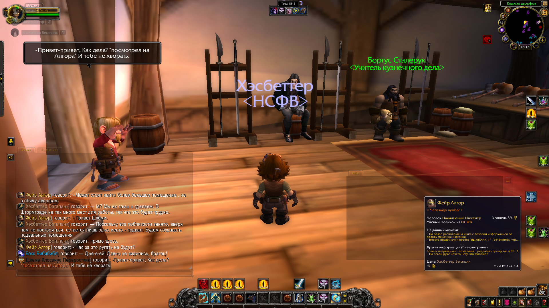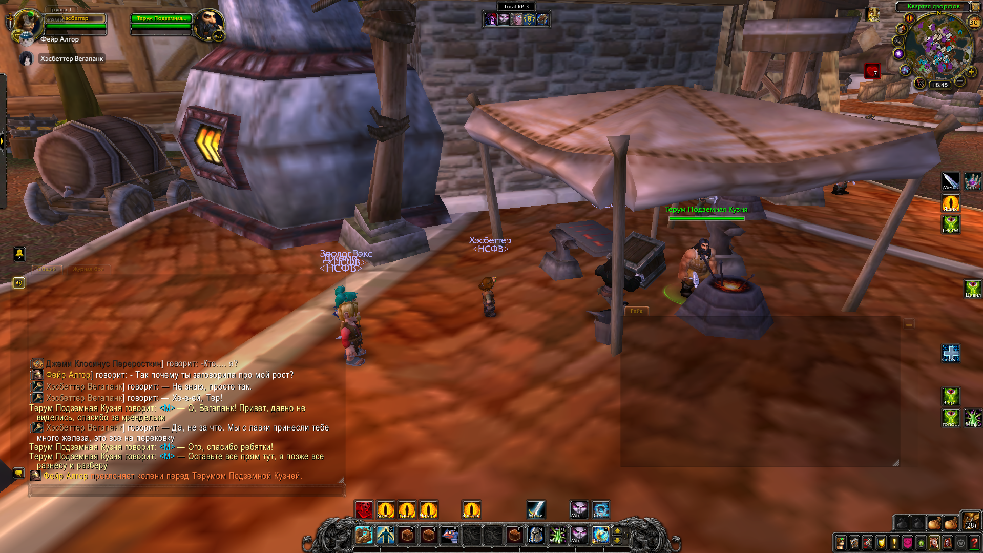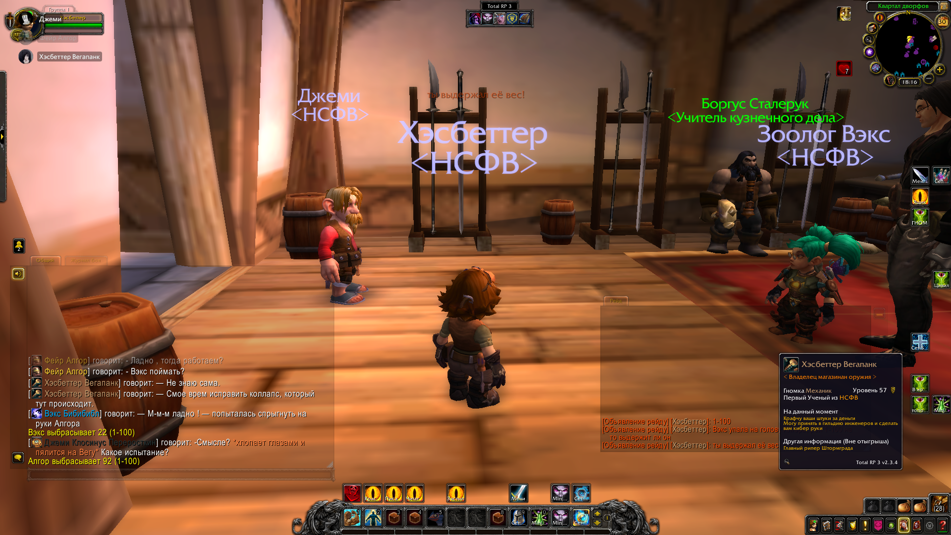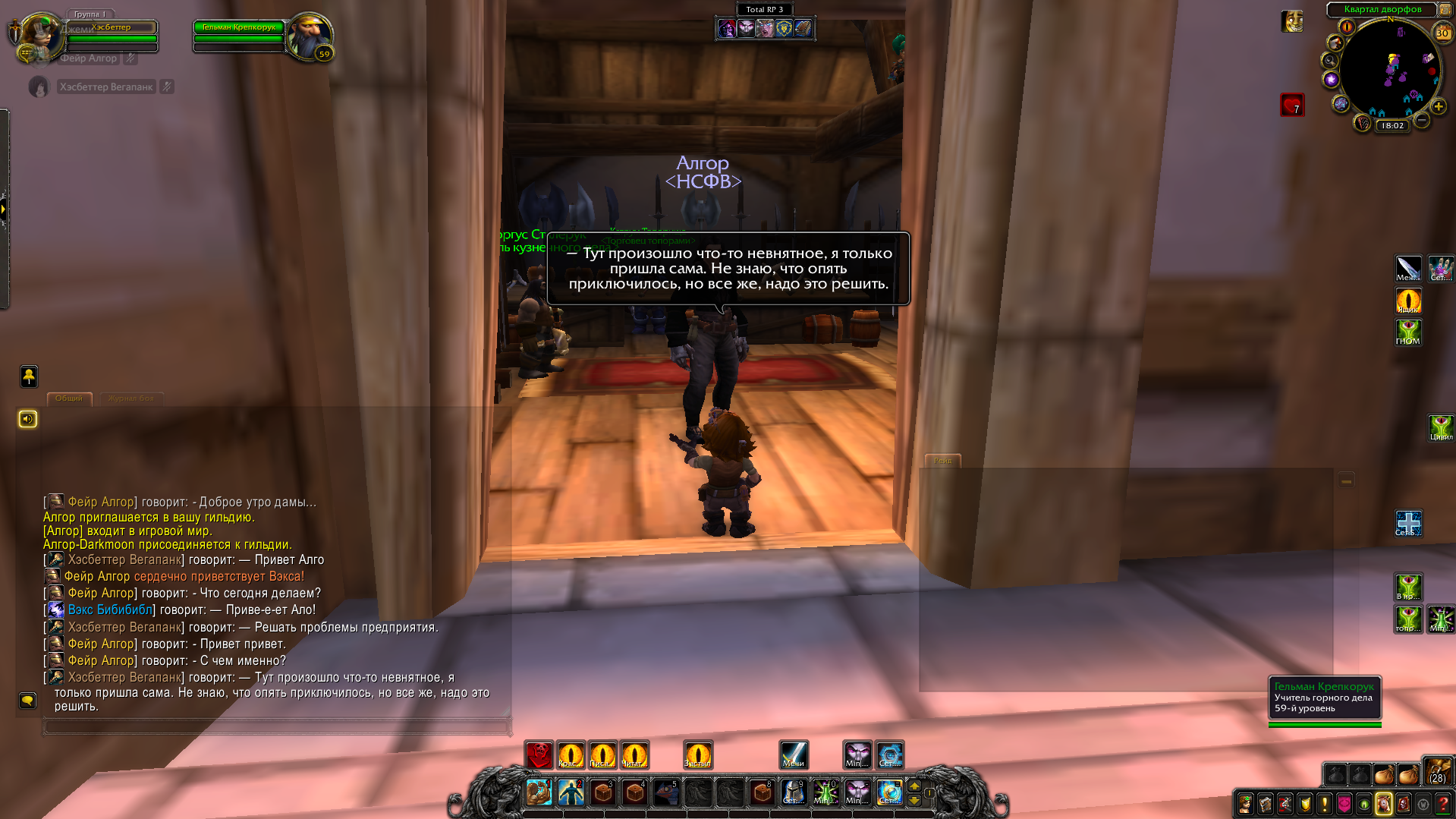 Вскоре после этого объявилась Хэсбеттер и Алгор, а после подоспел и Джеми. Группа немного пообщалась, но так и не смогла точно определить что вызвало проблемы. В конце концов, после небольшой перепалки Вегапанк скомандывала группе начать работу. Все было просто, она должна была провести полную ревизию, Алгор и Джеми выставить новые тавары, а также сложить все старые в отдельный ящик, ну а гномке Вэкс Бибибибл пришлось промыть полы. Делать было нечего и пришлось начать. Вэкс ловко превратила две алебарды в импровизированные швабры намотав на древко пару тряпок и с помощью только ей известных чар создала мыльную воду которой начала мыть полы с второго этажа. В это время Алго и Джеми успешно взяли ящики и принеся в низ начла переставлять все старое на что-то новое. Все это время Хэсбеттер Вегапанк сверяла записи, проверяла не пропала ли что, убеждалась в том, что данные сходятся. В какой-то момент Джеми попроси у неё забрать один из старых экземпляров которые подлежали перековки, на что Хэсбеттер ответила согласием, лишь списав пистоль. Когда уборка и ревизия была закончена, Вегапанк попросила всех донести устаревшие, ржавые ветринные образцы отнести на кузню в центре Квартала Дворфов. Повстречавшись там с Терумом, гномы и человек любезно отдали ему свой хлам, а позже тот перекует все это в поистине достойное вооружение или доспехи