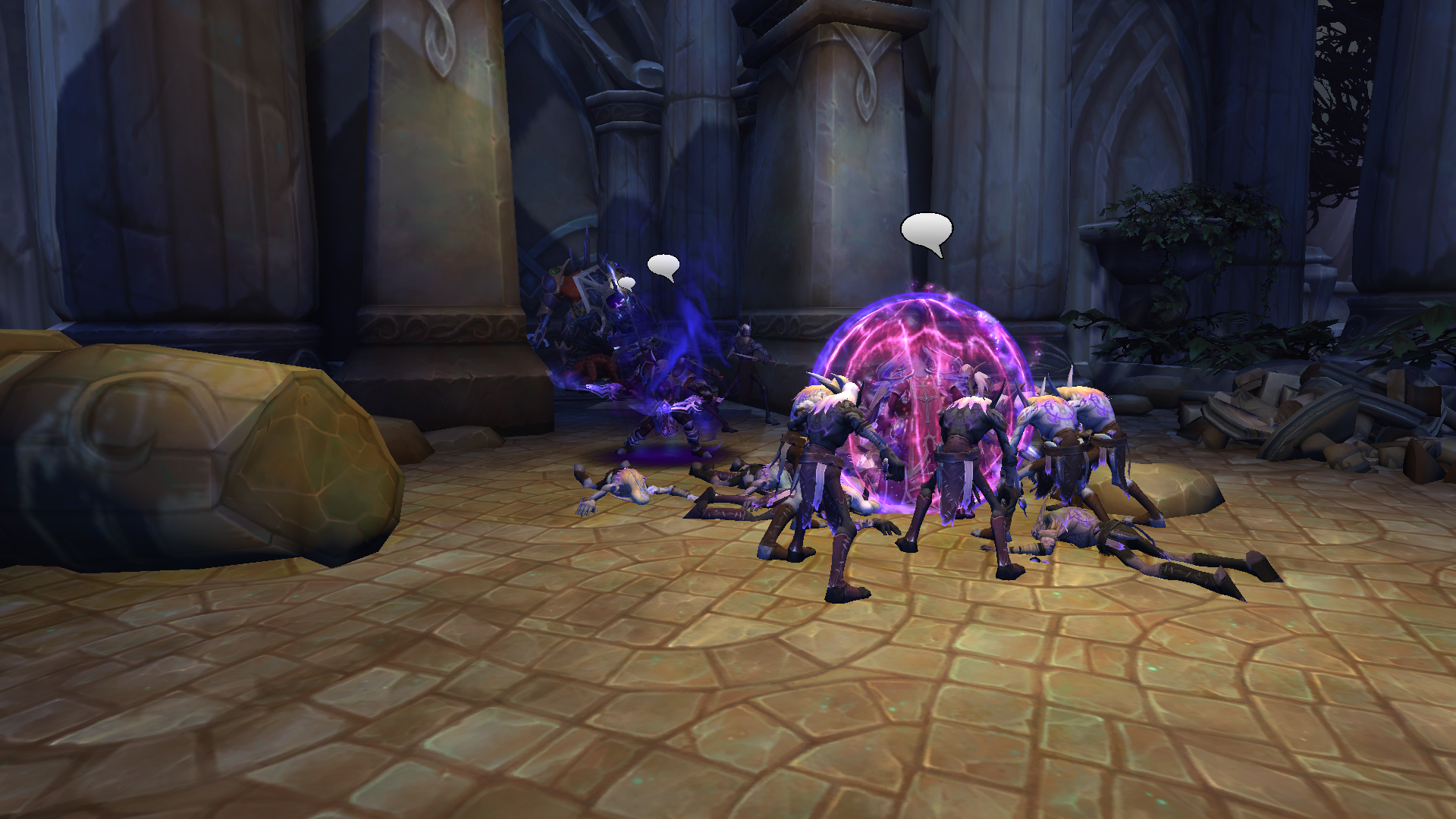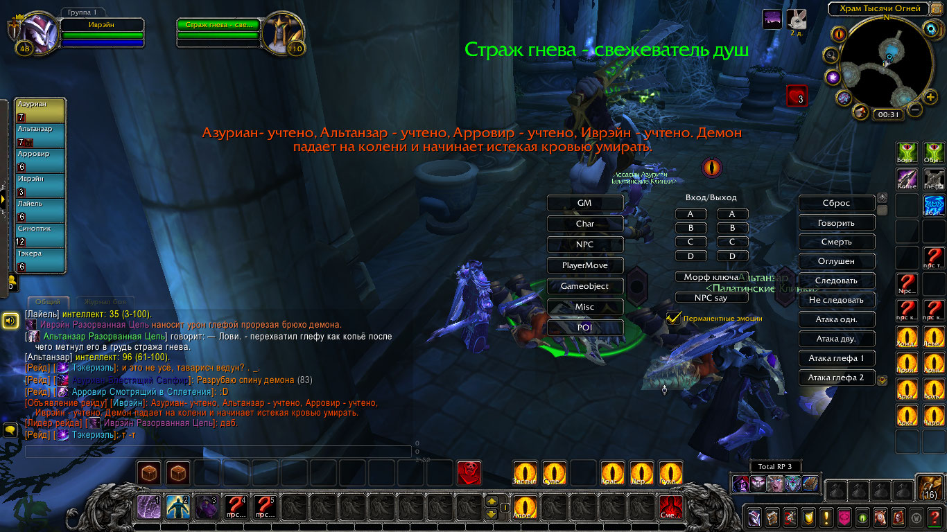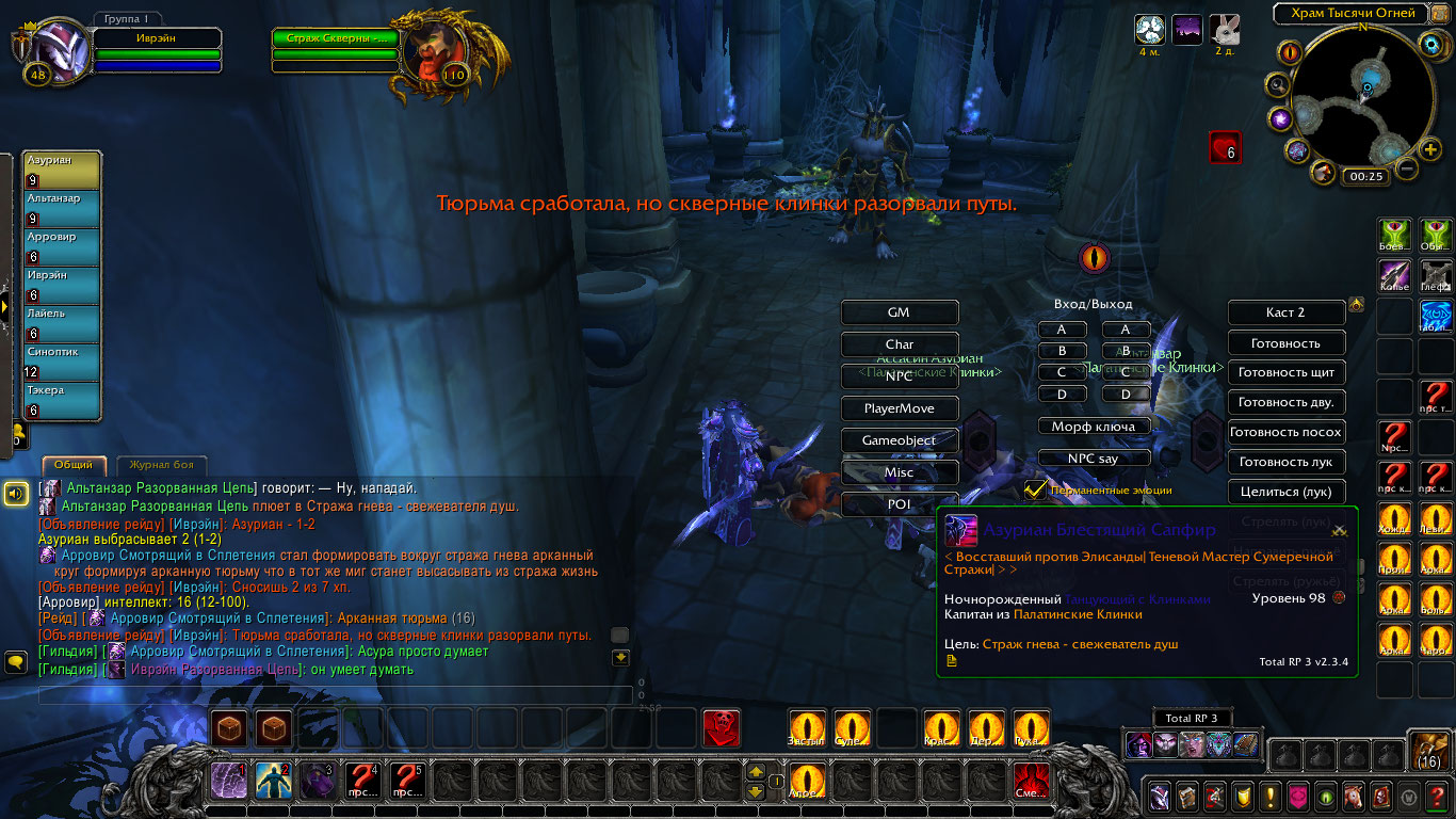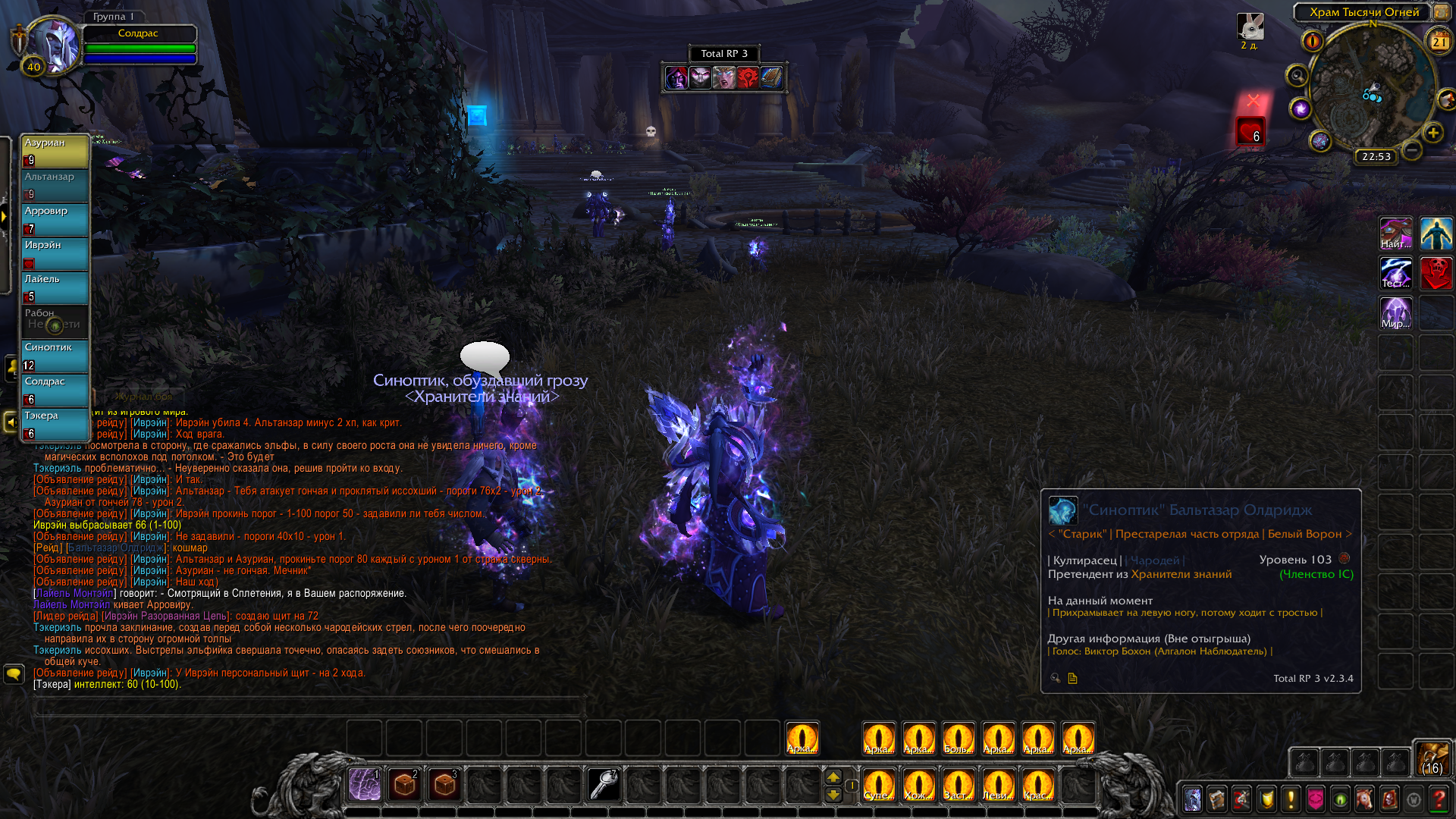Через мгновенье бой начался неожиданной атакой авангарда группы что принялся методично вырезать пушечное мясо виде иссохших и гончей скверны которые находились ближе всего к ним. Противники, пытаясь ответить на атаку воинов «Палатинских Клинков» стали врезаться в множество магических снарядов заклинателей что яростно не давали ни секунды покоя своему врагу. Тем временем остальные демонические отродья среагировав на шум понеслись в его сторону предвкушая ощутить вкус яростной битвы и сладкой крови, однако заместо этого они получили дисциплинированный отпор от своих врагов, которые быстро расправились со всеми, кто находился снаружи. Медленно осмотрев поле боя и добив ели живых иссохших что валялись на земле группа направилась внутрь храма ощущая дурное предчувствие во время спуска. Оно не оказалось ошибочным и спустившись по лестнице вниз ночнорождённые со своими союзниками обнаружили десятки стражей скверны которыми командовал самый огромный из них. Рывком демоны побежали в сторону незваных гостей что принялись держать строй и пока авангард отвлекал врага на себя заклинатели сзади выпускали в их сторону множество заклятий, которые в мгновенье лишали жизни противника. Даже их командир долго не смог выстоять против мощи группы и пал следом за своими подчиненными давая «Палатинским Клинкам» вместе с Хранителями Знаний долгожданный временный перерыв.