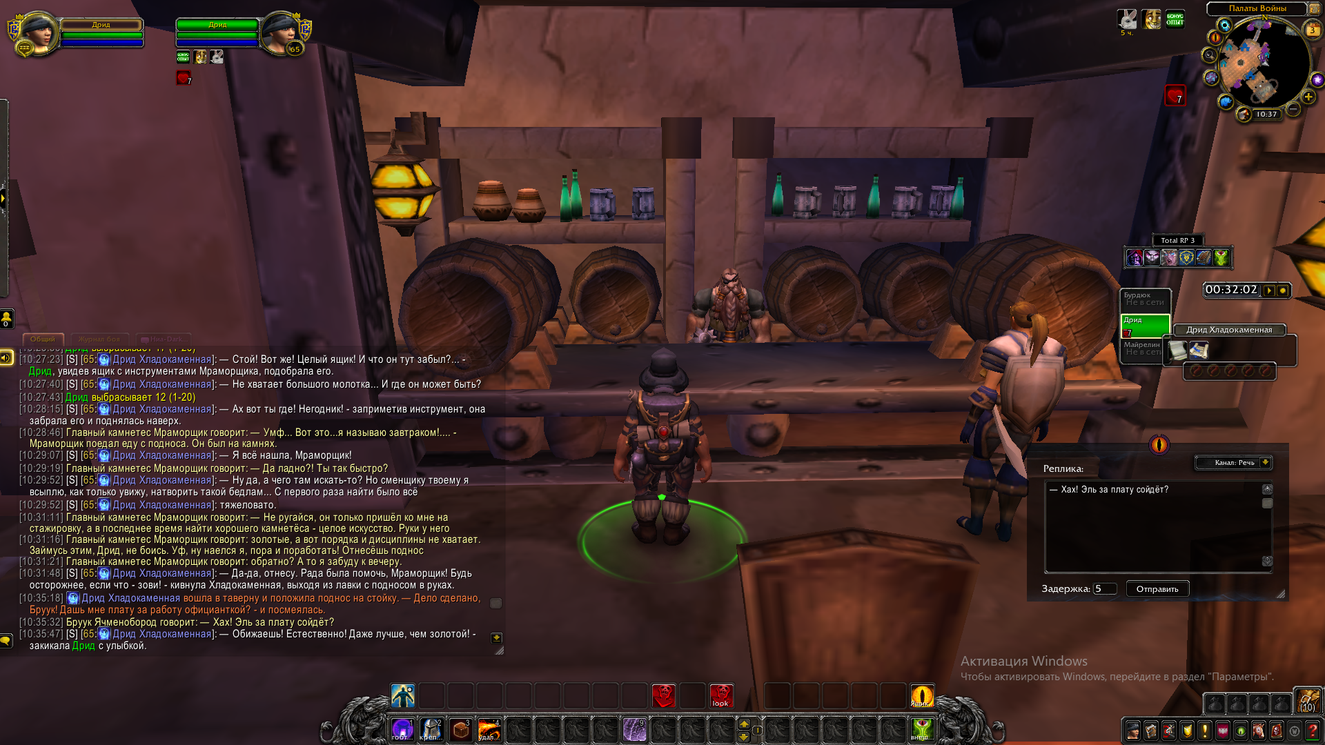 Очередная неделя подходила к концу, и Дрид решила проверить, как работают её любимые таверны. Начала она с Наковальни и Бочки. Там, как ни странно, всё было прекрасно, однако кабатчик дал важную наводку на Бруука. Дескать, старый дворф уже давно чудит, и за ним нужен глаз да глаз. Хладокаменная не могла не согласиться с этим, поэтому распрощалась со всеми присутствующими и зашагала в Палаты Войны.