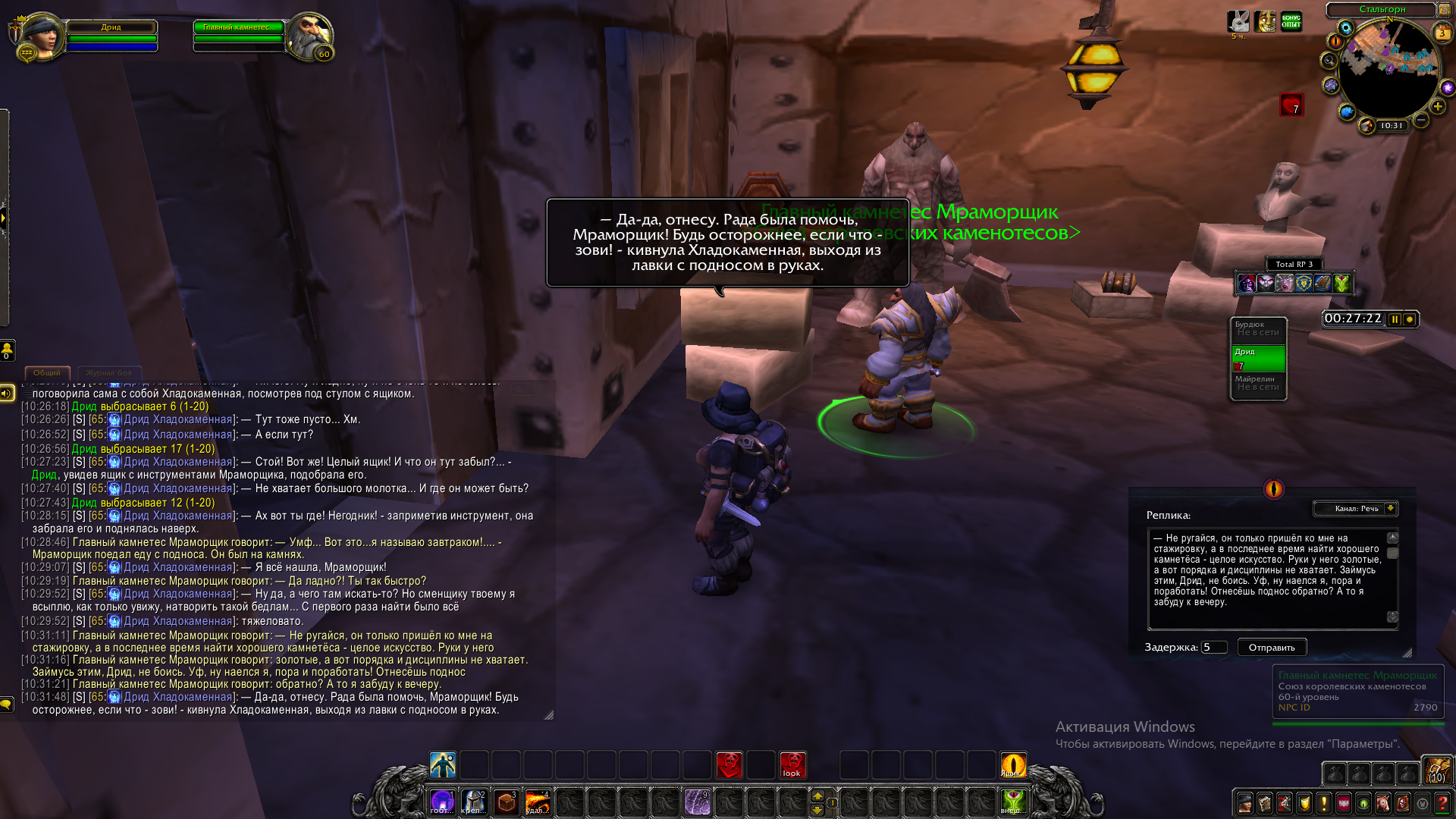 Ролевые итоги: Дрид проверила работу двух своих таверн, после чего отнесла Мраморщику заказанный у Бруука завтрак. У Камнетёса дворфийка разобралась в беспорядке, нашла золотую монетку и привела в должное состояние все инструменты, после чего вернула в таверну Бруука поднос.